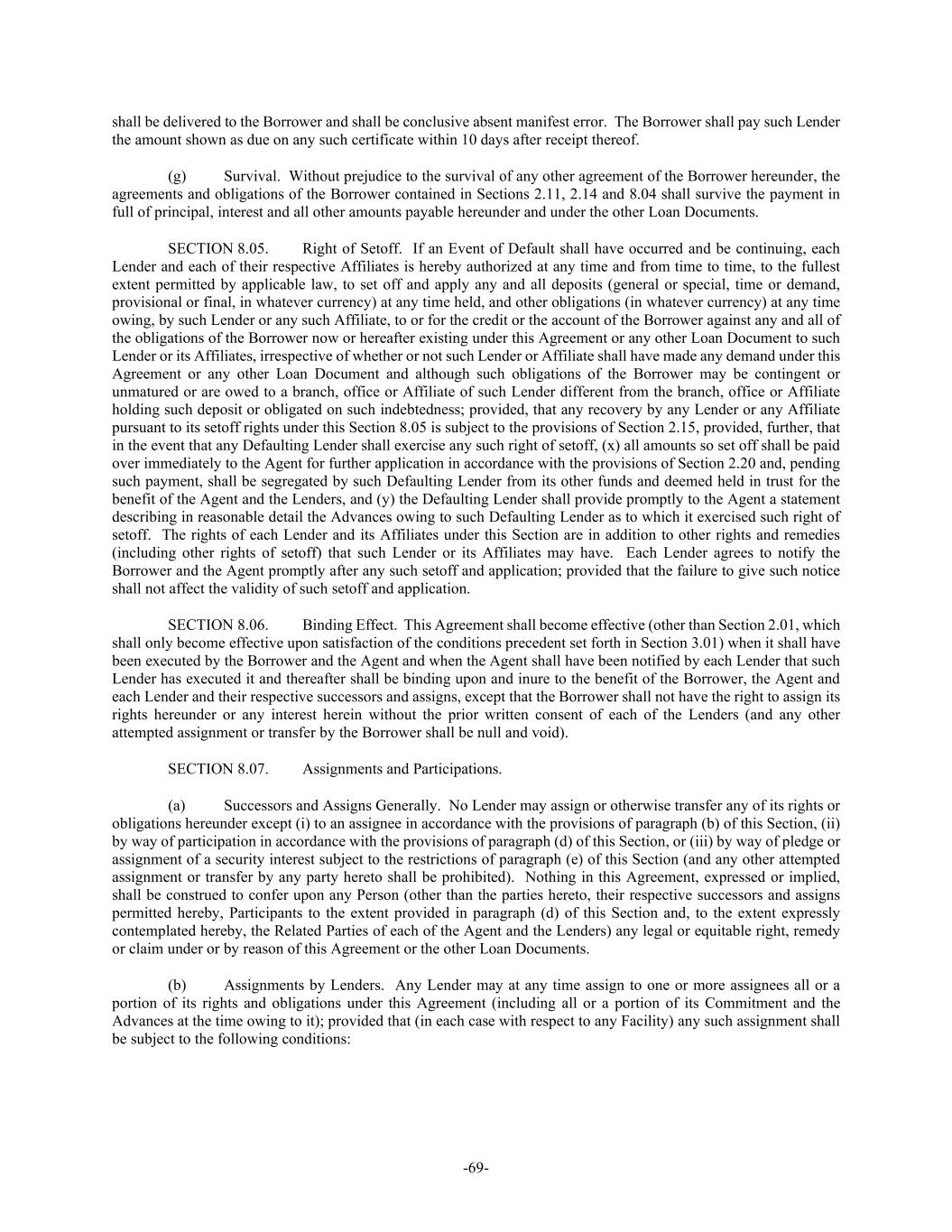 -69- shall be delivered to the Borrower and shall be conclusive absent manifest error. The Borrower shall pay such Lender the amount shown as due on any such certificate within 10 days after receipt thereof. (g) Survival. Without prejudice to the survival of any other agreement of the Borrower hereunder, the agreements and obligations of the Borrower contained in Sections 2.11, 2.14 and 8.04 shall survive the payment in full of principal, interest and all other amounts payable hereunder and under the other Loan Documents. SECTION 8.05. Right of Setoff. If an Event of Default shall have occurred and be continuing, each Lender and each of their respective Affiliates is hereby authorized at any time and from time to time, to the fullest extent permitted by applicable law, to set off and apply any and all deposits (general or special, time or demand, provisional or final, in whatever currency) at any time held, and other obligations (in whatever currency) at any time owing, by such Lender or any such Affiliate, to or for the credit or the account of the Borrower against any and all of the obligations of the Borrower now or hereafter existing under this Agreement or any other Loan Document to such Lender or its Affiliates, irrespective of whether or not such Lender or Affiliate shall have made any demand under this Agreement or any other Loan Document and although such obligations of the Borrower may be contingent or unmatured or are owed to a branch, office or Affiliate of such Lender different from the branch, office or Affiliate holding such deposit or obligated on such indebtedness; provided, that any recovery by any Lender or any Affiliate pursuant to its setoff rights under this Section 8.05 is subject to the provisions of Section 2.15, provided, further, that in the event that any Defaulting Lender shall exercise any such right of setoff, (x) all amounts so set off shall be paid over immediately to the Agent for further application in accordance with the provisions of Section 2.20 and, pending such payment, shall be segregated by such Defaulting Lender from its other funds and deemed held in trust for the benefit of the Agent and the Lenders, and (y) the Defaulting Lender shall provide promptly to the Agent a statement describing in reasonable detail the Advances owing to such Defaulting Lender as to which it exercised such right of setoff. The rights of each Lender and its Affiliates under this Section are in addition to other rights and remedies (including other rights of setoff) that such Lender or its Affiliates may have. Each Lender agrees to notify the Borrower and the Agent promptly after any such setoff and application; provided that the failure to give such notice shall not affect the validity of such setoff and application. SECTION 8.06. Binding Effect. This Agreement shall become effective (other than Section 2.01, which shall only become effective upon satisfaction of the conditions precedent set forth in Section 3.01) when it shall have been executed by the Borrower and the Agent and when the Agent shall have been notified by each Lender that such Lender has executed it and thereafter shall be binding upon and inure to the benefit of the Borrower, the Agent and each Lender and their respective successors and assigns, except that the Borrower shall not have the right to assign its rights hereunder or any interest herein without the prior written consent of each of the Lenders (and any other attempted assignment or transfer by the Borrower shall be null and void). SECTION 8.07. Assignments and Participations. (a) Successors and Assigns Generally. No Lender may assign or otherwise transfer any of its rights or obligations hereunder except (i) to an assignee in accordance with the provisions of paragraph (b) of this Section, (ii) by way of participation in accordance with the provisions of paragraph (d) of this Section, or (iii) by way of pledge or assignment of a security interest subject to the restrictions of paragraph (e) of this Section (and any other attempted assignment or transfer by any party hereto shall be prohibited). Nothing in this Agreement, expressed or implied, shall be construed to confer upon any Person (other than the parties hereto, their respective successors and assigns permitted hereby, Participants to the extent provided in paragraph (d) of this Section and, to the extent expressly contemplated hereby, the Related Parties of each of the Agent and the Lenders) any legal or equitable right, remedy or claim under or by reason of this Agreement or the other Loan Documents. (b) Assignments by Lenders. Any Lender may at any time assign to one or more assignees all or a portion of its rights and obligations under this Agreement (including all or a portion of its Commitment and the Advances at the time owing to it); provided that (in each case with respect to any Facility) any such assignment shall be subject to the following conditions: