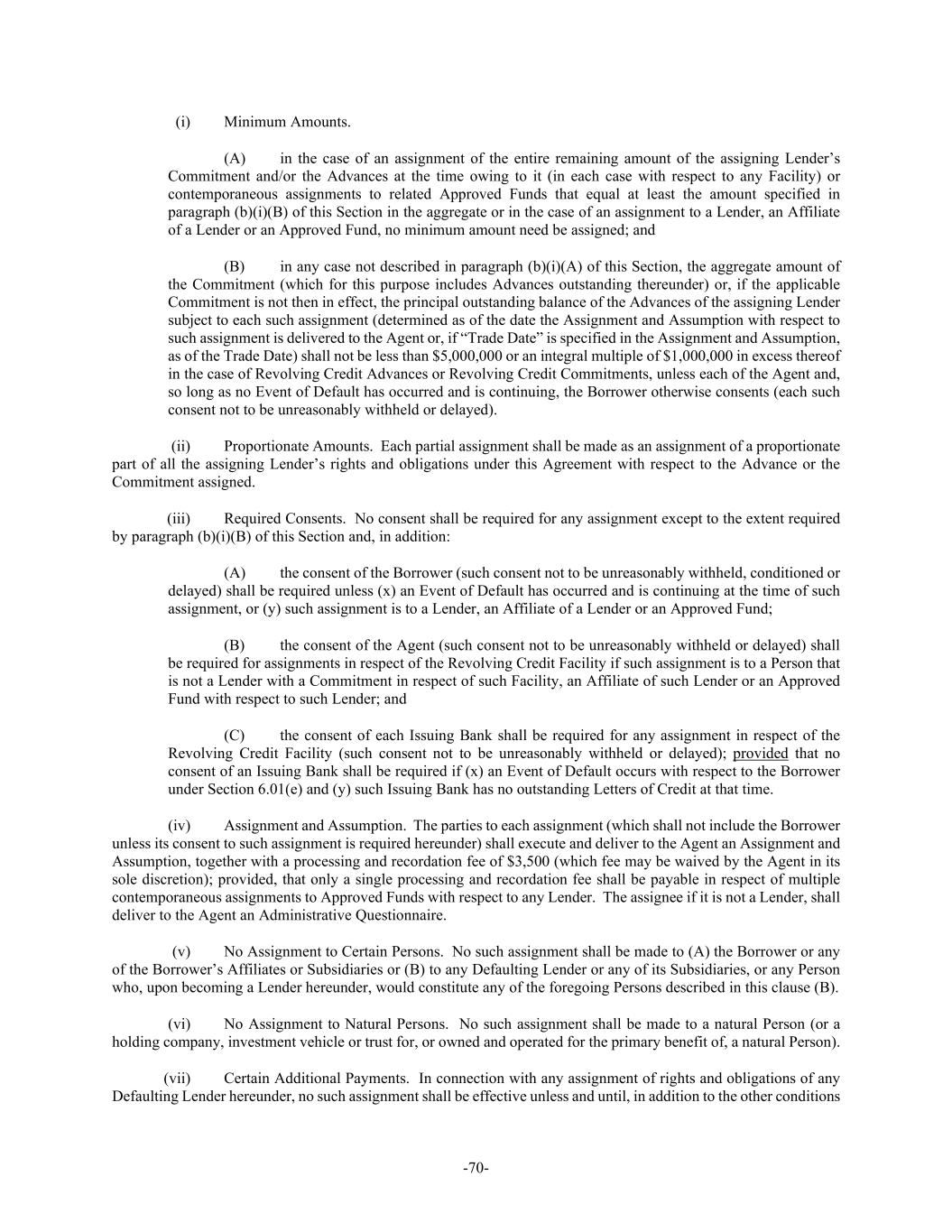 -70- (i) Minimum Amounts. (A) in the case of an assignment of the entire remaining amount of the assigning Lender’s Commitment and/or the Advances at the time owing to it (in each case with respect to any Facility) or contemporaneous assignments to related Approved Funds that equal at least the amount specified in paragraph (b)(i)(B) of this Section in the aggregate or in the case of an assignment to a Lender, an Affiliate of a Lender or an Approved Fund, no minimum amount need be assigned; and (B) in any case not described in paragraph (b)(i)(A) of this Section, the aggregate amount of the Commitment (which for this purpose includes Advances outstanding thereunder) or, if the applicable Commitment is not then in effect, the principal outstanding balance of the Advances of the assigning Lender subject to each such assignment (determined as of the date the Assignment and Assumption with respect to such assignment is delivered to the Agent or, if “Trade Date” is specified in the Assignment and Assumption, as of the Trade Date) shall not be less than $5,000,000 or an integral multiple of $1,000,000 in excess thereof in the case of Revolving Credit Advances or Revolving Credit Commitments, unless each of the Agent and, so long as no Event of Default has occurred and is continuing, the Borrower otherwise consents (each such consent not to be unreasonably withheld or delayed). (ii) Proportionate Amounts. Each partial assignment shall be made as an assignment of a proportionate part of all the assigning Lender’s rights and obligations under this Agreement with respect to the Advance or the Commitment assigned. (iii) Required Consents. No consent shall be required for any assignment except to the extent required by paragraph (b)(i)(B) of this Section and, in addition: (A) the consent of the Borrower (such consent not to be unreasonably withheld, conditioned or delayed) shall be required unless (x) an Event of Default has occurred and is continuing at the time of such assignment, or (y) such assignment is to a Lender, an Affiliate of a Lender or an Approved Fund; (B) the consent of the Agent (such consent not to be unreasonably withheld or delayed) shall be required for assignments in respect of the Revolving Credit Facility if such assignment is to a Person that is not a Lender with a Commitment in respect of such Facility, an Affiliate of such Lender or an Approved Fund with respect to such Lender; and (C) the consent of each Issuing Bank shall be required for any assignment in respect of the Revolving Credit Facility (such consent not to be unreasonably withheld or delayed); provided that no consent of an Issuing Bank shall be required if (x) an Event of Default occurs with respect to the Borrower under Section 6.01(e) and (y) such Issuing Bank has no outstanding Letters of Credit at that time. (iv) Assignment and Assumption. The parties to each assignment (which shall not include the Borrower unless its consent to such assignment is required hereunder) shall execute and deliver to the Agent an Assignment and Assumption, together with a processing and recordation fee of $3,500 (which fee may be waived by the Agent in its sole discretion); provided, that only a single processing and recordation fee shall be payable in respect of multiple contemporaneous assignments to Approved Funds with respect to any Lender. The assignee if it is not a Lender, shall deliver to the Agent an Administrative Questionnaire. (v) No Assignment to Certain Persons. No such assignment shall be made to (A) the Borrower or any of the Borrower’s Affiliates or Subsidiaries or (B) to any Defaulting Lender or any of its Subsidiaries, or any Person who, upon becoming a Lender hereunder, would constitute any of the foregoing Persons described in this clause (B). (vi) No Assignment to Natural Persons. No such assignment shall be made to a natural Person (or a holding company, investment vehicle or trust for, or owned and operated for the primary benefit of, a natural Person). (vii) Certain Additional Payments. In connection with any assignment of rights and obligations of any Defaulting Lender hereunder, no such assignment shall be effective unless and until, in addition to the other conditions