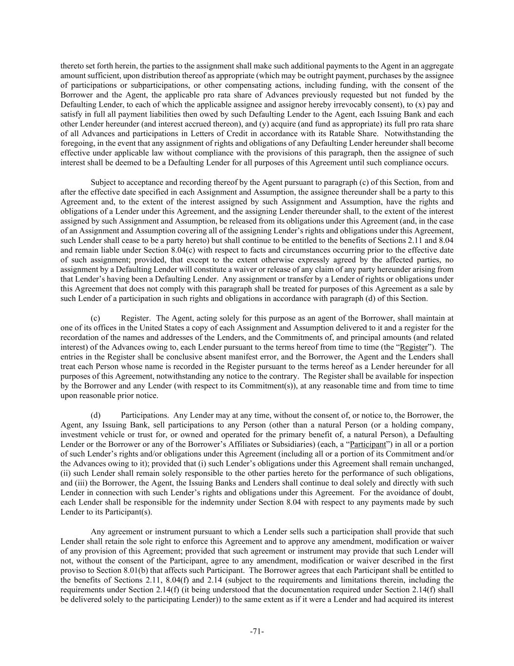 -71- thereto set forth herein, the parties to the assignment shall make such additional payments to the Agent in an aggregate amount sufficient, upon distribution thereof as appropriate (which may be outright payment, purchases by the assignee of participations or subparticipations, or other compensating actions, including funding, with the consent of the Borrower and the Agent, the applicable pro rata share of Advances previously requested but not funded by the Defaulting Lender, to each of which the applicable assignee and assignor hereby irrevocably consent), to (x) pay and satisfy in full all payment liabilities then owed by such Defaulting Lender to the Agent, each Issuing Bank and each other Lender hereunder (and interest accrued thereon), and (y) acquire (and fund as appropriate) its full pro rata share of all Advances and participations in Letters of Credit in accordance with its Ratable Share. Notwithstanding the foregoing, in the event that any assignment of rights and obligations of any Defaulting Lender hereunder shall become effective under applicable law without compliance with the provisions of this paragraph, then the assignee of such interest shall be deemed to be a Defaulting Lender for all purposes of this Agreement until such compliance occurs. Subject to acceptance and recording thereof by the Agent pursuant to paragraph (c) of this Section, from and after the effective date specified in each Assignment and Assumption, the assignee thereunder shall be a party to this Agreement and, to the extent of the interest assigned by such Assignment and Assumption, have the rights and obligations of a Lender under this Agreement, and the assigning Lender thereunder shall, to the extent of the interest assigned by such Assignment and Assumption, be released from its obligations under this Agreement (and, in the case of an Assignment and Assumption covering all of the assigning Lender’s rights and obligations under this Agreement, such Lender shall cease to be a party hereto) but shall continue to be entitled to the benefits of Sections 2.11 and 8.04 and remain liable under Section 8.04(c) with respect to facts and circumstances occurring prior to the effective date of such assignment; provided, that except to the extent otherwise expressly agreed by the affected parties, no assignment by a Defaulting Lender will constitute a waiver or release of any claim of any party hereunder arising from that Lender’s having been a Defaulting Lender. Any assignment or transfer by a Lender of rights or obligations under this Agreement that does not comply with this paragraph shall be treated for purposes of this Agreement as a sale by such Lender of a participation in such rights and obligations in accordance with paragraph (d) of this Section. (c) Register. The Agent, acting solely for this purpose as an agent of the Borrower, shall maintain at one of its offices in the United States a copy of each Assignment and Assumption delivered to it and a register for the recordation of the names and addresses of the Lenders, and the Commitments of, and principal amounts (and related interest) of the Advances owing to, each Lender pursuant to the terms hereof from time to time (the “Register”). The entries in the Register shall be conclusive absent manifest error, and the Borrower, the Agent and the Lenders shall treat each Person whose name is recorded in the Register pursuant to the terms hereof as a Lender hereunder for all purposes of this Agreement, notwithstanding any notice to the contrary. The Register shall be available for inspection by the Borrower and any Lender (with respect to its Commitment(s)), at any reasonable time and from time to time upon reasonable prior notice. (d) Participations. Any Lender may at any time, without the consent of, or notice to, the Borrower, the Agent, any Issuing Bank, sell participations to any Person (other than a natural Person (or a holding company, investment vehicle or trust for, or owned and operated for the primary benefit of, a natural Person), a Defaulting Lender or the Borrower or any of the Borrower’s Affiliates or Subsidiaries) (each, a “Participant”) in all or a portion of such Lender’s rights and/or obligations under this Agreement (including all or a portion of its Commitment and/or the Advances owing to it); provided that (i) such Lender’s obligations under this Agreement shall remain unchanged, (ii) such Lender shall remain solely responsible to the other parties hereto for the performance of such obligations, and (iii) the Borrower, the Agent, the Issuing Banks and Lenders shall continue to deal solely and directly with such Lender in connection with such Lender’s rights and obligations under this Agreement. For the avoidance of doubt, each Lender shall be responsible for the indemnity under Section 8.04 with respect to any payments made by such Lender to its Participant(s). Any agreement or instrument pursuant to which a Lender sells such a participation shall provide that such Lender shall retain the sole right to enforce this Agreement and to approve any amendment, modification or waiver of any provision of this Agreement; provided that such agreement or instrument may provide that such Lender will not, without the consent of the Participant, agree to any amendment, modification or waiver described in the first proviso to Section 8.01(b) that affects such Participant. The Borrower agrees that each Participant shall be entitled to the benefits of Sections 2.11, 8.04(f) and 2.14 (subject to the requirements and limitations therein, including the requirements under Section 2.14(f) (it being understood that the documentation required under Section 2.14(f) shall be delivered solely to the participating Lender)) to the same extent as if it were a Lender and had acquired its interest