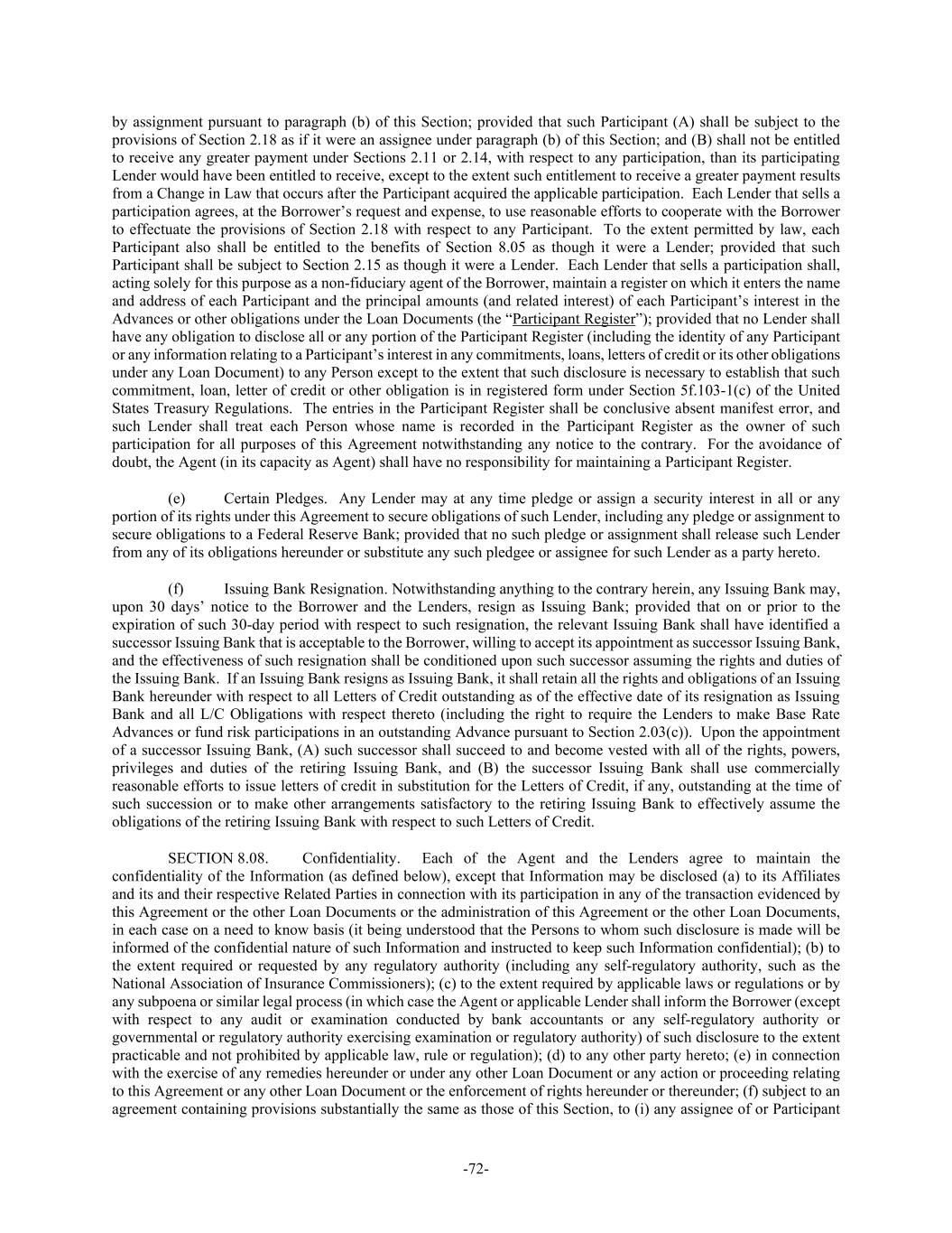 -72- by assignment pursuant to paragraph (b) of this Section; provided that such Participant (A) shall be subject to the provisions of Section 2.18 as if it were an assignee under paragraph (b) of this Section; and (B) shall not be entitled to receive any greater payment under Sections 2.11 or 2.14, with respect to any participation, than its participating Lender would have been entitled to receive, except to the extent such entitlement to receive a greater payment results from a Change in Law that occurs after the Participant acquired the applicable participation. Each Lender that sells a participation agrees, at the Borrower’s request and expense, to use reasonable efforts to cooperate with the Borrower to effectuate the provisions of Section 2.18 with respect to any Participant. To the extent permitted by law, each Participant also shall be entitled to the benefits of Section 8.05 as though it were a Lender; provided that such Participant shall be subject to Section 2.15 as though it were a Lender. Each Lender that sells a participation shall, acting solely for this purpose as a non-fiduciary agent of the Borrower, maintain a register on which it enters the name and address of each Participant and the principal amounts (and related interest) of each Participant’s interest in the Advances or other obligations under the Loan Documents (the “Participant Register”); provided that no Lender shall have any obligation to disclose all or any portion of the Participant Register (including the identity of any Participant or any information relating to a Participant’s interest in any commitments, loans, letters of credit or its other obligations under any Loan Document) to any Person except to the extent that such disclosure is necessary to establish that such commitment, loan, letter of credit or other obligation is in registered form under Section 5f.103-1(c) of the United States Treasury Regulations. The entries in the Participant Register shall be conclusive absent manifest error, and such Lender shall treat each Person whose name is recorded in the Participant Register as the owner of such participation for all purposes of this Agreement notwithstanding any notice to the contrary. For the avoidance of doubt, the Agent (in its capacity as Agent) shall have no responsibility for maintaining a Participant Register. (e) Certain Pledges. Any Lender may at any time pledge or assign a security interest in all or any portion of its rights under this Agreement to secure obligations of such Lender, including any pledge or assignment to secure obligations to a Federal Reserve Bank; provided that no such pledge or assignment shall release such Lender from any of its obligations hereunder or substitute any such pledgee or assignee for such Lender as a party hereto. (f) Issuing Bank Resignation. Notwithstanding anything to the contrary herein, any Issuing Bank may, upon 30 days’ notice to the Borrower and the Lenders, resign as Issuing Bank; provided that on or prior to the expiration of such 30-day period with respect to such resignation, the relevant Issuing Bank shall have identified a successor Issuing Bank that is acceptable to the Borrower, willing to accept its appointment as successor Issuing Bank, and the effectiveness of such resignation shall be conditioned upon such successor assuming the rights and duties of the Issuing Bank. If an Issuing Bank resigns as Issuing Bank, it shall retain all the rights and obligations of an Issuing Bank hereunder with respect to all Letters of Credit outstanding as of the effective date of its resignation as Issuing Bank and all L/C Obligations with respect thereto (including the right to require the Lenders to make Base Rate Advances or fund risk participations in an outstanding Advance pursuant to Section 2.03(c)). Upon the appointment of a successor Issuing Bank, (A) such successor shall succeed to and become vested with all of the rights, powers, privileges and duties of the retiring Issuing Bank, and (B) the successor Issuing Bank shall use commercially reasonable efforts to issue letters of credit in substitution for the Letters of Credit, if any, outstanding at the time of such succession or to make other arrangements satisfactory to the retiring Issuing Bank to effectively assume the obligations of the retiring Issuing Bank with respect to such Letters of Credit. SECTION 8.08. Confidentiality. Each of the Agent and the Lenders agree to maintain the confidentiality of the Information (as defined below), except that Information may be disclosed (a) to its Affiliates and its and their respective Related Parties in connection with its participation in any of the transaction evidenced by this Agreement or the other Loan Documents or the administration of this Agreement or the other Loan Documents, in each case on a need to know basis (it being understood that the Persons to whom such disclosure is made will be informed of the confidential nature of such Information and instructed to keep such Information confidential); (b) to the extent required or requested by any regulatory authority (including any self-regulatory authority, such as the National Association of Insurance Commissioners); (c) to the extent required by applicable laws or regulations or by any subpoena or similar legal process (in which case the Agent or applicable Lender shall inform the Borrower (except with respect to any audit or examination conducted by bank accountants or any self-regulatory authority or governmental or regulatory authority exercising examination or regulatory authority) of such disclosure to the extent practicable and not prohibited by applicable law, rule or regulation); (d) to any other party hereto; (e) in connection with the exercise of any remedies hereunder or under any other Loan Document or any action or proceeding relating to this Agreement or any other Loan Document or the enforcement of rights hereunder or thereunder; (f) subject to an agreement co
