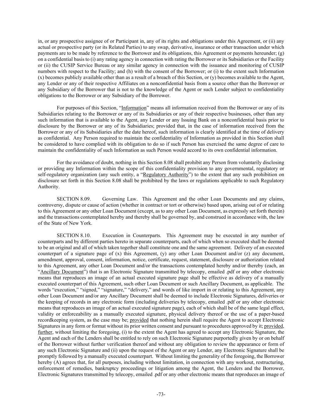 -73- in, or any prospective assignee of or Participant in, any of its rights and obligations under this Agreement, or (ii) any actual or prospective party (or its Related Parties) to any swap, derivative, insurance or other transaction under which payments are to be made by reference to the Borrower and its obligations, this Agreement or payments hereunder; (g) on a confidential basis to (i) any rating agency in connection with rating the Borrower or its Subsidiaries or the Facility or (ii) the CUSIP Service Bureau or any similar agency in connection with the issuance and monitoring of CUSIP numbers with respect to the Facility; and (h) with the consent of the Borrower; or (i) to the extent such Information (x) becomes publicly available other than as a result of a breach of this Section, or (y) becomes available to the Agent, any Lender or any of their respective Affiliates on a nonconfidential basis from a source other than the Borrower or any Subsidiary of the Borrower that is not to the knowledge of the Agent or such Lender subject to confidentiality obligations to the Borrower or any Subsidiary of the Borrower. For purposes of this Section, “Information” means all information received from the Borrower or any of its Subsidiaries relating to the Borrower or any of its Subsidiaries or any of their respective businesses, other than any such information that is available to the Agent, any Lender or any Issuing Bank on a nonconfidential basis prior to disclosure by the Borrower or any of its Subsidiaries; provided that, in the case of information received from the Borrower or any of its Subsidiaries after the date hereof, such information is clearly identified at the time of delivery as confidential. Any Person required to maintain the confidentiality of Information as provided in this Section shall be considered to have complied with its obligation to do so if such Person has exercised the same degree of care to maintain the confidentiality of such Information as such Person would accord to its own confidential information. For the avoidance of doubt, nothing in this Section 8.08 shall prohibit any Person from voluntarily disclosing or providing any Information within the scope of this confidentiality provision to any governmental, regulatory or self-regulatory organization (any such entity, a “Regulatory Authority”) to the extent that any such prohibition on disclosure set forth in this Section 8.08 shall be prohibited by the laws or regulations applicable to such Regulatory Authority. SECTION 8.09. Governing Law. This Agreement and the other Loan Documents and any claims, controversy, dispute or cause of action (whether in contract or tort or otherwise) based upon, arising out of or relating to this Agreement or any other Loan Document (except, as to any other Loan Document, as expressly set forth therein) and the transactions contemplated hereby and thereby shall be governed by, and construed in accordance with, the law of the State of New York. SECTION 8.10. Execution in Counterparts. This Agreement may be executed in any number of counterparts and by different parties hereto in separate counterparts, each of which when so executed shall be deemed to be an original and all of which taken together shall constitute one and the same agreement. Delivery of an executed counterpart of a signature page of (x) this Agreement, (y) any other Loan Document and/or (z) any document, amendment, approval, consent, information, notice, certificate, request, statement, disclosure or authorization related to this Agreement, any other Loan Document and/or the transactions contemplated hereby and/or thereby (each, an “Ancillary Document”) that is an Electronic Signature transmitted by telecopy, emailed .pdf or any other electronic means that reproduces an image of an actual executed signature page shall be effective as delivery of a manually executed counterpart of this Agreement, such other Loan Document or such Ancillary Document, as applicable. The words “execution,” “signed,” “signature,” “delivery,” and words of like import in or relating to this Agreement, any other Loan Document and/or any Ancillary Document shall be deemed to include Electronic Signatures, deliveries or the keeping of records in any electronic form (including deliveries by telecopy, emailed .pdf or any other electronic means that reproduces an image of an actual executed signature page), each of which shall be of the same legal effect, validity or enforceability as a manually executed signature, physical delivery thereof or the use of a paper-based recordkeeping system, as the case may be; provided that nothing herein shall require the Agent to accept Electronic Signatures in any form or format without its prior written consent and pursuant to procedures approved by it; provided, further, without limiting the foregoing, (i) to the extent the Agent has agreed to accept any Electronic Signature, the Agent and each of the Lenders shall be entitled to rely on such Electronic Signature purportedly given by or on behalf of the Borrower without further verification thereof and without any obligation to review the appearance or form of any such Electronic Signature and (ii) upon the request of the Agent or any Lender, any Electronic Signature shall be promptly followed by a manually executed counterpart. Without limiting the generality of the foregoing, the Borrower hereby (A) agrees that, for all purposes, including without limitation, in connection with any workout, restructuring, enforcement of remedies, bankruptcy proceedings or litigation among the Agent, the Lenders and the Borrower, Electronic Signatures transmitted by telecopy, emailed .pdf or any other electronic means that reproduces an image of