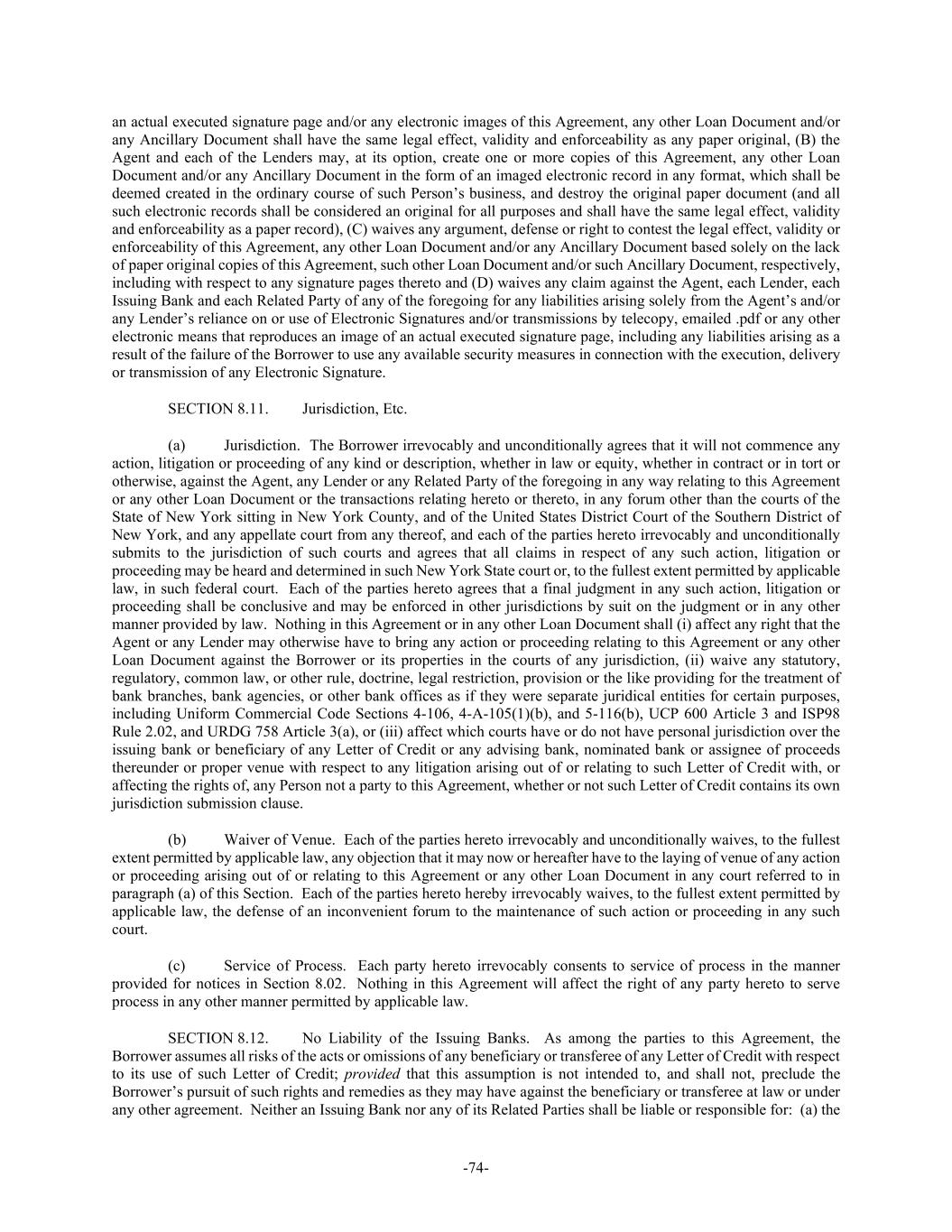 -74- an actual executed signature page and/or any electronic images of this Agreement, any other Loan Document and/or any Ancillary Document shall have the same legal effect, validity and enforceability as any paper original, (B) the Agent and each of the Lenders may, at its option, create one or more copies of this Agreement, any other Loan Document and/or any Ancillary Document in the form of an imaged electronic record in any format, which shall be deemed created in the ordinary course of such Person’s business, and destroy the original paper document (and all such electronic records shall be considered an original for all purposes and shall have the same legal effect, validity and enforceability as a paper record), (C) waives any argument, defense or right to contest the legal effect, validity or enforceability of this Agreement, any other Loan Document and/or any Ancillary Document based solely on the lack of paper original copies of this Agreement, such other Loan Document and/or such Ancillary Document, respectively, including with respect to any signature pages thereto and (D) waives any claim against the Agent, each Lender, each Issuing Bank and each Related Party of any of the foregoing for any liabilities arising solely from the Agent’s and/or any Lender’s reliance on or use of Electronic Signatures and/or transmissions by telecopy, emailed .pdf or any other electronic means that reproduces an image of an actual executed signature page, including any liabilities arising as a result of the failure of the Borrower to use any available security measures in connection with the execution, delivery or transmission of any Electronic Signature. SECTION 8.11. Jurisdiction, Etc. (a) Jurisdiction. The Borrower irrevocably and unconditionally agrees that it will not commence any action, litigation or proceeding of any kind or description, whether in law or equity, whether in contract or in tort or otherwise, against the Agent, any Lender or any Related Party of the foregoing in any way relating to this Agreement or any other Loan Document or the transactions relating hereto or thereto, in any forum other than the courts of the State of New York sitting in New York County, and of the United States District Court of the Southern District of New York, and any appellate court from any thereof, and each of the parties hereto irrevocably and unconditionally submits to the jurisdiction of such courts and agrees that all claims in respect of any such action, litigation or proceeding may be heard and determined in such New York State court or, to the fullest extent permitted by applicable law, in such federal court. Each of the parties hereto agrees that a final judgment in any such action, litigation or proceeding shall be conclusive and may be enforced in other jurisdictions by suit on the judgment or in any other manner provided by law. Nothing in this Agreement or in any other Loan Document shall (i) affect any right that the Agent or any Lender may otherwise have to bring any action or proceeding relating to this Agreement or any other Loan Document against the Borrower or its properties in the courts of any jurisdiction, (ii) waive any statutory, regulatory, common law, or other rule, doctrine, legal restriction, provision or the like providing for the treatment of bank branches, bank agencies, or other bank offices as if they were separate juridical entities for certain purposes, including Uniform Commercial Code Sections 4-106, 4-A-105(1)(b), and 5-116(b), UCP 600 Article 3 and ISP98 Rule 2.02, and URDG 758 Article 3(a), or (iii) affect which courts have or do not have personal jurisdiction over the issuing bank or beneficiary of any Letter of Credit or any advising bank, nominated bank or assignee of proceeds thereunder or proper venue with respect to any litigation arising out of or relating to such Letter of Credit with, or affecting the rights of, any Person not a party to this Agreement, whether or not such Letter of Credit contains its own jurisdiction submission clause. (b) Waiver of Venue. Each of the parties hereto irrevocably and unconditionally waives, to the fullest extent permitted by applicable law, any objection that it may now or hereafter have to the laying of venue of any action or proceeding arising out of or relating to this Agreement or any other Loan Document in any court referred to in paragraph (a) of this Section. Each of the parties hereto hereby irrevocably waives, to the fullest extent permitted by applicable law, the defense of an inconvenient forum to the maintenance of such action or proceeding in any such court. (c) Service of Process. Each party hereto irrevocably consents to service of process in the manner provided for notices in Section 8.02. Nothing in this Agreement will affect the right of any party hereto to serve process in any other manner permitted by applicable law. SECTION 8.12. No Liability of the Issuing Banks. As among the parties to this Agreement, the Borrower assumes all risks of the acts or omissions of any beneficiary or transferee of any Letter of Credit with respect to its use of such Letter of Credit; provided that this assumption is not intended to, and shall not, preclude the Borrower’s pursuit of such rights and remedies as they may have against the beneficiary or transferee at law or under any other agreement. Neither an Issuing Bank nor any of its Related Parties shall be liable or responsible for: (a) the