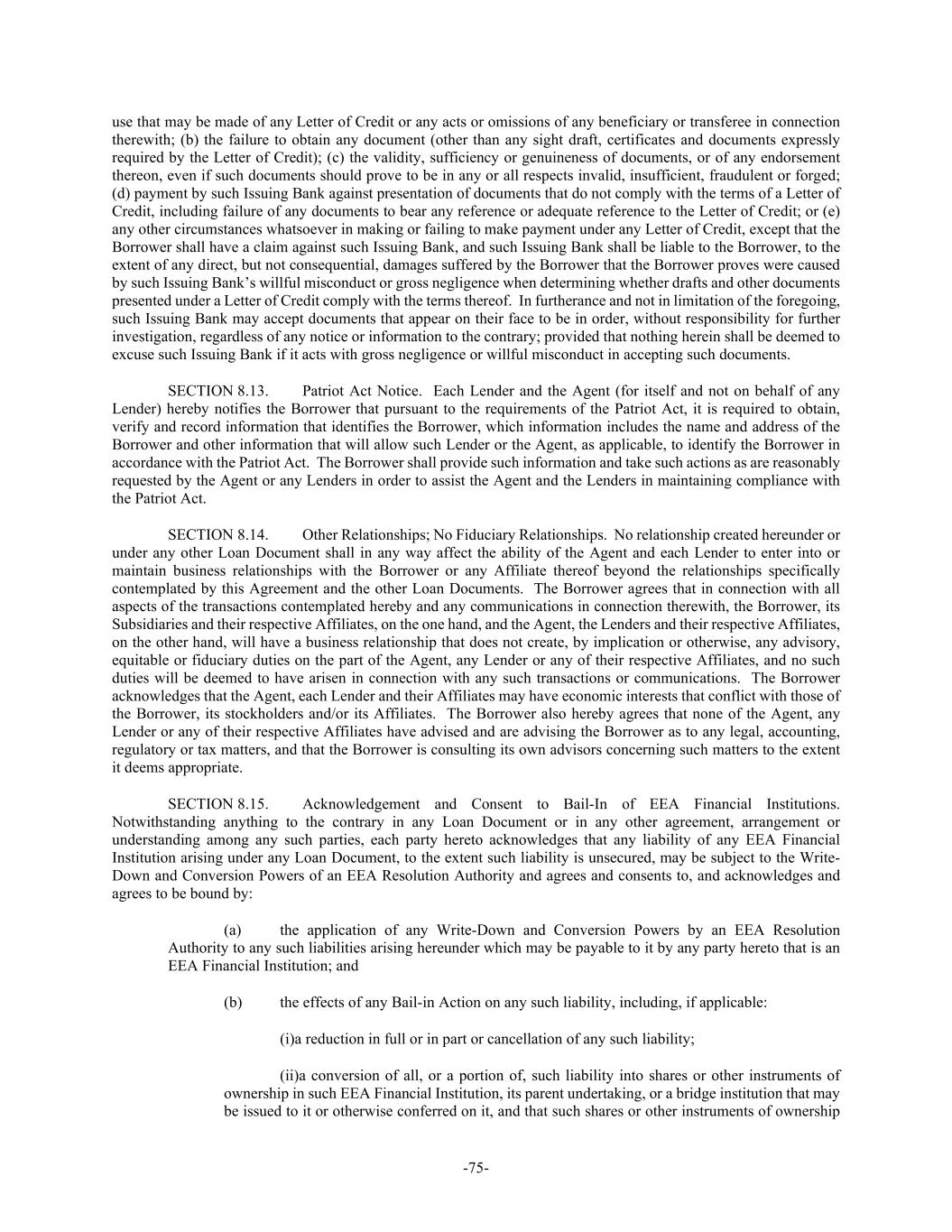 -75- use that may be made of any Letter of Credit or any acts or omissions of any beneficiary or transferee in connection therewith; (b) the failure to obtain any document (other than any sight draft, certificates and documents expressly required by the Letter of Credit); (c) the validity, sufficiency or genuineness of documents, or of any endorsement thereon, even if such documents should prove to be in any or all respects invalid, insufficient, fraudulent or forged; (d) payment by such Issuing Bank against presentation of documents that do not comply with the terms of a Letter of Credit, including failure of any documents to bear any reference or adequate reference to the Letter of Credit; or (e) any other circumstances whatsoever in making or failing to make payment under any Letter of Credit, except that the Borrower shall have a claim against such Issuing Bank, and such Issuing Bank shall be liable to the Borrower, to the extent of any direct, but not consequential, damages suffered by the Borrower that the Borrower proves were caused by such Issuing Bank’s willful misconduct or gross negligence when determining whether drafts and other documents presented under a Letter of Credit comply with the terms thereof. In furtherance and not in limitation of the foregoing, such Issuing Bank may accept documents that appear on their face to be in order, without responsibility for further investigation, regardless of any notice or information to the contrary; provided that nothing herein shall be deemed to excuse such Issuing Bank if it acts with gross negligence or willful misconduct in accepting such documents. SECTION 8.13. Patriot Act Notice. Each Lender and the Agent (for itself and not on behalf of any Lender) hereby notifies the Borrower that pursuant to the requirements of the Patriot Act, it is required to obtain, verify and record information that identifies the Borrower, which information includes the name and address of the Borrower and other information that will allow such Lender or the Agent, as applicable, to identify the Borrower in accordance with the Patriot Act. The Borrower shall provide such information and take such actions as are reasonably requested by the Agent or any Lenders in order to assist the Agent and the Lenders in maintaining compliance with the Patriot Act. SECTION 8.14. Other Relationships; No Fiduciary Relationships. No relationship created hereunder or under any other Loan Document shall in any way affect the ability of the Agent and each Lender to enter into or maintain business relationships with the Borrower or any Affiliate thereof beyond the relationships specifically contemplated by this Agreement and the other Loan Documents. The Borrower agrees that in connection with all aspects of the transactions contemplated hereby and any communications in connection therewith, the Borrower, its Subsidiaries and their respective Affiliates, on the one hand, and the Agent, the Lenders and their respective Affiliates, on the other hand, will have a business relationship that does not create, by implication or otherwise, any advisory, equitable or fiduciary duties on the part of the Agent, any Lender or any of their respective Affiliates, and no such duties will be deemed to have arisen in connection with any such transactions or communications. The Borrower acknowledges that the Agent, each Lender and their Affiliates may have economic interests that conflict with those of the Borrower, its stockholders and/or its Affiliates. The Borrower also hereby agrees that none of the Agent, any Lender or any of their respective Affiliates have advised and are advising the Borrower as to any legal, accounting, regulatory or tax matters, and that the Borrower is consulting its own advisors concerning such matters to the extent it deems appropriate. SECTION 8.15. Acknowledgement and Consent to Bail-In of EEA Financial Institutions. Notwithstanding anything to the contrary in any Loan Document or in any other agreement, arrangement or understanding among any such parties, each party hereto acknowledges that any liability of any EEA Financial Institution arising under any Loan Document, to the extent such liability is unsecured, may be subject to the Write- Down and Conversion Powers of an EEA Resolution Authority and agrees and consents to, and acknowledges and agrees to be bound by: (a) the application of any Write-Down and Conversion Powers by an EEA Resolution Authority to any such liabilities arising hereunder which may be payable to it by any party hereto that is an EEA Financial Institution; and (b) the effects of any Bail-in Action on any such liability, including, if applicable: (i)a reduction in full or in part or cancellation of any such liability; (ii)a conversion of all, or a portion of, such liability into shares or other instruments of ownership in such EEA Financial Institution, its parent undertaking, or a bridge institution that may be issued to it or otherwise conferred on it, and that such shares or other instruments of ownership