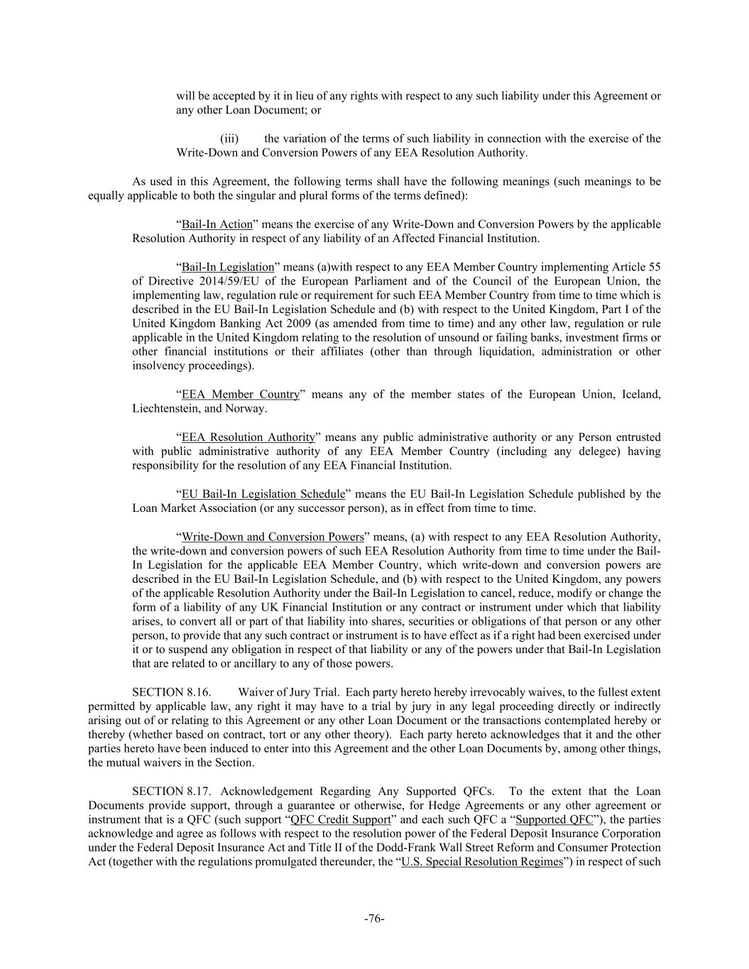 -76- will be accepted by it in lieu of any rights with respect to any such liability under this Agreement or any other Loan Document; or (iii) the variation of the terms of such liability in connection with the exercise of the Write-Down and Conversion Powers of any EEA Resolution Authority. As used in this Agreement, the following terms shall have the following meanings (such meanings to be equally applicable to both the singular and plural forms of the terms defined): “Bail-In Action” means the exercise of any Write-Down and Conversion Powers by the applicable Resolution Authority in respect of any liability of an Affected Financial Institution. “Bail-In Legislation” means (a)with respect to any EEA Member Country implementing Article 55 of Directive 2014/59/EU of the European Parliament and of the Council of the European Union, the implementing law, regulation rule or requirement for such EEA Member Country from time to time which is described in the EU Bail-In Legislation Schedule and (b) with respect to the United Kingdom, Part I of the United Kingdom Banking Act 2009 (as amended from time to time) and any other law, regulation or rule applicable in the United Kingdom relating to the resolution of unsound or failing banks, investment firms or other financial institutions or their affiliates (other than through liquidation, administration or other insolvency proceedings). “EEA Member Country” means any of the member states of the European Union, Iceland, Liechtenstein, and Norway. “EEA Resolution Authority” means any public administrative authority or any Person entrusted with public administrative authority of any EEA Member Country (including any delegee) having responsibility for the resolution of any EEA Financial Institution. “EU Bail-In Legislation Schedule” means the EU Bail-In Legislation Schedule published by the Loan Market Association (or any successor person), as in effect from time to time. “Write-Down and Conversion Powers” means, (a) with respect to any EEA Resolution Authority, the write-down and conversion powers of such EEA Resolution Authority from time to time under the Bail- In Legislation for the applicable EEA Member Country, which write-down and conversion powers are described in the EU Bail-In Legislation Schedule, and (b) with respect to the United Kingdom, any powers of the applicable Resolution Authority under the Bail-In Legislation to cancel, reduce, modify or change the form of a liability of any UK Financial Institution or any contract or instrument under which that liability arises, to convert all or part of that liability into shares, securities or obligations of that person or any other person, to provide that any such contract or instrument is to have effect as if a right had been exercised under it or to suspend any obligation in respect of that liability or any of the powers under that Bail-In Legislation that are related to or ancillary to any of those powers. SECTION 8.16. Waiver of Jury Trial. Each party hereto hereby irrevocably waives, to the fullest extent permitted by applicable law, any right it may have to a trial by jury in any legal proceeding directly or indirectly arising out of or relating to this Agreement or any other Loan Document or the transactions contemplated hereby or thereby (whether based on contract, tort or any other theory). Each party hereto acknowledges that it and the other parties hereto have been induced to enter into this Agreement and the other Loan Documents by, among other things, the mutual waivers in the Section. SECTION 8.17. Acknowledgement Regarding Any Supported QFCs. To the extent that the Loan Documents provide support, through a guarantee or otherwise, for Hedge Agreements or any other agreement or instrument that is a QFC (such support “QFC Credit Support” and each such QFC a “Supported QFC”), the parties acknowledge and agree as follows with respect to the resolution power of the Federal Deposit Insurance Corporation under the Federal Deposit Insurance Act and Title II of the Dodd-Frank Wall Street Reform and Consumer Protection Act (together with the regulations promulgated thereunder, the “U.S. Special Resolution Regimes”) in respect of such