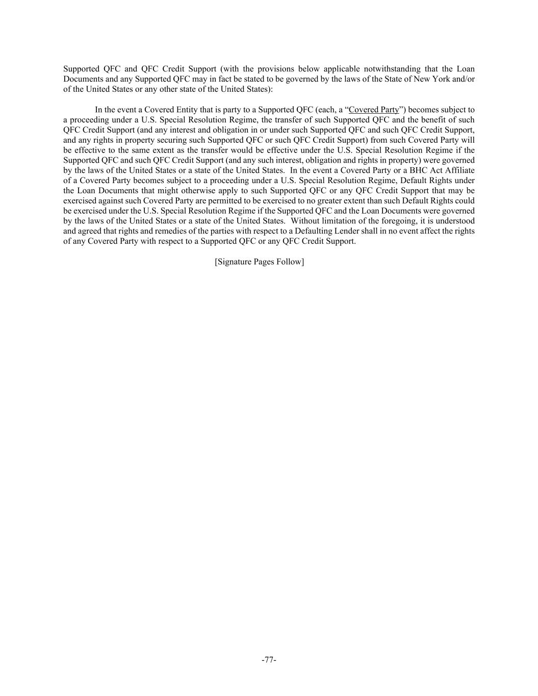 -77- Supported QFC and QFC Credit Support (with the provisions below applicable notwithstanding that the Loan Documents and any Supported QFC may in fact be stated to be governed by the laws of the State of New York and/or of the United States or any other state of the United States): In the event a Covered Entity that is party to a Supported QFC (each, a “Covered Party”) becomes subject to a proceeding under a U.S. Special Resolution Regime, the transfer of such Supported QFC and the benefit of such QFC Credit Support (and any interest and obligation in or under such Supported QFC and such QFC Credit Support, and any rights in property securing such Supported QFC or such QFC Credit Support) from such Covered Party will be effective to the same extent as the transfer would be effective under the U.S. Special Resolution Regime if the Supported QFC and such QFC Credit Support (and any such interest, obligation and rights in property) were governed by the laws of the United States or a state of the United States. In the event a Covered Party or a BHC Act Affiliate of a Covered Party becomes subject to a proceeding under a U.S. Special Resolution Regime, Default Rights under the Loan Documents that might otherwise apply to such Supported QFC or any QFC Credit Support that may be exercised against such Covered Party are permitted to be exercised to no greater extent than such Default Rights could be exercised under the U.S. Special Resolution Regime if the Supported QFC and the Loan Documents were governed by the laws of the United States or a state of the United States. Without limitation of the foregoing, it is understood and agreed that rights and remedies of the parties with respect to a Defaulting Lender shall in no event affect the rights of any Covered Party with respect to a Supported QFC or any QFC Credit Support. [Signature Pages Follow]
