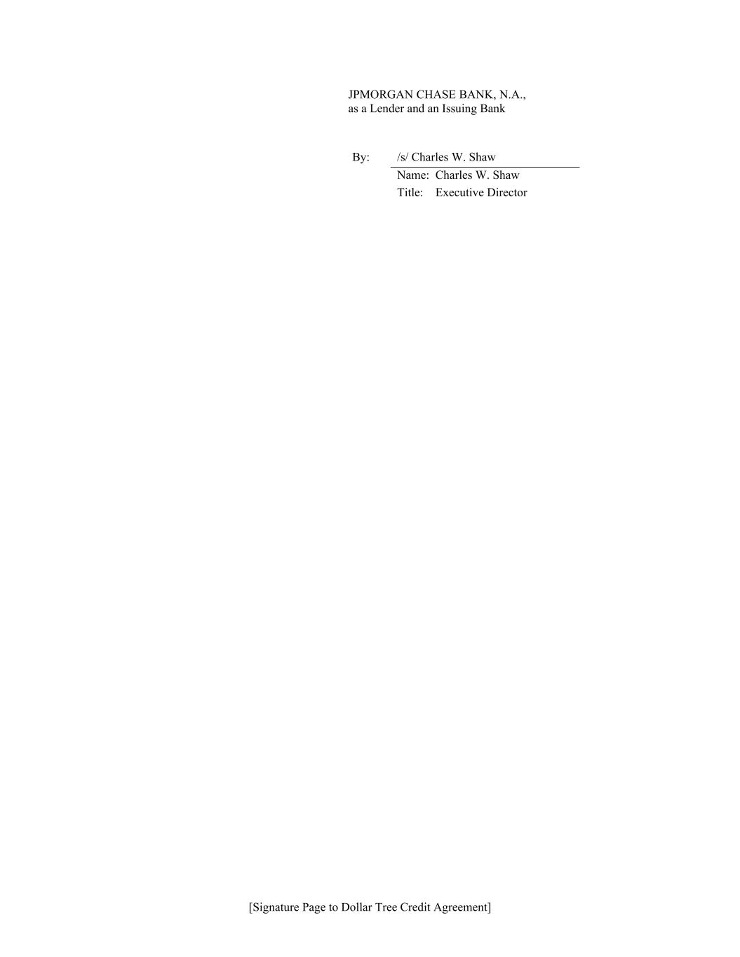 [Signature Page to Dollar Tree Credit Agreement] JPMORGAN CHASE BANK, N.A., as a Lender and an Issuing Bank By: /s/ Charles W. Shaw Name: Charles W. Shaw Title: Executive Director