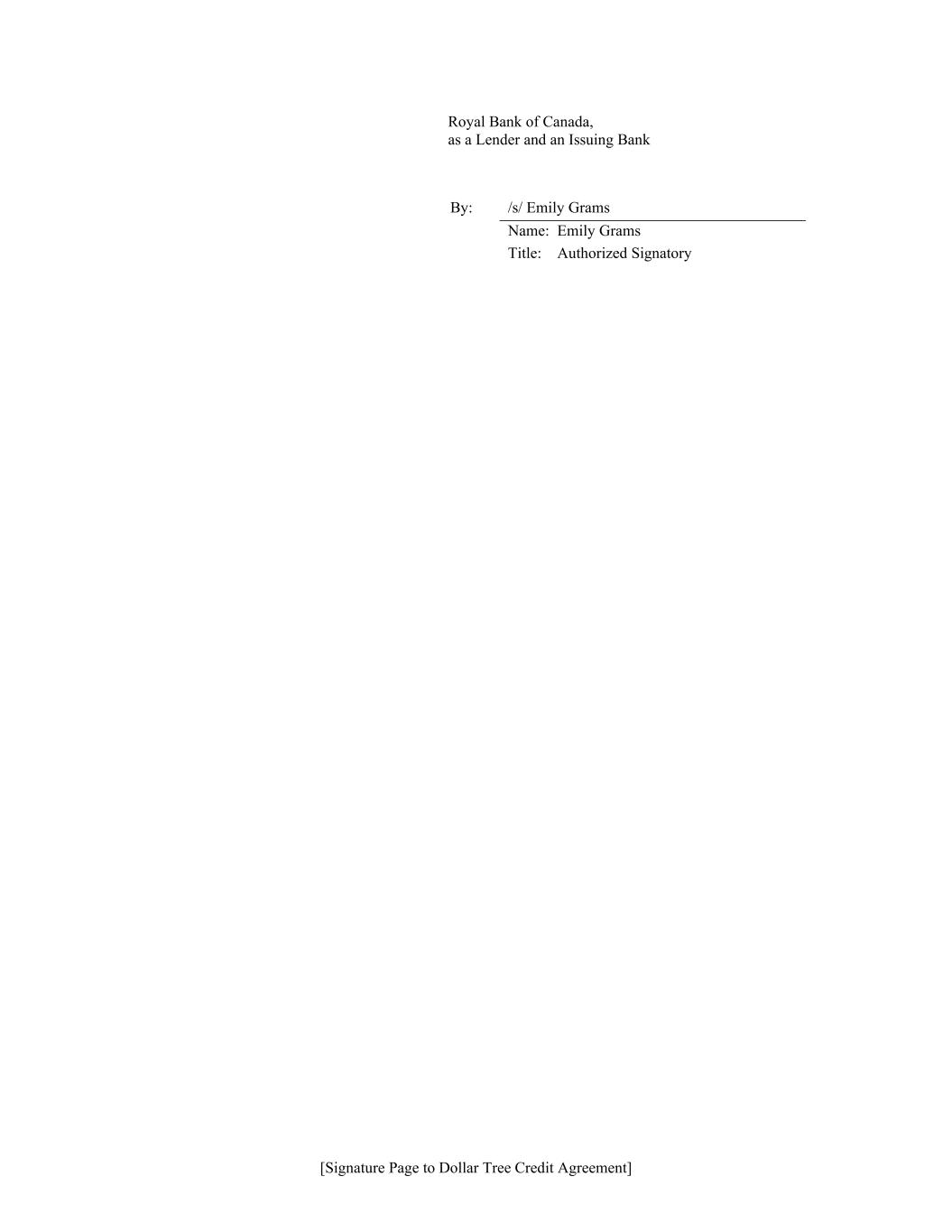 [Signature Page to Dollar Tree Credit Agreement] Royal Bank of Canada, as a Lender and an Issuing Bank By: /s/ Emily Grams Name: Emily Grams Title: Authorized Signatory