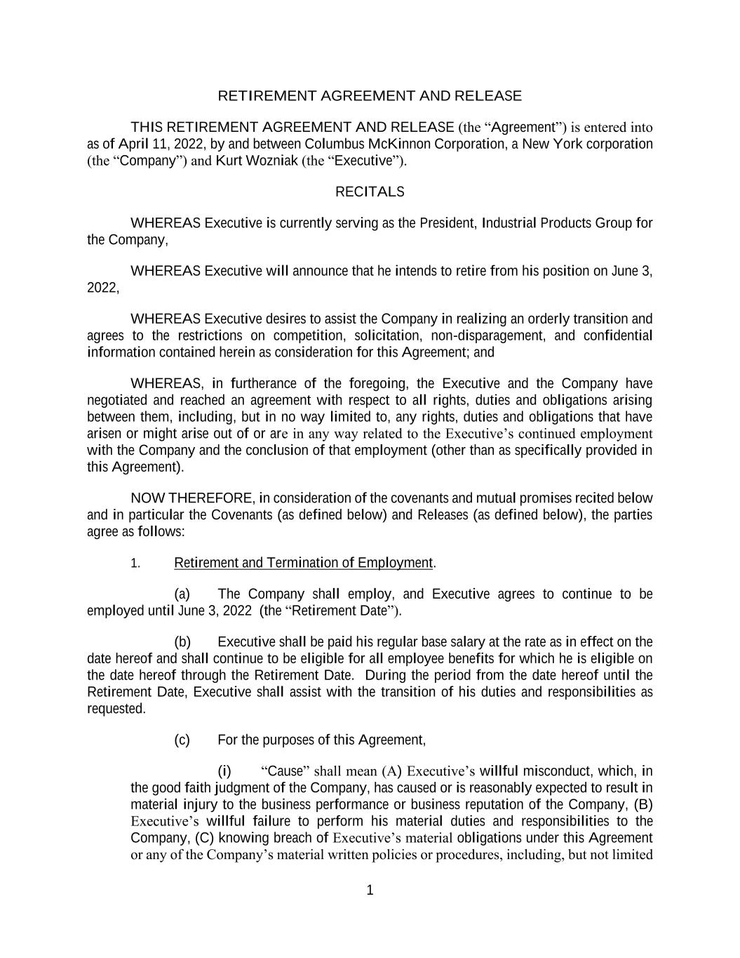 1 RETIREMENT AGREEMENT AND RELEASE THIS RETIREMENT AGREEMENT AND RELEASE (the “Agreement”) is entered into as of April 11, 2022, by and between Columbus McKinnon Corporation, a New York corporation (the “Company”) and Kurt Wozniak (the “Executive”). RECITALS WHEREAS Executive is currently serving as the President, Industrial Products Group for the Company, WHEREAS Executive will announce that he intends to retire from his position on June 3, 2022, WHEREAS Executive desires to assist the Company in realizing an orderly transition and agrees to the restrictions on competition, solicitation, non-disparagement, and confidential information contained herein as consideration for this Agreement; and WHEREAS, in furtherance of the foregoing, the Executive and the Company have negotiated and reached an agreement with respect to all rights, duties and obligations arising between them, including, but in no way limited to, any rights, duties and obligations that have arisen or might arise out of or are in any way related to the Executive’s continued employment with the Company and the conclusion of that employment (other than as specifically provided in this Agreement). NOW THEREFORE, in consideration of the covenants and mutual promises recited below and in particular the Covenants (as defined below) and Releases (as defined below), the parties agree as follows: 1. Retirement and Termination of Employment. (a) The Company shall employ, and Executive agrees to continue to be employed until June 3, 2022 (the “Retirement Date”). (b) Executive shall be paid his regular base salary at the rate as in effect on the date hereof and shall continue to be eligible for all employee benefits for which he is eligible on the date hereof through the Retirement Date. During the period from the date hereof until the Retirement Date, Executive shall assist with the transition of his duties and responsibilities as requested. (c) For the purposes of this Agreement, (i) “Cause” shall mean (A) Executive’s willful misconduct, which, in the good faith judgment of the Company, has caused or is reasonably expected to result in material injury to the business performance or business reputation of the Company, (B) Executive’s willful failure to perform his material duties and responsibilities to the Company, (C) knowing breach of Executive’s material obligations under this Agreement or any of the Company’s material written policies or procedures, including, but not limited