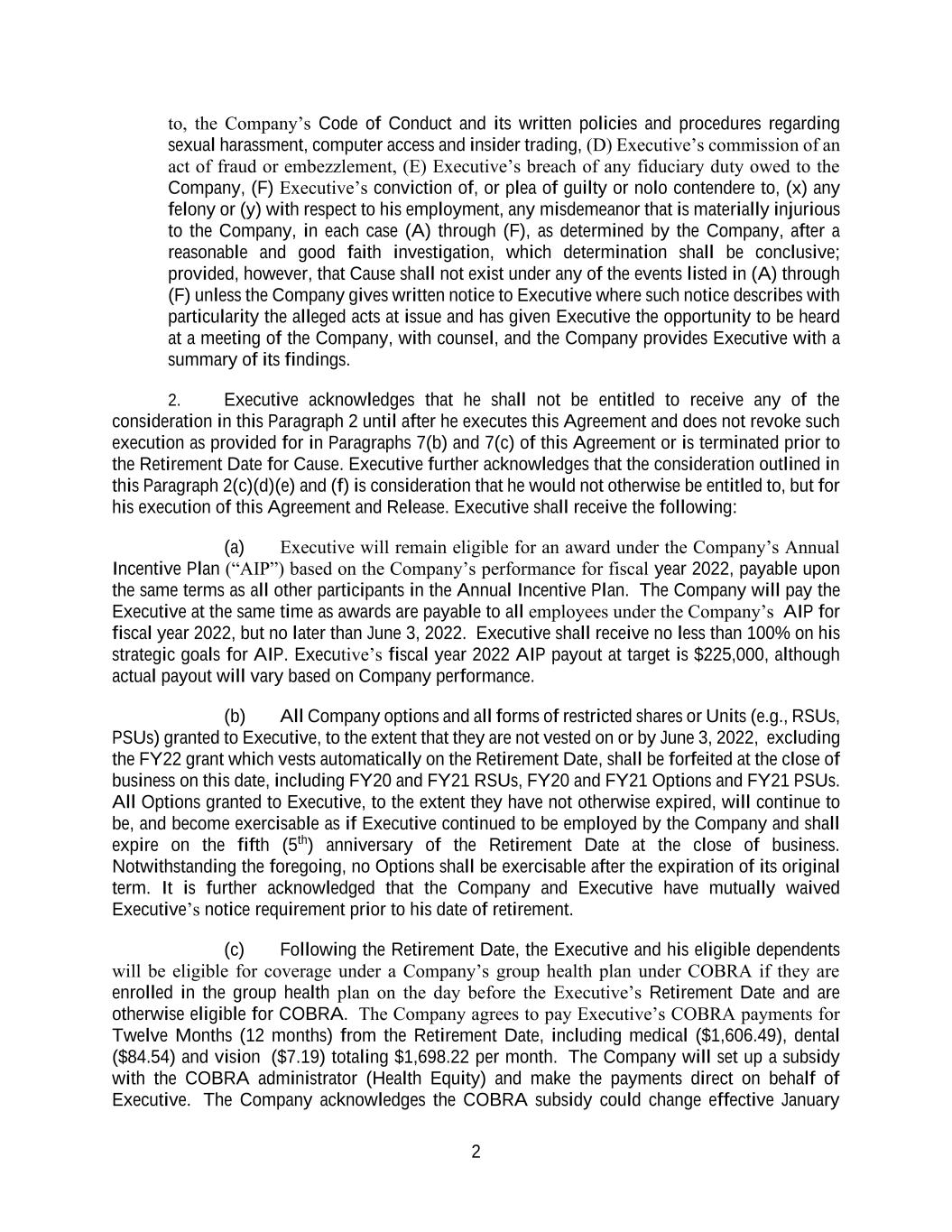 2 to, the Company’s Code of Conduct and its written policies and procedures regarding sexual harassment, computer access and insider trading, (D) Executive’s commission of an act of fraud or embezzlement, (E) Executive’s breach of any fiduciary duty owed to the Company, (F) Executive’s conviction of, or plea of guilty or nolo contendere to, (x) any felony or (y) with respect to his employment, any misdemeanor that is materially injurious to the Company, in each case (A) through (F), as determined by the Company, after a reasonable and good faith investigation, which determination shall be conclusive; provided, however, that Cause shall not exist under any of the events listed in (A) through (F) unless the Company gives written notice to Executive where such notice describes with particularity the alleged acts at issue and has given Executive the opportunity to be heard at a meeting of the Company, with counsel, and the Company provides Executive with a summary of its findings. 2. Executive acknowledges that he shall not be entitled to receive any of the consideration in this Paragraph 2 until after he executes this Agreement and does not revoke such execution as provided for in Paragraphs 7(b) and 7(c) of this Agreement or is terminated prior to the Retirement Date for Cause. Executive further acknowledges that the consideration outlined in this Paragraph 2(c)(d)(e) and (f) is consideration that he would not otherwise be entitled to, but for his execution of this Agreement and Release. Executive shall receive the following: (a) Executive will remain eligible for an award under the Company’s Annual Incentive Plan (“AIP”) based on the Company’s performance for fiscal year 2022, payable upon the same terms as all other participants in the Annual Incentive Plan. The Company will pay the Executive at the same time as awards are payable to all employees under the Company’s AIP for fiscal year 2022, but no later than June 3, 2022. Executive shall receive no less than 100% on his strategic goals for AIP. Executive’s fiscal year 2022 AIP payout at target is $225,000, although actual payout will vary based on Company performance. (b) All Company options and all forms of restricted shares or Units (e.g., RSUs, PSUs) granted to Executive, to the extent that they are not vested on or by June 3, 2022, excluding the FY22 grant which vests automatically on the Retirement Date, shall be forfeited at the close of business on this date, including FY20 and FY21 RSUs, FY20 and FY21 Options and FY21 PSUs. All Options granted to Executive, to the extent they have not otherwise expired, will continue to be, and become exercisable as if Executive continued to be employed by the Company and shall expire on the fifth (5th) anniversary of the Retirement Date at the close of business. Notwithstanding the foregoing, no Options shall be exercisable after the expiration of its original term. It is further acknowledged that the Company and Executive have mutually waived Executive’s notice requirement prior to his date of retirement. (c) Following the Retirement Date, the Executive and his eligible dependents will be eligible for coverage under a Company’s group health plan under COBRA if they are enrolled in the group health plan on the day before the Executive’s Retirement Date and are otherwise eligible for COBRA. The Company agrees to pay Executive’s COBRA payments for Twelve Months (12 months) from the Retirement Date, including medical ($1,606.49), dental ($84.54) and vision ($7.19) totaling $1,698.22 per month. The Company will set up a subsidy with the COBRA administrator (Health Equity) and make the payments direct on behalf of Executive. The Company acknowledges the COBRA subsidy could change effective January