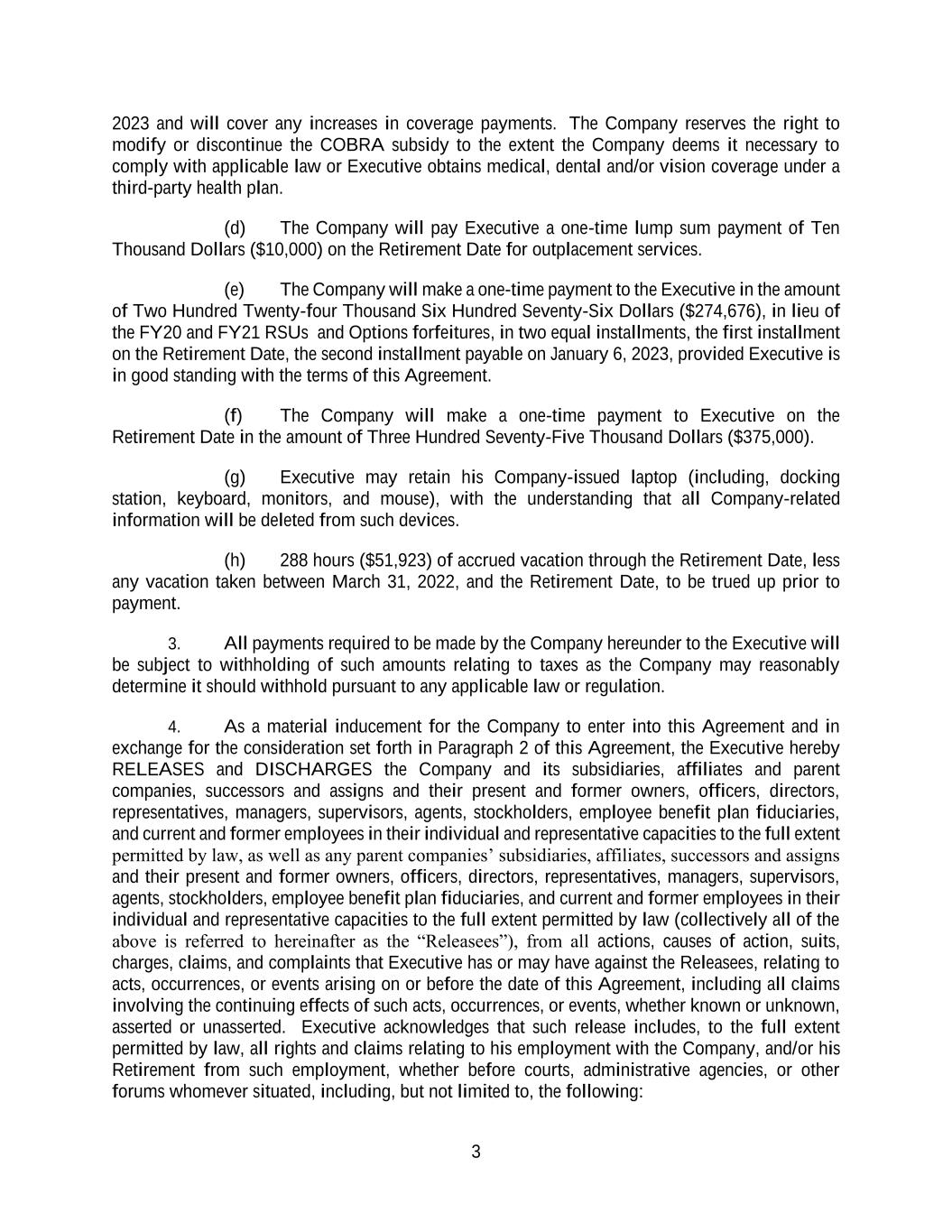 3 2023 and will cover any increases in coverage payments. The Company reserves the right to modify or discontinue the COBRA subsidy to the extent the Company deems it necessary to comply with applicable law or Executive obtains medical, dental and/or vision coverage under a third-party health plan. (d) The Company will pay Executive a one-time lump sum payment of Ten Thousand Dollars ($10,000) on the Retirement Date for outplacement services. (e) The Company will make a one-time payment to the Executive in the amount of Two Hundred Twenty-four Thousand Six Hundred Seventy-Six Dollars ($274,676), in lieu of the FY20 and FY21 RSUs and Options forfeitures, in two equal installments, the first installment on the Retirement Date, the second installment payable on January 6, 2023, provided Executive is in good standing with the terms of this Agreement. (f) The Company will make a one-time payment to Executive on the Retirement Date in the amount of Three Hundred Seventy-Five Thousand Dollars ($375,000). (g) Executive may retain his Company-issued laptop (including, docking station, keyboard, monitors, and mouse), with the understanding that all Company-related information will be deleted from such devices. (h) 288 hours ($51,923) of accrued vacation through the Retirement Date, less any vacation taken between March 31, 2022, and the Retirement Date, to be trued up prior to payment. 3. All payments required to be made by the Company hereunder to the Executive will be subject to withholding of such amounts relating to taxes as the Company may reasonably determine it should withhold pursuant to any applicable law or regulation. 4. As a material inducement for the Company to enter into this Agreement and in exchange for the consideration set forth in Paragraph 2 of this Agreement, the Executive hereby RELEASES and DISCHARGES the Company and its subsidiaries, affiliates and parent companies, successors and assigns and their present and former owners, officers, directors, representatives, managers, supervisors, agents, stockholders, employee benefit plan fiduciaries, and current and former employees in their individual and representative capacities to the full extent permitted by law, as well as any parent companies’ subsidiaries, affiliates, successors and assigns and their present and former owners, officers, directors, representatives, managers, supervisors, agents, stockholders, employee benefit plan fiduciaries, and current and former employees in their individual and representative capacities to the full extent permitted by law (collectively all of the above is referred to hereinafter as the “Releasees”), from all actions, causes of action, suits, charges, claims, and complaints that Executive has or may have against the Releasees, relating to acts, occurrences, or events arising on or before the date of this Agreement, including all claims involving the continuing effects of such acts, occurrences, or events, whether known or unknown, asserted or unasserted. Executive acknowledges that such release includes, to the full extent permitted by law, all rights and claims relating to his employment with the Company, and/or his Retirement from such employment, whether before courts, administrative agencies, or other forums whomever situated, including, but not limited to, the following: