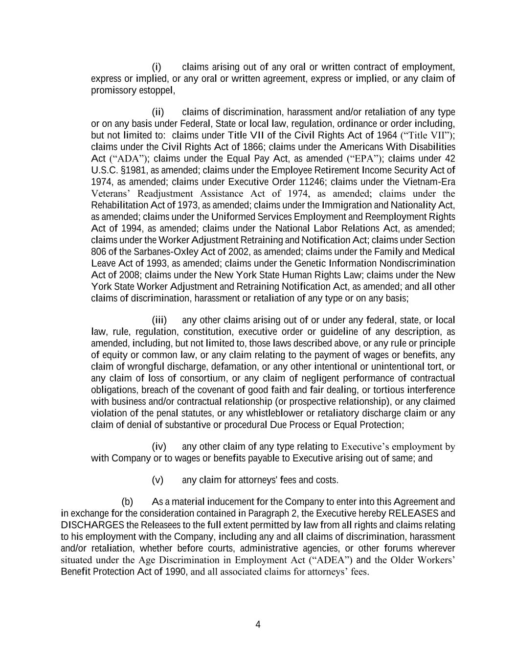 4 (i) claims arising out of any oral or written contract of employment, express or implied, or any oral or written agreement, express or implied, or any claim of promissory estoppel, (ii) claims of discrimination, harassment and/or retaliation of any type or on any basis under Federal, State or local law, regulation, ordinance or order including, but not limited to: claims under Title VII of the Civil Rights Act of 1964 (“Title VII”); claims under the Civil Rights Act of 1866; claims under the Americans With Disabilities Act (“ADA”); claims under the Equal Pay Act, as amended (“EPA”); claims under 42 U.S.C. §1981, as amended; claims under the Employee Retirement Income Security Act of 1974, as amended; claims under Executive Order 11246; claims under the Vietnam-Era Veterans’ Readjustment Assistance Act of 1974, as amended; claims under the Rehabilitation Act of 1973, as amended; claims under the Immigration and Nationality Act, as amended; claims under the Uniformed Services Employment and Reemployment Rights Act of 1994, as amended; claims under the National Labor Relations Act, as amended; claims under the Worker Adjustment Retraining and Notification Act; claims under Section 806 of the Sarbanes-Oxley Act of 2002, as amended; claims under the Family and Medical Leave Act of 1993, as amended; claims under the Genetic Information Nondiscrimination Act of 2008; claims under the New York State Human Rights Law; claims under the New York State Worker Adjustment and Retraining Notification Act, as amended; and all other claims of discrimination, harassment or retaliation of any type or on any basis; (iii) any other claims arising out of or under any federal, state, or local law, rule, regulation, constitution, executive order or guideline of any description, as amended, including, but not limited to, those laws described above, or any rule or principle of equity or common law, or any claim relating to the payment of wages or benefits, any claim of wrongful discharge, defamation, or any other intentional or unintentional tort, or any claim of loss of consortium, or any claim of negligent performance of contractual obligations, breach of the covenant of good faith and fair dealing, or tortious interference with business and/or contractual relationship (or prospective relationship), or any claimed violation of the penal statutes, or any whistleblower or retaliatory discharge claim or any claim of denial of substantive or procedural Due Process or Equal Protection; (iv) any other claim of any type relating to Executive’s employment by with Company or to wages or benefits payable to Executive arising out of same; and (v) any claim for attorneys' fees and costs. (b) As a material inducement for the Company to enter into this Agreement and in exchange for the consideration contained in Paragraph 2, the Executive hereby RELEASES and DISCHARGES the Releasees to the full extent permitted by law from all rights and claims relating to his employment with the Company, including any and all claims of discrimination, harassment and/or retaliation, whether before courts, administrative agencies, or other forums wherever situated under the Age Discrimination in Employment Act (“ADEA”) and the Older Workers’ Benefit Protection Act of 1990, and all associated claims for attorneys’ fees.