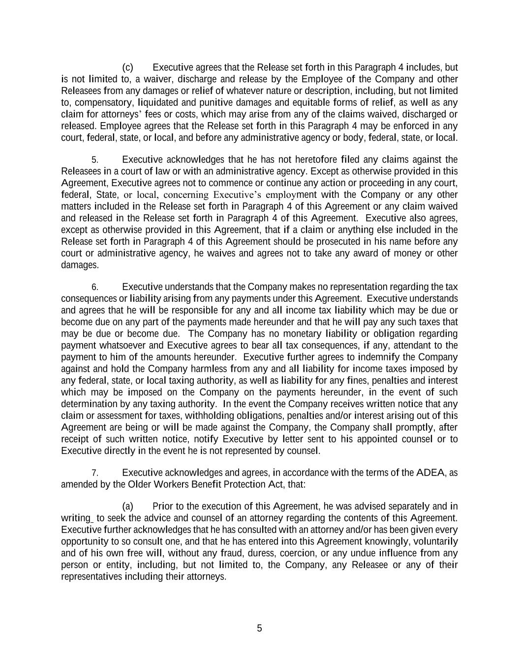5 (c) Executive agrees that the Release set forth in this Paragraph 4 includes, but is not limited to, a waiver, discharge and release by the Employee of the Company and other Releasees from any damages or relief of whatever nature or description, including, but not limited to, compensatory, liquidated and punitive damages and equitable forms of relief, as well as any claim for attorneys’ fees or costs, which may arise from any of the claims waived, discharged or released. Employee agrees that the Release set forth in this Paragraph 4 may be enforced in any court, federal, state, or local, and before any administrative agency or body, federal, state, or local. 5. Executive acknowledges that he has not heretofore filed any claims against the Releasees in a court of law or with an administrative agency. Except as otherwise provided in this Agreement, Executive agrees not to commence or continue any action or proceeding in any court, federal, State, or local, concerning Executive’s employment with the Company or any other matters included in the Release set forth in Paragraph 4 of this Agreement or any claim waived and released in the Release set forth in Paragraph 4 of this Agreement. Executive also agrees, except as otherwise provided in this Agreement, that if a claim or anything else included in the Release set forth in Paragraph 4 of this Agreement should be prosecuted in his name before any court or administrative agency, he waives and agrees not to take any award of money or other damages. 6. Executive understands that the Company makes no representation regarding the tax consequences or liability arising from any payments under this Agreement. Executive understands and agrees that he will be responsible for any and all income tax liability which may be due or become due on any part of the payments made hereunder and that he will pay any such taxes that may be due or become due. The Company has no monetary liability or obligation regarding payment whatsoever and Executive agrees to bear all tax consequences, if any, attendant to the payment to him of the amounts hereunder. Executive further agrees to indemnify the Company against and hold the Company harmless from any and all liability for income taxes imposed by any federal, state, or local taxing authority, as well as liability for any fines, penalties and interest which may be imposed on the Company on the payments hereunder, in the event of such determination by any taxing authority. In the event the Company receives written notice that any claim or assessment for taxes, withholding obligations, penalties and/or interest arising out of this Agreement are being or will be made against the Company, the Company shall promptly, after receipt of such written notice, notify Executive by letter sent to his appointed counsel or to Executive directly in the event he is not represented by counsel. 7. Executive acknowledges and agrees, in accordance with the terms of the ADEA, as amended by the Older Workers Benefit Protection Act, that: (a) Prior to the execution of this Agreement, he was advised separately and in writing to seek the advice and counsel of an attorney regarding the contents of this Agreement. Executive further acknowledges that he has consulted with an attorney and/or has been given every opportunity to so consult one, and that he has entered into this Agreement knowingly, voluntarily and of his own free will, without any fraud, duress, coercion, or any undue influence from any person or entity, including, but not limited to, the Company, any Releasee or any of their representatives including their attorneys.