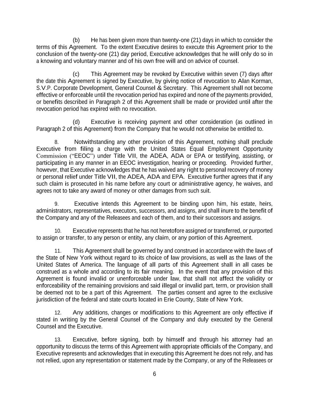 6 (b) He has been given more than twenty-one (21) days in which to consider the terms of this Agreement. To the extent Executive desires to execute this Agreement prior to the conclusion of the twenty-one (21) day period, Executive acknowledges that he will only do so in a knowing and voluntary manner and of his own free will and on advice of counsel. (c) This Agreement may be revoked by Executive within seven (7) days after the date this Agreement is signed by Executive, by giving notice of revocation to Alan Korman, S.V.P. Corporate Development, General Counsel & Secretary. This Agreement shall not become effective or enforceable until the revocation period has expired and none of the payments provided, or benefits described in Paragraph 2 of this Agreement shall be made or provided until after the revocation period has expired with no revocation. (d) Executive is receiving payment and other consideration (as outlined in Paragraph 2 of this Agreement) from the Company that he would not otherwise be entitled to. 8. Notwithstanding any other provision of this Agreement, nothing shall preclude Executive from filing a charge with the United States Equal Employment Opportunity Commission (“EEOC”) under Title VII, the ADEA, ADA or EPA or testifying, assisting, or participating in any manner in an EEOC investigation, hearing or proceeding. Provided further, however, that Executive acknowledges that he has waived any right to personal recovery of money or personal relief under Title VII, the ADEA, ADA and EPA. Executive further agrees that if any such claim is prosecuted in his name before any court or administrative agency, he waives, and agrees not to take any award of money or other damages from such suit. 9. Executive intends this Agreement to be binding upon him, his estate, heirs, administrators, representatives, executors, successors, and assigns, and shall inure to the benefit of the Company and any of the Releasees and each of them, and to their successors and assigns. 10. Executive represents that he has not heretofore assigned or transferred, or purported to assign or transfer, to any person or entity, any claim, or any portion of this Agreement. 11. This Agreement shall be governed by and construed in accordance with the laws of the State of New York without regard to its choice of law provisions, as well as the laws of the United States of America. The language of all parts of this Agreement shall in all cases be construed as a whole and according to its fair meaning. In the event that any provision of this Agreement is found invalid or unenforceable under law, that shall not affect the validity or enforceability of the remaining provisions and said illegal or invalid part, term, or provision shall be deemed not to be a part of this Agreement. The parties consent and agree to the exclusive jurisdiction of the federal and state courts located in Erie County, State of New York. 12. Any additions, changes or modifications to this Agreement are only effective if stated in writing by the General Counsel of the Company and duly executed by the General Counsel and the Executive. 13. Executive, before signing, both by himself and through his attorney had an opportunity to discuss the terms of this Agreement with appropriate officials of the Company, and Executive represents and acknowledges that in executing this Agreement he does not rely, and has not relied, upon any representation or statement made by the Company, or any of the Releasees or