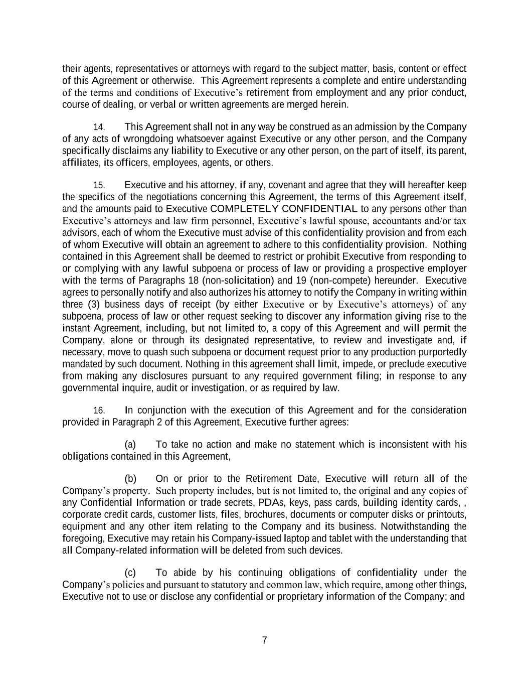 7 their agents, representatives or attorneys with regard to the subject matter, basis, content or effect of this Agreement or otherwise. This Agreement represents a complete and entire understanding of the terms and conditions of Executive’s retirement from employment and any prior conduct, course of dealing, or verbal or written agreements are merged herein. 14. This Agreement shall not in any way be construed as an admission by the Company of any acts of wrongdoing whatsoever against Executive or any other person, and the Company specifically disclaims any liability to Executive or any other person, on the part of itself, its parent, affiliates, its officers, employees, agents, or others. 15. Executive and his attorney, if any, covenant and agree that they will hereafter keep the specifics of the negotiations concerning this Agreement, the terms of this Agreement itself, and the amounts paid to Executive COMPLETELY CONFIDENTIAL to any persons other than Executive’s attorneys and law firm personnel, Executive’s lawful spouse, accountants and/or tax advisors, each of whom the Executive must advise of this confidentiality provision and from each of whom Executive will obtain an agreement to adhere to this confidentiality provision. Nothing contained in this Agreement shall be deemed to restrict or prohibit Executive from responding to or complying with any lawful subpoena or process of law or providing a prospective employer with the terms of Paragraphs 18 (non-solicitation) and 19 (non-compete) hereunder. Executive agrees to personally notify and also authorizes his attorney to notify the Company in writing within three (3) business days of receipt (by either Executive or by Executive’s attorneys) of any subpoena, process of law or other request seeking to discover any information giving rise to the instant Agreement, including, but not limited to, a copy of this Agreement and will permit the Company, alone or through its designated representative, to review and investigate and, if necessary, move to quash such subpoena or document request prior to any production purportedly mandated by such document. Nothing in this agreement shall limit, impede, or preclude executive from making any disclosures pursuant to any required government filing; in response to any governmental inquire, audit or investigation, or as required by law. 16. In conjunction with the execution of this Agreement and for the consideration provided in Paragraph 2 of this Agreement, Executive further agrees: (a) To take no action and make no statement which is inconsistent with his obligations contained in this Agreement, (b) On or prior to the Retirement Date, Executive will return all of the Company’s property. Such property includes, but is not limited to, the original and any copies of any Confidential Information or trade secrets, PDAs, keys, pass cards, building identity cards, , corporate credit cards, customer lists, files, brochures, documents or computer disks or printouts, equipment and any other item relating to the Company and its business. Notwithstanding the foregoing, Executive may retain his Company-issued laptop and tablet with the understanding that all Company-related information will be deleted from such devices. (c) To abide by his continuing obligations of confidentiality under the Company’s policies and pursuant to statutory and common law, which require, among other things, Executive not to use or disclose any confidential or proprietary information of the Company; and