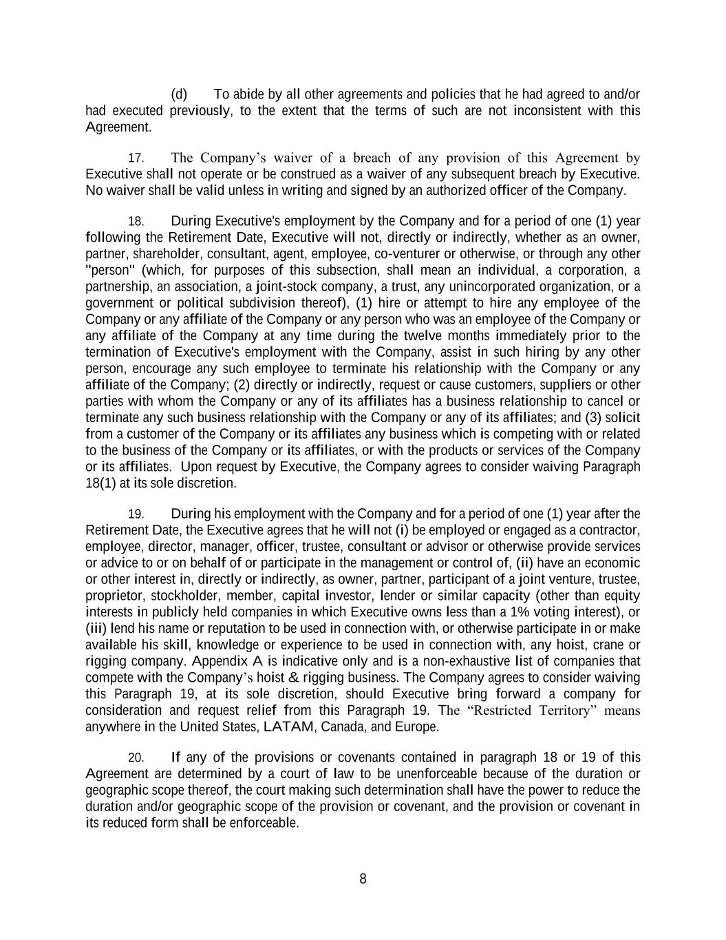 8 (d) To abide by all other agreements and policies that he had agreed to and/or had executed previously, to the extent that the terms of such are not inconsistent with this Agreement. 17. The Company’s waiver of a breach of any provision of this Agreement by Executive shall not operate or be construed as a waiver of any subsequent breach by Executive. No waiver shall be valid unless in writing and signed by an authorized officer of the Company. 18. During Executive's employment by the Company and for a period of one (1) year following the Retirement Date, Executive will not, directly or indirectly, whether as an owner, partner, shareholder, consultant, agent, employee, co-venturer or otherwise, or through any other "person" (which, for purposes of this subsection, shall mean an individual, a corporation, a partnership, an association, a joint-stock company, a trust, any unincorporated organization, or a government or political subdivision thereof), (1) hire or attempt to hire any employee of the Company or any affiliate of the Company or any person who was an employee of the Company or any affiliate of the Company at any time during the twelve months immediately prior to the termination of Executive's employment with the Company, assist in such hiring by any other person, encourage any such employee to terminate his relationship with the Company or any affiliate of the Company; (2) directly or indirectly, request or cause customers, suppliers or other parties with whom the Company or any of its affiliates has a business relationship to cancel or terminate any such business relationship with the Company or any of its affiliates; and (3) solicit from a customer of the Company or its affiliates any business which is competing with or related to the business of the Company or its affiliates, or with the products or services of the Company or its affiliates. Upon request by Executive, the Company agrees to consider waiving Paragraph 18(1) at its sole discretion. 19. During his employment with the Company and for a period of one (1) year after the Retirement Date, the Executive agrees that he will not (i) be employed or engaged as a contractor, employee, director, manager, officer, trustee, consultant or advisor or otherwise provide services or advice to or on behalf of or participate in the management or control of, (ii) have an economic or other interest in, directly or indirectly, as owner, partner, participant of a joint venture, trustee, proprietor, stockholder, member, capital investor, lender or similar capacity (other than equity interests in publicly held companies in which Executive owns less than a 1% voting interest), or (iii) lend his name or reputation to be used in connection with, or otherwise participate in or make available his skill, knowledge or experience to be used in connection with, any hoist, crane or rigging company. Appendix A is indicative only and is a non-exhaustive list of companies that compete with the Company’s hoist & rigging business. The Company agrees to consider waiving this Paragraph 19, at its sole discretion, should Executive bring forward a company for consideration and request relief from this Paragraph 19. The “Restricted Territory” means anywhere in the United States, LATAM, Canada, and Europe. 20. If any of the provisions or covenants contained in paragraph 18 or 19 of this Agreement are determined by a court of law to be unenforceable because of the duration or geographic scope thereof, the court making such determination shall have the power to reduce the duration and/or geographic scope of the provision or covenant, and the provision or covenant in its reduced form shall be enforceable.
