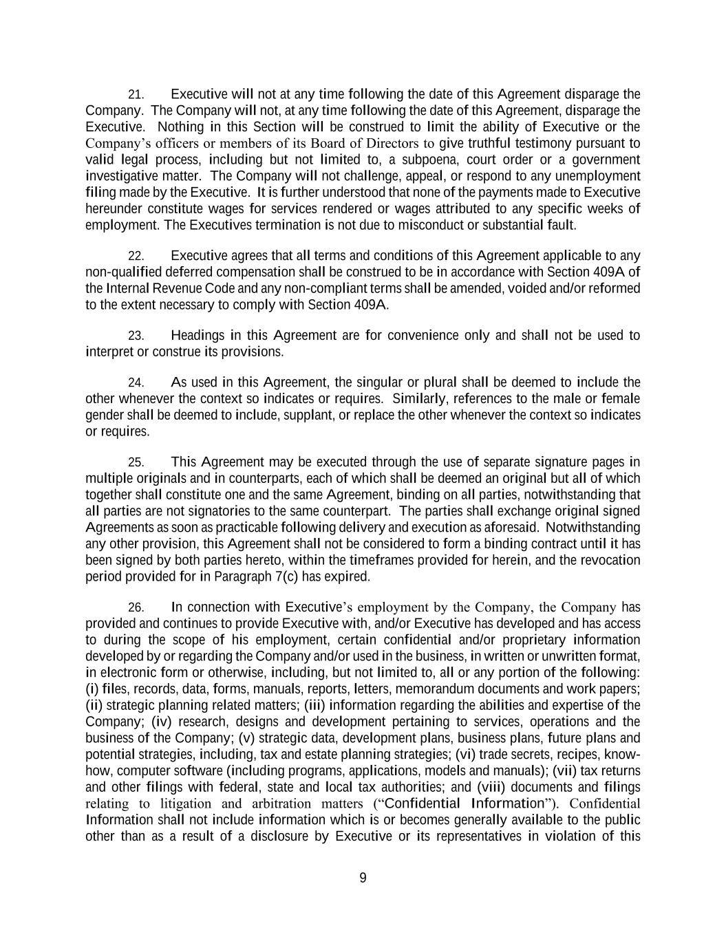 9 21. Executive will not at any time following the date of this Agreement disparage the Company. The Company will not, at any time following the date of this Agreement, disparage the Executive. Nothing in this Section will be construed to limit the ability of Executive or the Company’s officers or members of its Board of Directors to give truthful testimony pursuant to valid legal process, including but not limited to, a subpoena, court order or a government investigative matter. The Company will not challenge, appeal, or respond to any unemployment filing made by the Executive. It is further understood that none of the payments made to Executive hereunder constitute wages for services rendered or wages attributed to any specific weeks of employment. The Executives termination is not due to misconduct or substantial fault. 22. Executive agrees that all terms and conditions of this Agreement applicable to any non-qualified deferred compensation shall be construed to be in accordance with Section 409A of the Internal Revenue Code and any non-compliant terms shall be amended, voided and/or reformed to the extent necessary to comply with Section 409A. 23. Headings in this Agreement are for convenience only and shall not be used to interpret or construe its provisions. 24. As used in this Agreement, the singular or plural shall be deemed to include the other whenever the context so indicates or requires. Similarly, references to the male or female gender shall be deemed to include, supplant, or replace the other whenever the context so indicates or requires. 25. This Agreement may be executed through the use of separate signature pages in multiple originals and in counterparts, each of which shall be deemed an original but all of which together shall constitute one and the same Agreement, binding on all parties, notwithstanding that all parties are not signatories to the same counterpart. The parties shall exchange original signed Agreements as soon as practicable following delivery and execution as aforesaid. Notwithstanding any other provision, this Agreement shall not be considered to form a binding contract until it has been signed by both parties hereto, within the timeframes provided for herein, and the revocation period provided for in Paragraph 7(c) has expired. 26. In connection with Executive’s employment by the Company, the Company has provided and continues to provide Executive with, and/or Executive has developed and has access to during the scope of his employment, certain confidential and/or proprietary information developed by or regarding the Company and/or used in the business, in written or unwritten format, in electronic form or otherwise, including, but not limited to, all or any portion of the following: (i) files, records, data, forms, manuals, reports, letters, memorandum documents and work papers; (ii) strategic planning related matters; (iii) information regarding the abilities and expertise of the Company; (iv) research, designs and development pertaining to services, operations and the business of the Company; (v) strategic data, development plans, business plans, future plans and potential strategies, including, tax and estate planning strategies; (vi) trade secrets, recipes, know- how, computer software (including programs, applications, models and manuals); (vii) tax returns and other filings with federal, state and local tax authorities; and (viii) documents and filings relating to litigation and arbitration matters (“Confidential Information”). Confidential Information shall not include information which is or becomes generally available to the public other than as a result of a disclosure by Executive or its representatives in violation of this