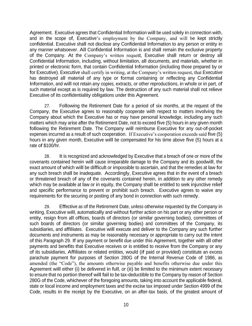 10 Agreement. Executive agrees that Confidential Information will be used solely in connection with, and in the scope of, Executive’s employment by the Company, and will be kept strictly confidential. Executive shall not disclose any Confidential Information to any person or entity in any manner whatsoever. All Confidential Information is and shall remain the exclusive property of the Company. At the Company’s written request, Executive shall return or destroy all Confidential Information, including, without limitation, all documents, and materials, whether in printed or electronic form, that contain Confidential Information (including those prepared by or for Executive). Executive shall certify in writing, at the Company’s written request, that Executive has destroyed all material of any type or format containing or reflecting any Confidential Information, and will not retain any copies, extracts, or other reproductions, in whole or in part, of such material except as is required by law. The destruction of any such material shall not relieve Executive of its confidentiality obligations under this Agreement. 27. Following the Retirement Date for a period of six months, at the request of the Company, the Executive agrees to reasonably cooperate with respect to matters involving the Company about which the Executive has or may have personal knowledge, including any such matters which may arise after the Retirement Date, not to exceed five (5) hours in any given month following the Retirement Date. The Company will reimburse Executive for any out-of-pocket expenses incurred as a result of such cooperation. If Executive’s cooperation exceeds said five (5) hours in any given month, Executive will be compensated for his time above five (5) hours at a rate of $100/hr. 28. It is recognized and acknowledged by Executive that a breach of one or more of the covenants contained herein will cause irreparable damage to the Company and its goodwill, the exact amount of which will be difficult or impossible to ascertain, and that the remedies at law for any such breach shall be inadequate. Accordingly, Executive agrees that in the event of a breach or threatened breach of any of the covenants contained herein, in addition to any other remedy which may be available at law or in equity, the Company shall be entitled to seek injunctive relief and specific performance to prevent or prohibit such breach. Executive agrees to waive any requirements for the securing or posting of any bond in connection with such remedy. 29. Effective as of the Retirement Date, unless otherwise requested by the Company in writing, Executive will, automatically and without further action on his part or any other person or entity, resign from all offices, boards of directors (or similar governing bodies), committees of such boards of directors (or similar governing bodies) and committees of the Company, its subsidiaries, and affiliates. Executive will execute and deliver to the Company any such further documents and instruments as may be reasonably necessary or appropriate to carry out the intent of this Paragraph 29. If any payment or benefit due under this Agreement, together with all other payments and benefits that Executive receives or is entitled to receive from the Company or any of its subsidiaries, Affiliates or related entities, would (if paid or provided) constitute an excess parachute payment for purposes of Section 280G of the Internal Revenue Code of 1986, as amended (the “Code”), the amounts otherwise payable and benefits otherwise due under this Agreement will either (i) be delivered in full, or (ii) be limited to the minimum extent necessary to ensure that no portion thereof will fail to be tax-deductible to the Company by reason of Section 280G of the Code, whichever of the foregoing amounts, taking into account the applicable federal, state or local income and employment taxes and the excise tax imposed under Section 4999 of the Code, results in the receipt by the Executive, on an after-tax basis, of the greatest amount of