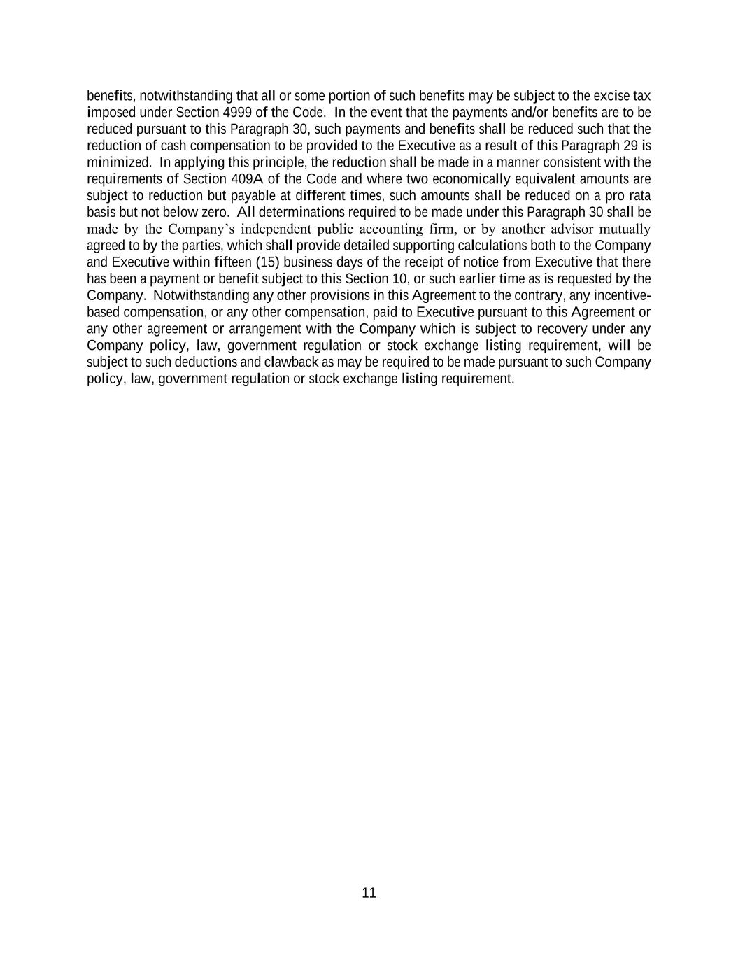 11 benefits, notwithstanding that all or some portion of such benefits may be subject to the excise tax imposed under Section 4999 of the Code. In the event that the payments and/or benefits are to be reduced pursuant to this Paragraph 30, such payments and benefits shall be reduced such that the reduction of cash compensation to be provided to the Executive as a result of this Paragraph 29 is minimized. In applying this principle, the reduction shall be made in a manner consistent with the requirements of Section 409A of the Code and where two economically equivalent amounts are subject to reduction but payable at different times, such amounts shall be reduced on a pro rata basis but not below zero. All determinations required to be made under this Paragraph 30 shall be made by the Company’s independent public accounting firm, or by another advisor mutually agreed to by the parties, which shall provide detailed supporting calculations both to the Company and Executive within fifteen (15) business days of the receipt of notice from Executive that there has been a payment or benefit subject to this Section 10, or such earlier time as is requested by the Company. Notwithstanding any other provisions in this Agreement to the contrary, any incentive- based compensation, or any other compensation, paid to Executive pursuant to this Agreement or any other agreement or arrangement with the Company which is subject to recovery under any Company policy, law, government regulation or stock exchange listing requirement, will be subject to such deductions and clawback as may be required to be made pursuant to such Company policy, law, government regulation or stock exchange listing requirement.