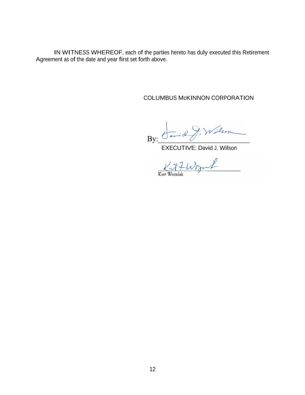 12 IN WITNESS WHEREOF, each of the parties hereto has duly executed this Retirement Agreement as of the date and year first set forth above. COLUMBUS McKINNON CORPORATION EXECUTIVE: David J. Wilson
