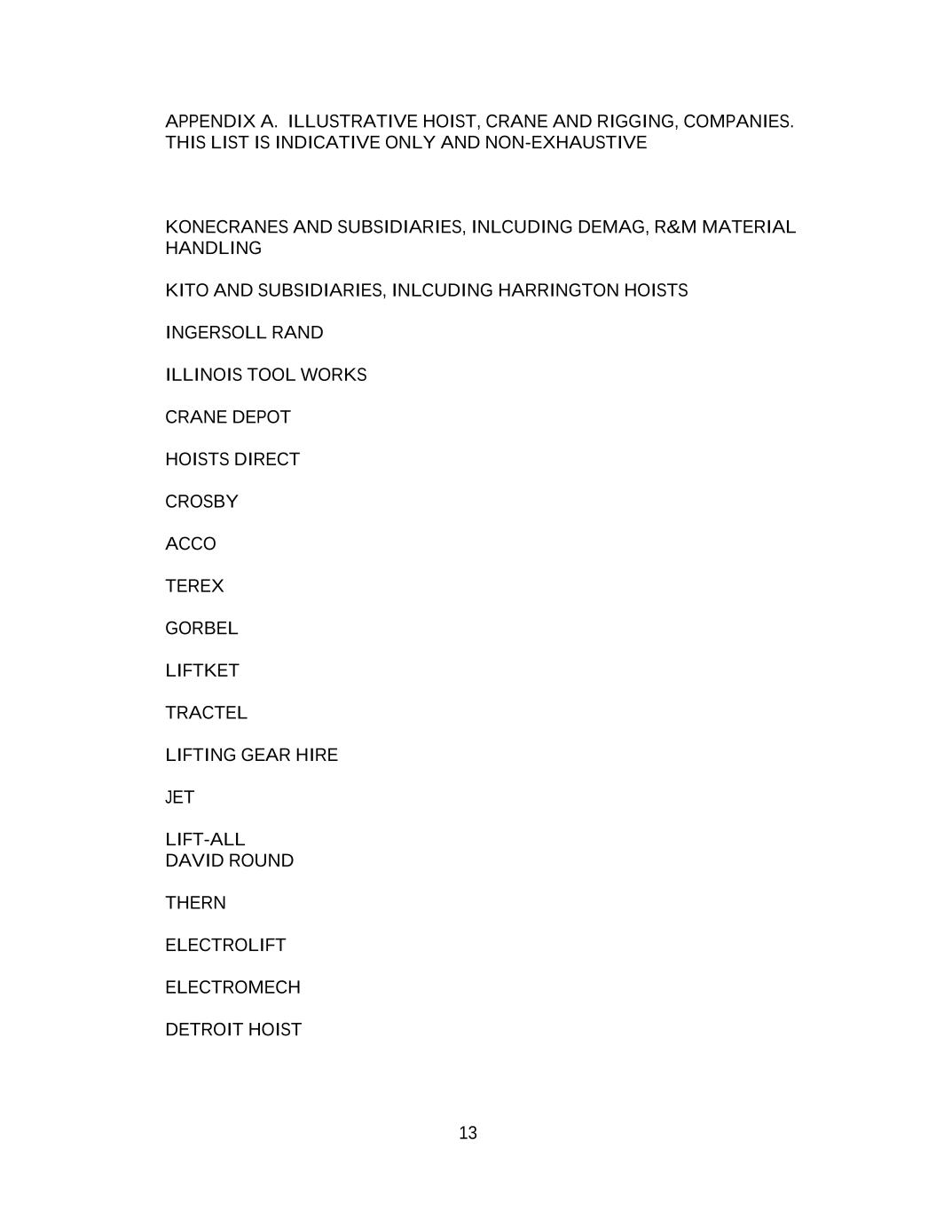 13 APPENDIX A. ILLUSTRATIVE HOIST, CRANE AND RIGGING, COMPANIES. THIS LIST IS INDICATIVE ONLY AND NON-EXHAUSTIVE KONECRANES AND SUBSIDIARIES, INLCUDING DEMAG, R&M MATERIAL HANDLING KITO AND SUBSIDIARIES, INLCUDING HARRINGTON HOISTS INGERSOLL RAND ILLINOIS TOOL WORKS CRANE DEPOT HOISTS DIRECT CROSBY ACCO TEREX GORBEL LIFTKET TRACTEL LIFTING GEAR HIRE JET LIFT-ALL DAVID ROUND THERN ELECTROLIFT ELECTROMECH DETROIT HOIST