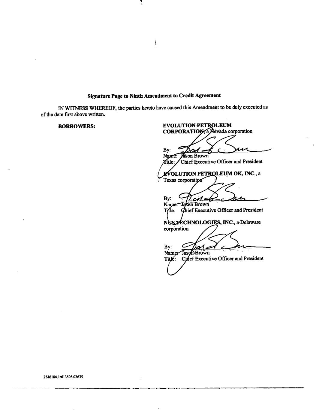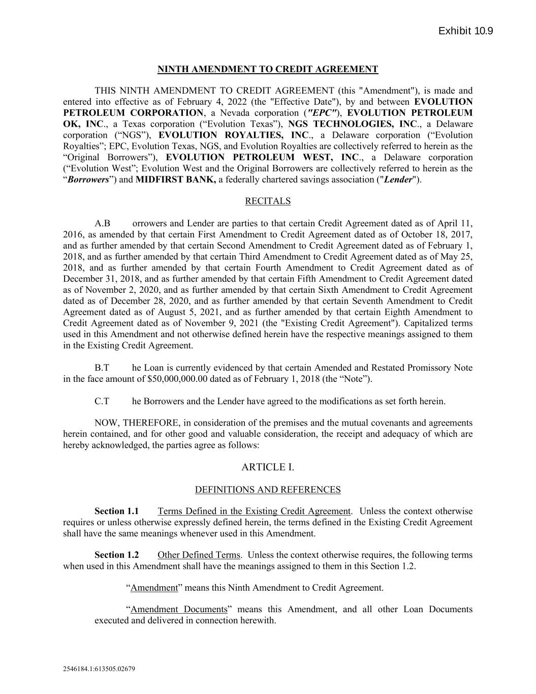 2546184.1:613505.02679 Exhibit 10.9 NINTH AMENDMENT TO CREDIT AGREEMENT THIS NINTH AMENDMENT TO CREDIT AGREEMENT (this "Amendment"), is made and entered into effective as of February 4, 2022 (the "Effective Date"), by and between EVOLUTION PETROLEUM CORPORATION, a Nevada corporation ("EPC"), EVOLUTION PETROLEUM OK, INC., a Texas corporation (“Evolution Texas”), NGS TECHNOLOGIES, INC., a Delaware corporation (“NGS”), EVOLUTION ROYALTIES, INC., a Delaware corporation (“Evolution Royalties”; EPC, Evolution Texas, NGS, and Evolution Royalties are collectively referred to herein as the “Original Borrowers”), EVOLUTION PETROLEUM WEST, INC., a Delaware corporation (“Evolution West”; Evolution West and the Original Borrowers are collectively referred to herein as the “Borrowers”) and MIDFIRST BANK, a federally chartered savings association ("Lender"). RECITALS A.B orrowers and Lender are parties to that certain Credit Agreement dated as of April 11, 2016, as amended by that certain First Amendment to Credit Agreement dated as of October 18, 2017, and as further amended by that certain Second Amendment to Credit Agreement dated as of February 1, 2018, and as further amended by that certain Third Amendment to Credit Agreement dated as of May 25, 2018, and as further amended by that certain Fourth Amendment to Credit Agreement dated as of December 31, 2018, and as further amended by that certain Fifth Amendment to Credit Agreement dated as of November 2, 2020, and as further amended by that certain Sixth Amendment to Credit Agreement dated as of December 28, 2020, and as further amended by that certain Seventh Amendment to Credit Agreement dated as of August 5, 2021, and as further amended by that certain Eighth Amendment to Credit Agreement dated as of November 9, 2021 (the "Existing Credit Agreement"). Capitalized terms used in this Amendment and not otherwise defined herein have the respective meanings assigned to them in the Existing Credit Agreement. B.T he Loan is currently evidenced by that certain Amended and Restated Promissory Note in the face amount of $50,000,000.00 dated as of February 1, 2018 (the “Note”). C.T he Borrowers and the Lender have agreed to the modifications as set forth herein. NOW, THEREFORE, in consideration of the premises and the mutual covenants and agreements herein contained, and for other good and valuable consideration, the receipt and adequacy of which are hereby acknowledged, the parties agree as follows: ARTICLE I. DEFINITIONS AND REFERENCES Section 1.1 Terms Defined in the Existing Credit Agreement. Unless the context otherwise requires or unless otherwise expressly defined herein, the terms defined in the Existing Credit Agreement shall have the same meanings whenever used in this Amendment. Section 1.2 Other Defined Terms. Unless the context otherwise requires, the following terms when used in this Amendment shall have the meanings assigned to them in this Section 1.2. “Amendment” means this Ninth Amendment to Credit Agreement. “Amendment Documents” means this Amendment, and all other Loan Documents executed and delivered in connection herewith.