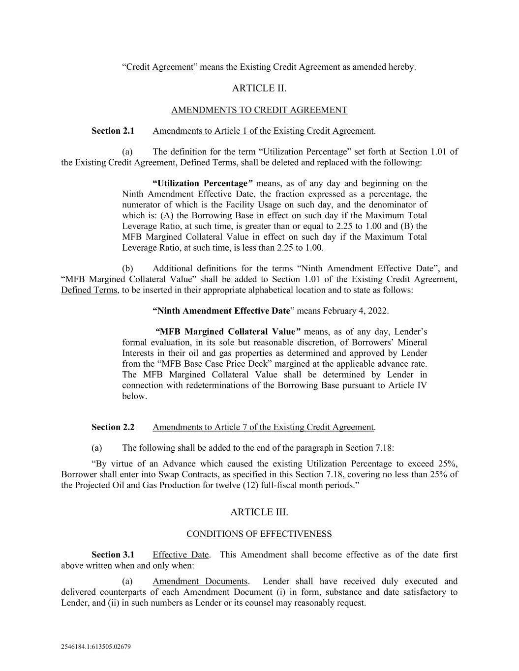 2546184.1:613505.02679 “Credit Agreement” means the Existing Credit Agreement as amended hereby. ARTICLE II. AMENDMENTS TO CREDIT AGREEMENT Section 2.1 Amendments to Article 1 of the Existing Credit Agreement. (a) The definition for the term “Utilization Percentage” set forth at Section 1.01 of the Existing Credit Agreement, Defined Terms, shall be deleted and replaced with the following: “Utilization Percentage” means, as of any day and beginning on the Ninth Amendment Effective Date, the fraction expressed as a percentage, the numerator of which is the Facility Usage on such day, and the denominator of which is: (A) the Borrowing Base in effect on such day if the Maximum Total Leverage Ratio, at such time, is greater than or equal to 2.25 to 1.00 and (B) the MFB Margined Collateral Value in effect on such day if the Maximum Total Leverage Ratio, at such time, is less than 2.25 to 1.00. (b) Additional definitions for the terms “Ninth Amendment Effective Date”, and “MFB Margined Collateral Value” shall be added to Section 1.01 of the Existing Credit Agreement, Defined Terms, to be inserted in their appropriate alphabetical location and to state as follows: “Ninth Amendment Effective Date” means February 4, 2022. “MFB Margined Collateral Value” means, as of any day, Lender’s formal evaluation, in its sole but reasonable discretion, of Borrowers’ Mineral Interests in their oil and gas properties as determined and approved by Lender from the “MFB Base Case Price Deck” margined at the applicable advance rate. The MFB Margined Collateral Value shall be determined by Lender in connection with redeterminations of the Borrowing Base pursuant to Article IV below. Section 2.2 Amendments to Article 7 of the Existing Credit Agreement. (a) The following shall be added to the end of the paragraph in Section 7.18: “By virtue of an Advance which caused the existing Utilization Percentage to exceed 25%, Borrower shall enter into Swap Contracts, as specified in this Section 7.18, covering no less than 25% of the Projected Oil and Gas Production for twelve (12) full-fiscal month periods.” ARTICLE III. CONDITIONS OF EFFECTIVENESS Section 3.1 Effective Date. This Amendment shall become effective as of the date first above written when and only when: (a) Amendment Documents. Lender shall have received duly executed and delivered counterparts of each Amendment Document (i) in form, substance and date satisfactory to Lender, and (ii) in such numbers as Lender or its counsel may reasonably request.