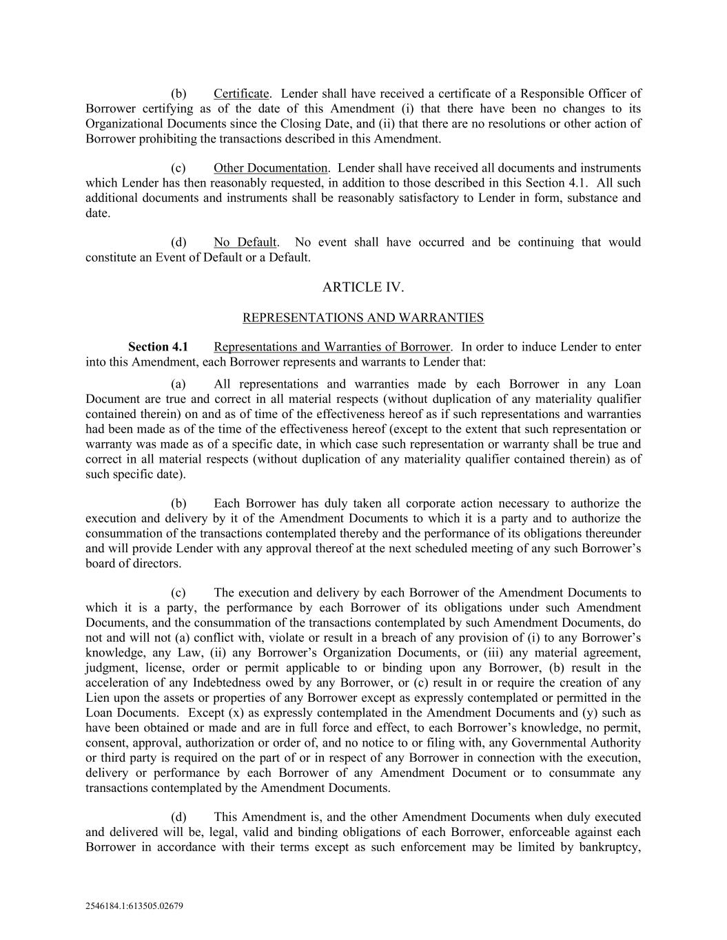 2546184.1:613505.02679 (b) Certificate. Lender shall have received a certificate of a Responsible Officer of Borrower certifying as of the date of this Amendment (i) that there have been no changes to its Organizational Documents since the Closing Date, and (ii) that there are no resolutions or other action of Borrower prohibiting the transactions described in this Amendment. (c) Other Documentation. Lender shall have received all documents and instruments which Lender has then reasonably requested, in addition to those described in this Section 4.1. All such additional documents and instruments shall be reasonably satisfactory to Lender in form, substance and date. (d) No Default. No event shall have occurred and be continuing that would constitute an Event of Default or a Default. ARTICLE IV. REPRESENTATIONS AND WARRANTIES Section 4.1 Representations and Warranties of Borrower. In order to induce Lender to enter into this Amendment, each Borrower represents and warrants to Lender that: (a) All representations and warranties made by each Borrower in any Loan Document are true and correct in all material respects (without duplication of any materiality qualifier contained therein) on and as of time of the effectiveness hereof as if such representations and warranties had been made as of the time of the effectiveness hereof (except to the extent that such representation or warranty was made as of a specific date, in which case such representation or warranty shall be true and correct in all material respects (without duplication of any materiality qualifier contained therein) as of such specific date). (b) Each Borrower has duly taken all corporate action necessary to authorize the execution and delivery by it of the Amendment Documents to which it is a party and to authorize the consummation of the transactions contemplated thereby and the performance of its obligations thereunder and will provide Lender with any approval thereof at the next scheduled meeting of any such Borrower’s board of directors. (c) The execution and delivery by each Borrower of the Amendment Documents to which it is a party, the performance by each Borrower of its obligations under such Amendment Documents, and the consummation of the transactions contemplated by such Amendment Documents, do not and will not (a) conflict with, violate or result in a breach of any provision of (i) to any Borrower’s knowledge, any Law, (ii) any Borrower’s Organization Documents, or (iii) any material agreement, judgment, license, order or permit applicable to or binding upon any Borrower, (b) result in the acceleration of any Indebtedness owed by any Borrower, or (c) result in or require the creation of any Lien upon the assets or properties of any Borrower except as expressly contemplated or permitted in the Loan Documents. Except (x) as expressly contemplated in the Amendment Documents and (y) such as have been obtained or made and are in full force and effect, to each Borrower’s knowledge, no permit, consent, approval, authorization or order of, and no notice to or filing with, any Governmental Authority or third party is required on the part of or in respect of any Borrower in connection with the execution, delivery or performance by each Borrower of any Amendment Document or to consummate any transactions contemplated by the Amendment Documents. (d) This Amendment is, and the other Amendment Documents when duly executed and delivered will be, legal, valid and binding obligations of each Borrower, enforceable against each Borrower in accordance with their terms except as such enforcement may be limited by bankruptcy,