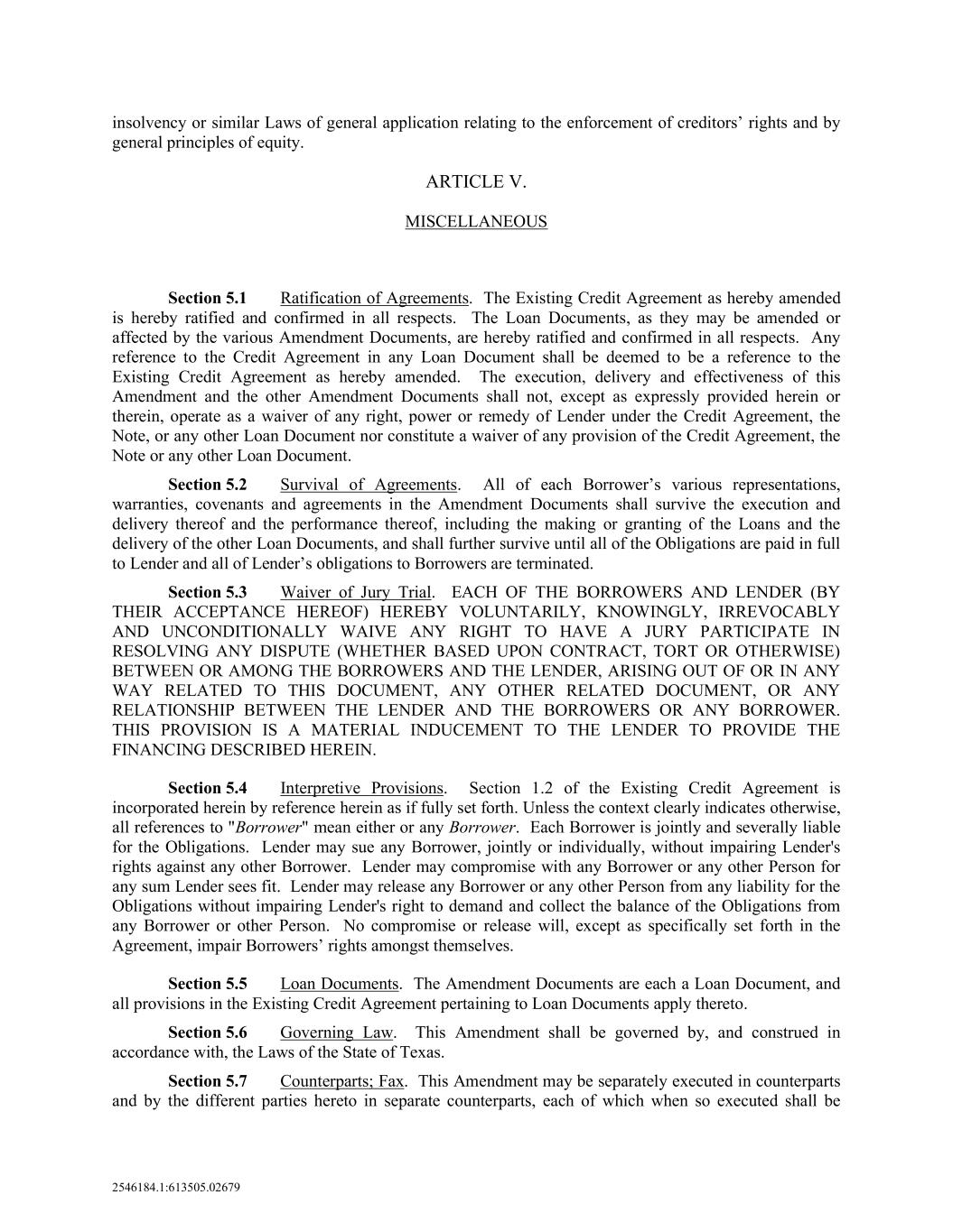 2546184.1:613505.02679 insolvency or similar Laws of general application relating to the enforcement of creditors’ rights and by general principles of equity. ARTICLE V. MISCELLANEOUS Section 5.1 Ratification of Agreements. The Existing Credit Agreement as hereby amended is hereby ratified and confirmed in all respects. The Loan Documents, as they may be amended or affected by the various Amendment Documents, are hereby ratified and confirmed in all respects. Any reference to the Credit Agreement in any Loan Document shall be deemed to be a reference to the Existing Credit Agreement as hereby amended. The execution, delivery and effectiveness of this Amendment and the other Amendment Documents shall not, except as expressly provided herein or therein, operate as a waiver of any right, power or remedy of Lender under the Credit Agreement, the Note, or any other Loan Document nor constitute a waiver of any provision of the Credit Agreement, the Note or any other Loan Document. Section 5.2 Survival of Agreements. All of each Borrower’s various representations, warranties, covenants and agreements in the Amendment Documents shall survive the execution and delivery thereof and the performance thereof, including the making or granting of the Loans and the delivery of the other Loan Documents, and shall further survive until all of the Obligations are paid in full to Lender and all of Lender’s obligations to Borrowers are terminated. Section 5.3 Waiver of Jury Trial. EACH OF THE BORROWERS AND LENDER (BY THEIR ACCEPTANCE HEREOF) HEREBY VOLUNTARILY, KNOWINGLY, IRREVOCABLY AND UNCONDITIONALLY WAIVE ANY RIGHT TO HAVE A JURY PARTICIPATE IN RESOLVING ANY DISPUTE (WHETHER BASED UPON CONTRACT, TORT OR OTHERWISE) BETWEEN OR AMONG THE BORROWERS AND THE LENDER, ARISING OUT OF OR IN ANY WAY RELATED TO THIS DOCUMENT, ANY OTHER RELATED DOCUMENT, OR ANY RELATIONSHIP BETWEEN THE LENDER AND THE BORROWERS OR ANY BORROWER. THIS PROVISION IS A MATERIAL INDUCEMENT TO THE LENDER TO PROVIDE THE FINANCING DESCRIBED HEREIN. Section 5.4 Interpretive Provisions. Section 1.2 of the Existing Credit Agreement is incorporated herein by reference herein as if fully set forth. Unless the context clearly indicates otherwise, all references to "Borrower" mean either or any Borrower. Each Borrower is jointly and severally liable for the Obligations. Lender may sue any Borrower, jointly or individually, without impairing Lender's rights against any other Borrower. Lender may compromise with any Borrower or any other Person for any sum Lender sees fit. Lender may release any Borrower or any other Person from any liability for the Obligations without impairing Lender's right to demand and collect the balance of the Obligations from any Borrower or other Person. No compromise or release will, except as specifically set forth in the Agreement, impair Borrowers’ rights amongst themselves. Section 5.5 Loan Documents. The Amendment Documents are each a Loan Document, and all provisions in the Existing Credit Agreement pertaining to Loan Documents apply thereto. Section 5.6 Governing Law. This Amendment shall be governed by, and construed in accordance with, the Laws of the State of Texas. Section 5.7 Counterparts; Fax. This Amendment may be separately executed in counterparts and by the different parties hereto in separate counterparts, each of which when so executed shall be