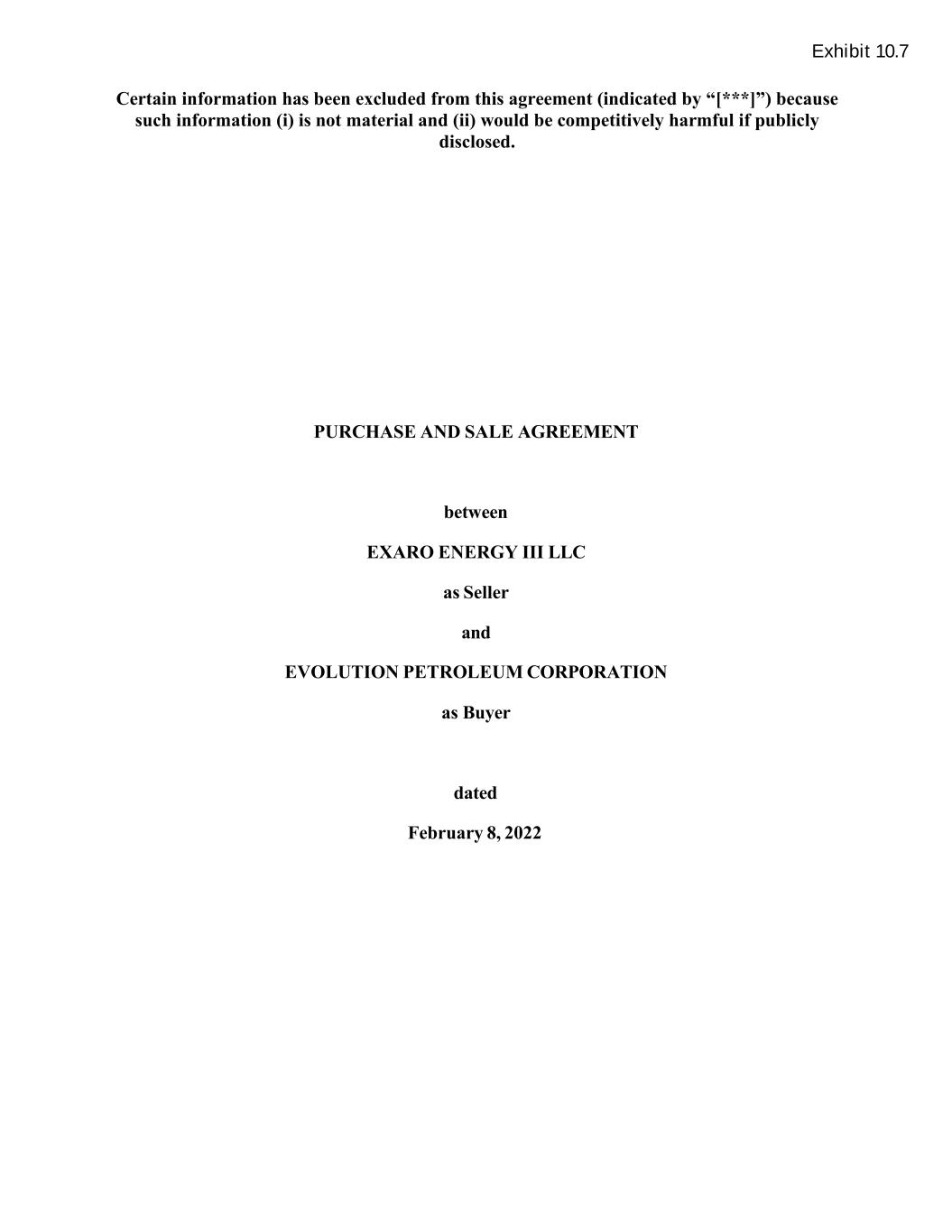 PURCHASE AND SALE AGREEMENT between EXARO ENERGY III LLC as Seller and EVOLUTION PETROLEUM CORPORATION as Buyer dated February 8, 2022 Exhibit 10.7 Certain information has been excluded from this agreement (indicated by “[***]”) because such information (i) is not material and (ii) would be competitively harmful if publicly disclosed.