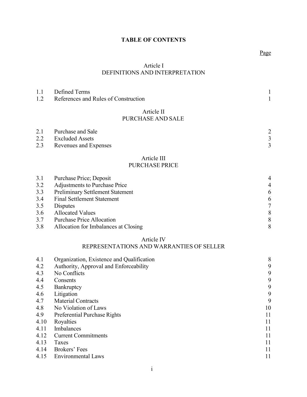 i TABLE OF CONTENTS Article I DEFINITIONS AND INTERPRETATION Page 1.1 Defined Terms 1 1.2 References and Rules of Construction 1 Article II PURCHASE AND SALE 2.1 Purchase and Sale 2 2.2 Excluded Assets 3 2.3 Revenues and Expenses 3 Article III PURCHASE PRICE 3.1 Purchase Price; Deposit 4 3.2 Adjustments to Purchase Price 4 3.3 Preliminary Settlement Statement 6 3.4 Final Settlement Statement 6 3.5 Disputes 7 3.6 Allocated Values 8 3.7 Purchase Price Allocation 8 3.8 Allocation for Imbalances at Closing 8 Article IV REPRESENTATIONS AND WARRANTIES OF SELLER 4.1 Organization, Existence and Qualification 8 4.2 Authority, Approval and Enforceability 9 4.3 No Conflicts 9 4.4 Consents 9 4.5 Bankruptcy 9 4.6 Litigation 9 4.7 Material Contracts 9 4.8 No Violation of Laws 10 4.9 Preferential Purchase Rights 11 4.10 Royalties 11 4.11 Imbalances 11 4.12 Current Commitments 11 4.13 Taxes 11 4.14 Brokers’ Fees 11 4.15 Environmental Laws 11
