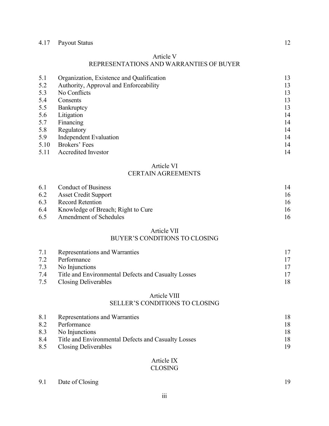 iii 4.17 Payout Status 12 Article V REPRESENTATIONS AND WARRANTIES OF BUYER 5.1 Organization, Existence and Qualification 13 5.2 Authority, Approval and Enforceability 13 5.3 No Conflicts 13 5.4 Consents 13 5.5 Bankruptcy 13 5.6 Litigation 14 5.7 Financing 14 5.8 Regulatory 14 5.9 Independent Evaluation 14 5.10 Brokers’ Fees 14 5.11 Accredited Investor 14 Article VI CERTAIN AGREEMENTS 6.1 Conduct of Business 14 6.2 Asset Credit Support 16 6.3 Record Retention 16 6.4 Knowledge of Breach; Right to Cure 16 6.5 Amendment of Schedules 16 Article VII BUYER’S CONDITIONS TO CLOSING 7.1 Representations and Warranties 17 7.2 Performance 17 7.3 No Injunctions 17 7.4 Title and Environmental Defects and Casualty Losses 17 7.5 Closing Deliverables 18 Article VIII SELLER’S CONDITIONS TO CLOSING 8.1 Representations and Warranties 18 8.2 Performance 18 8.3 No Injunctions 18 8.4 Title and Environmental Defects and Casualty Losses 18 8.5 Closing Deliverables 19 Article IX CLOSING 9.1 Date of Closing 19