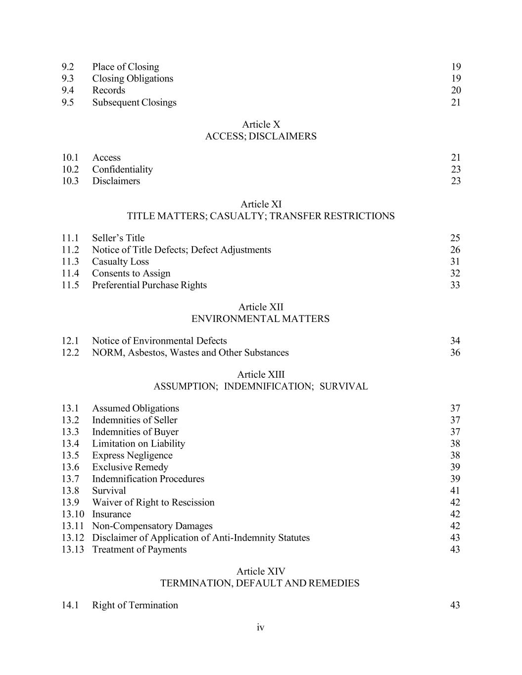 iv 9.2 Place of Closing 19 9.3 Closing Obligations 19 9.4 Records 20 9.5 Subsequent Closings 21 Article X ACCESS; DISCLAIMERS 10.1 Access 21 10.2 Confidentiality 23 10.3 Disclaimers 23 Article XI TITLE MATTERS; CASUALTY; TRANSFER RESTRICTIONS 11.1 Seller’s Title 25 11.2 Notice of Title Defects; Defect Adjustments 26 11.3 Casualty Loss 31 11.4 Consents to Assign 32 11.5 Preferential Purchase Rights 33 Article XII ENVIRONMENTAL MATTERS 12.1 Notice of Environmental Defects 34 12.2 NORM, Asbestos, Wastes and Other Substances 36 Article XIII ASSUMPTION; INDEMNIFICATION; SURVIVAL 13.1 Assumed Obligations 37 13.2 Indemnities of Seller 37 13.3 Indemnities of Buyer 37 13.4 Limitation on Liability 38 13.5 Express Negligence 38 13.6 Exclusive Remedy 39 13.7 Indemnification Procedures 39 13.8 Survival 41 13.9 Waiver of Right to Rescission 42 13.10 Insurance 42 13.11 Non-Compensatory Damages 42 13.12 Disclaimer of Application of Anti-Indemnity Statutes 43 13.13 Treatment of Payments 43 Article XIV TERMINATION, DEFAULT AND REMEDIES 14.1 Right of Termination 43
