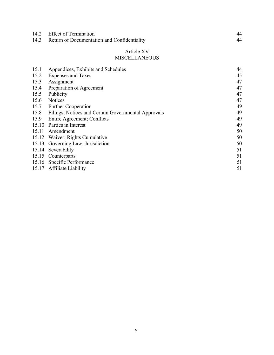 v 14.2 Effect of Termination 44 14.3 Return of Documentation and Confidentiality 44 Article XV MISCELLANEOUS 15.1 Appendices, Exhibits and Schedules 44 15.2 Expenses and Taxes 45 15.3 Assignment 47 15.4 Preparation of Agreement 47 15.5 Publicity 47 15.6 Notices 47 15.7 Further Cooperation 49 15.8 Filings, Notices and Certain Governmental Approvals 49 15.9 Entire Agreement; Conflicts 49 15.10 Parties in Interest 49 15.11 Amendment 50 15.12 Waiver; Rights Cumulative 50 15.13 Governing Law; Jurisdiction 50 15.14 Severability 51 15.15 Counterparts 51 15.16 Specific Performance 51 15.17 Affiliate Liability 51