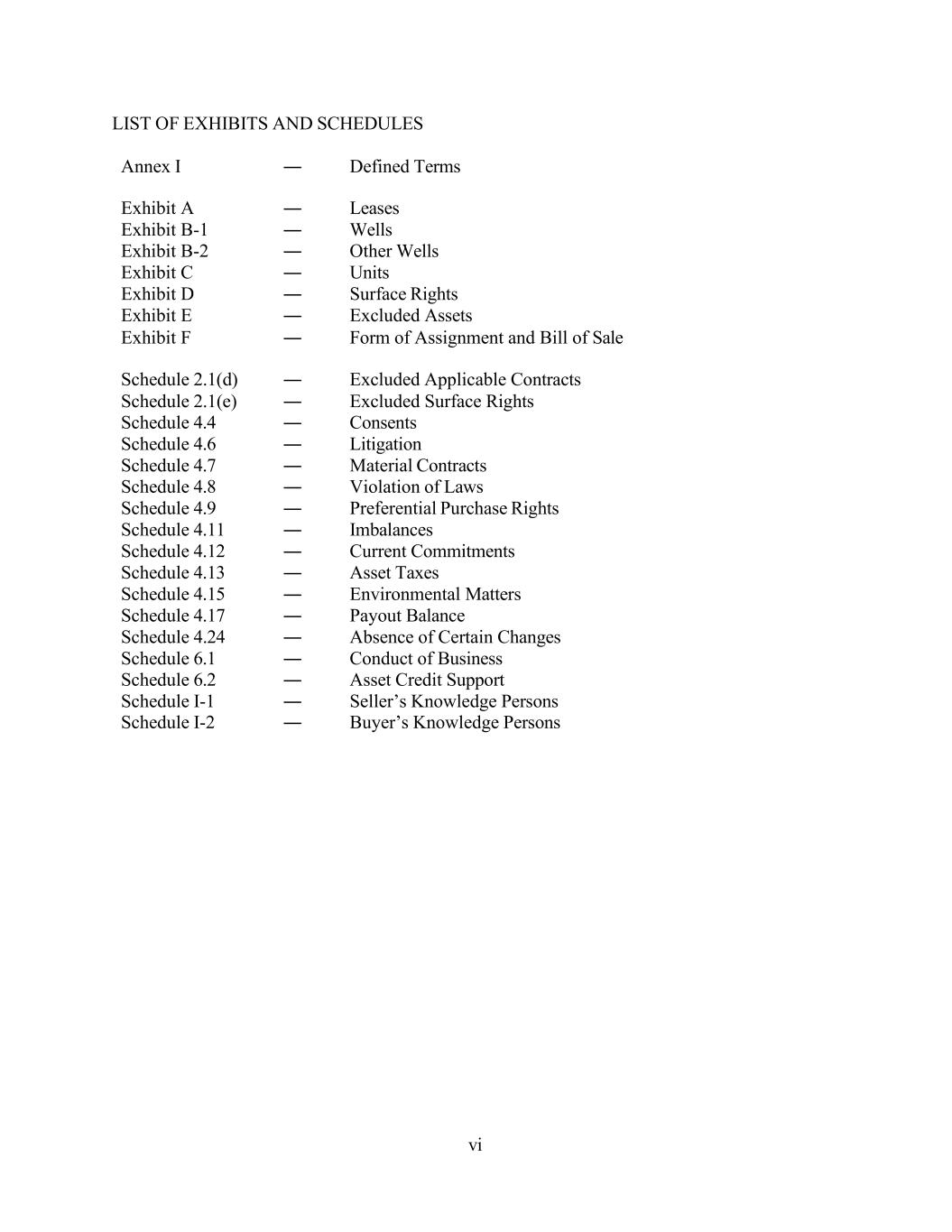 vi LIST OF EXHIBITS AND SCHEDULES Annex I ― Defined Terms Exhibit A ― Leases Exhibit B-1 ― Wells Exhibit B-2 ― Other Wells Exhibit C ― Units Exhibit D ― Surface Rights Exhibit E ― Excluded Assets Exhibit F ― Form of Assignment and Bill of Sale Schedule 2.1(d) ― Excluded Applicable Contracts Schedule 2.1(e) ― Excluded Surface Rights Schedule 4.4 ― Consents Schedule 4.6 ― Litigation Schedule 4.7 ― Material Contracts Schedule 4.8 ― Violation of Laws Schedule 4.9 ― Preferential Purchase Rights Schedule 4.11 ― Imbalances Schedule 4.12 ― Current Commitments Schedule 4.13 ― Asset Taxes Schedule 4.15 ― Environmental Matters Schedule 4.17 ― Payout Balance Schedule 4.24 ― Absence of Certain Changes Schedule 6.1 ― Conduct of Business Schedule 6.2 ― Asset Credit Support Schedule I-1 ― Seller’s Knowledge Persons Schedule I-2 ― Buyer’s Knowledge Persons