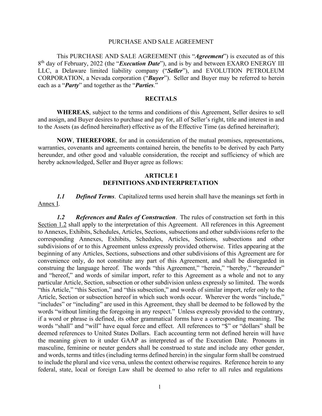 1 PURCHASE AND SALE AGREEMENT This PURCHASE AND SALE AGREEMENT (this “Agreement”) is executed as of this 8th day of February, 2022 (the “Execution Date”), and is by and between EXARO ENERGY III LLC, a Delaware limited liability company (“Seller”), and EVOLUTION PETROLEUM CORPORATION, a Nevada corporation (“Buyer”). Seller and Buyer may be referred to herein each as a “Party” and together as the “Parties.” RECITALS WHEREAS, subject to the terms and conditions of this Agreement, Seller desires to sell and assign, and Buyer desires to purchase and pay for, all of Seller’s right, title and interest in and to the Assets (as defined hereinafter) effective as of the Effective Time (as defined hereinafter); NOW, THEREFORE, for and in consideration of the mutual promises, representations, warranties, covenants and agreements contained herein, the benefits to be derived by each Party hereunder, and other good and valuable consideration, the receipt and sufficiency of which are hereby acknowledged, Seller and Buyer agree as follows: ARTICLE I DEFINITIONS AND INTERPRETATION 1.1 Defined Terms. Capitalized terms used herein shall have the meanings set forth in Annex I. 1.2 References and Rules of Construction. The rules of construction set forth in this Section 1.2 shall apply to the interpretation of this Agreement. All references in this Agreement to Annexes, Exhibits, Schedules, Articles, Sections, subsections and other subdivisions refer to the corresponding Annexes, Exhibits, Schedules, Articles, Sections, subsections and other subdivisions of or to this Agreement unless expressly provided otherwise. Titles appearing at the beginning of any Articles, Sections, subsections and other subdivisions of this Agreement are for convenience only, do not constitute any part of this Agreement, and shall be disregarded in construing the language hereof. The words “this Agreement,” “herein,” “hereby,” “hereunder” and “hereof,” and words of similar import, refer to this Agreement as a whole and not to any particular Article, Section, subsection or other subdivision unless expressly so limited. The words “this Article,” “this Section,” and “this subsection,” and words of similar import, refer only to the Article, Section or subsection hereof in which such words occur. Wherever the words “include,” “includes” or “including” are used in this Agreement, they shall be deemed to be followed by the words “without limiting the foregoing in any respect.” Unless expressly provided to the contrary, if a word or phrase is defined, its other grammatical forms have a corresponding meaning. The words “shall” and “will” have equal force and effect. All references to “$” or “dollars” shall be deemed references to United States Dollars. Each accounting term not defined herein will have the meaning given to it under GAAP as interpreted as of the Execution Date. Pronouns in masculine, feminine or neuter genders shall be construed to state and include any other gender, and words, terms and titles (including terms defined herein) in the singular form shall be construed to include the plural and vice versa, unless the context otherwise requires. Reference herein to any federal, state, local or foreign Law shall be deemed to also refer to all rules and regulations
