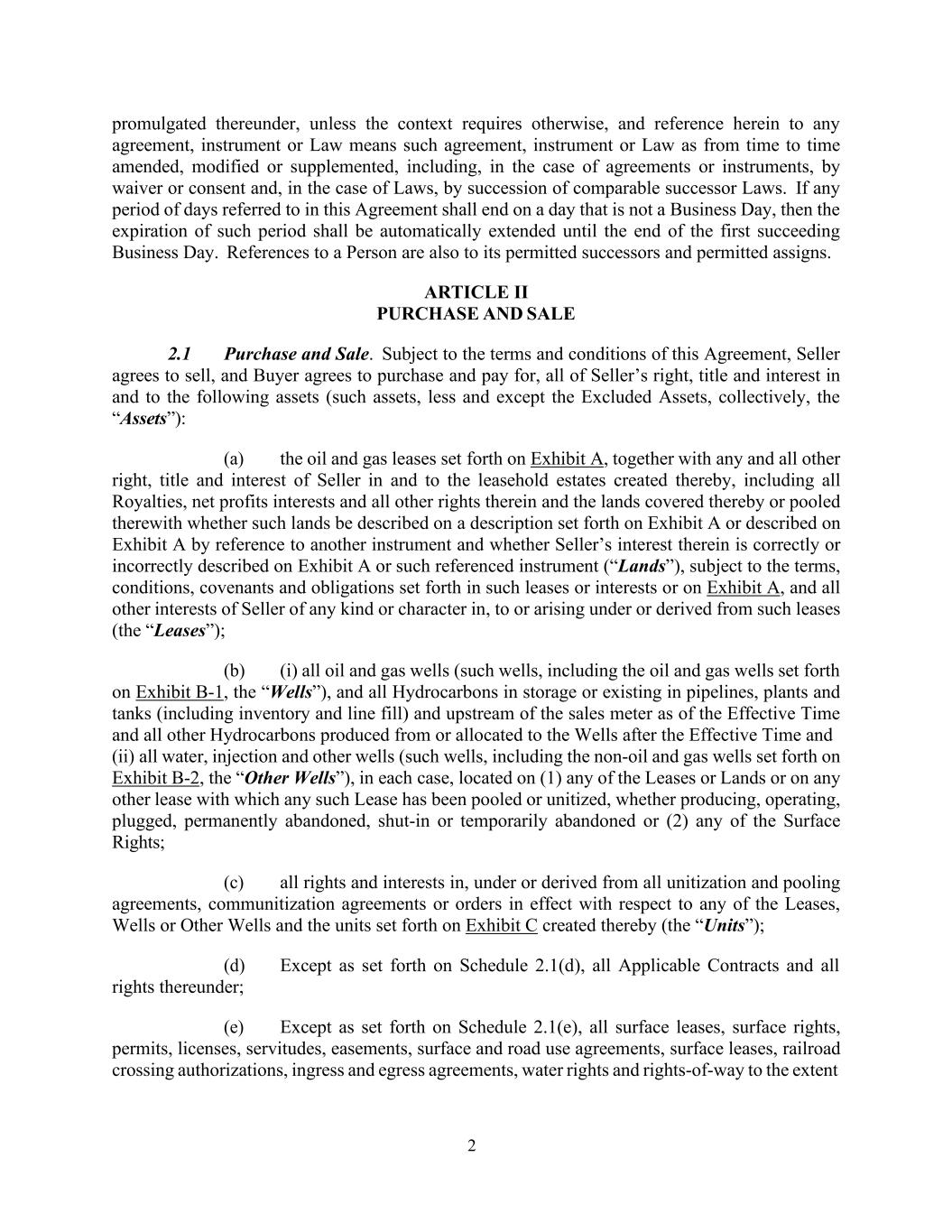 2 promulgated thereunder, unless the context requires otherwise, and reference herein to any agreement, instrument or Law means such agreement, instrument or Law as from time to time amended, modified or supplemented, including, in the case of agreements or instruments, by waiver or consent and, in the case of Laws, by succession of comparable successor Laws. If any period of days referred to in this Agreement shall end on a day that is not a Business Day, then the expiration of such period shall be automatically extended until the end of the first succeeding Business Day. References to a Person are also to its permitted successors and permitted assigns. ARTICLE II PURCHASE AND SALE 2.1 Purchase and Sale. Subject to the terms and conditions of this Agreement, Seller agrees to sell, and Buyer agrees to purchase and pay for, all of Seller’s right, title and interest in and to the following assets (such assets, less and except the Excluded Assets, collectively, the “Assets”): (a) the oil and gas leases set forth on Exhibit A, together with any and all other right, title and interest of Seller in and to the leasehold estates created thereby, including all Royalties, net profits interests and all other rights therein and the lands covered thereby or pooled therewith whether such lands be described on a description set forth on Exhibit A or described on Exhibit A by reference to another instrument and whether Seller’s interest therein is correctly or incorrectly described on Exhibit A or such referenced instrument (“Lands”), subject to the terms, conditions, covenants and obligations set forth in such leases or interests or on Exhibit A, and all other interests of Seller of any kind or character in, to or arising under or derived from such leases (the “Leases”); (b) (i) all oil and gas wells (such wells, including the oil and gas wells set forth on Exhibit B-1, the “Wells”), and all Hydrocarbons in storage or existing in pipelines, plants and tanks (including inventory and line fill) and upstream of the sales meter as of the Effective Time and all other Hydrocarbons produced from or allocated to the Wells after the Effective Time and (ii) all water, injection and other wells (such wells, including the non-oil and gas wells set forth on Exhibit B-2, the “Other Wells”), in each case, located on (1) any of the Leases or Lands or on any other lease with which any such Lease has been pooled or unitized, whether producing, operating, plugged, permanently abandoned, shut-in or temporarily abandoned or (2) any of the Surface Rights; (c) all rights and interests in, under or derived from all unitization and pooling agreements, communitization agreements or orders in effect with respect to any of the Leases, Wells or Other Wells and the units set forth on Exhibit C created thereby (the “Units”); (d) Except as set forth on Schedule 2.1(d), all Applicable Contracts and all rights thereunder; (e) Except as set forth on Schedule 2.1(e), all surface leases, surface rights, permits, licenses, servitudes, easements, surface and road use agreements, surface leases, railroad crossing authorizations, ingress and egress agreements, water rights and rights-of-way to the extent