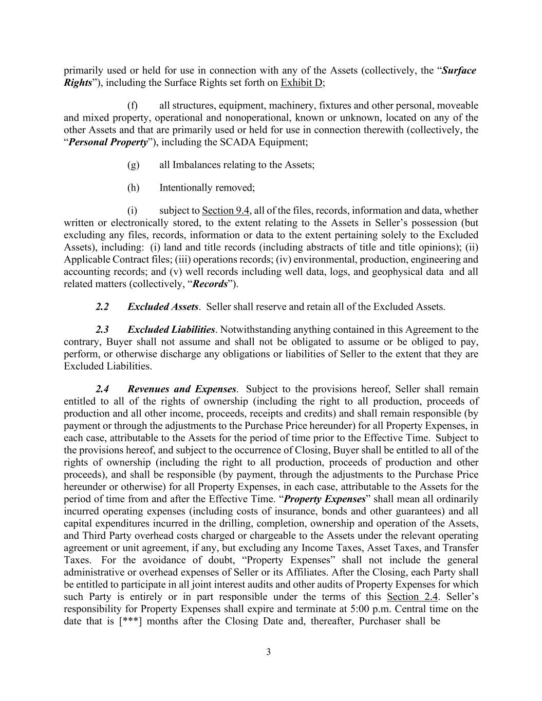 3 primarily used or held for use in connection with any of the Assets (collectively, the “Surface Rights”), including the Surface Rights set forth on Exhibit D; (f) all structures, equipment, machinery, fixtures and other personal, moveable and mixed property, operational and nonoperational, known or unknown, located on any of the other Assets and that are primarily used or held for use in connection therewith (collectively, the “Personal Property”), including the SCADA Equipment; (g) all Imbalances relating to the Assets; (h) Intentionally removed; (i) subject to Section 9.4, all of the files, records, information and data, whether written or electronically stored, to the extent relating to the Assets in Seller’s possession (but excluding any files, records, information or data to the extent pertaining solely to the Excluded Assets), including: (i) land and title records (including abstracts of title and title opinions); (ii) Applicable Contract files; (iii) operations records; (iv) environmental, production, engineering and accounting records; and (v) well records including well data, logs, and geophysical data and all related matters (collectively, “Records”). 2.2 Excluded Assets. Seller shall reserve and retain all of the Excluded Assets. 2.3 Excluded Liabilities. Notwithstanding anything contained in this Agreement to the contrary, Buyer shall not assume and shall not be obligated to assume or be obliged to pay, perform, or otherwise discharge any obligations or liabilities of Seller to the extent that they are Excluded Liabilities. 2.4 Revenues and Expenses. Subject to the provisions hereof, Seller shall remain entitled to all of the rights of ownership (including the right to all production, proceeds of production and all other income, proceeds, receipts and credits) and shall remain responsible (by payment or through the adjustments to the Purchase Price hereunder) for all Property Expenses, in each case, attributable to the Assets for the period of time prior to the Effective Time. Subject to the provisions hereof, and subject to the occurrence of Closing, Buyer shall be entitled to all of the rights of ownership (including the right to all production, proceeds of production and other proceeds), and shall be responsible (by payment, through the adjustments to the Purchase Price hereunder or otherwise) for all Property Expenses, in each case, attributable to the Assets for the period of time from and after the Effective Time. “Property Expenses” shall mean all ordinarily incurred operating expenses (including costs of insurance, bonds and other guarantees) and all capital expenditures incurred in the drilling, completion, ownership and operation of the Assets, and Third Party overhead costs charged or chargeable to the Assets under the relevant operating agreement or unit agreement, if any, but excluding any Income Taxes, Asset Taxes, and Transfer Taxes. For the avoidance of doubt, “Property Expenses” shall not include the general administrative or overhead expenses of Seller or its Affiliates. After the Closing, each Party shall be entitled to participate in all joint interest audits and other audits of Property Expenses for which such Party is entirely or in part responsible under the terms of this Section 2.4. Seller’s responsibility for Property Expenses shall expire and terminate at 5:00 p.m. Central time on the date that is [***] months after the Closing Date and, thereafter, Purchaser shall be