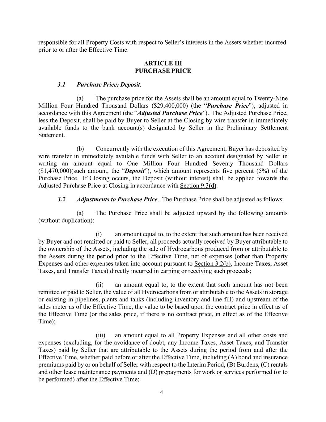 4 responsible for all Property Costs with respect to Seller’s interests in the Assets whether incurred prior to or after the Effective Time. ARTICLE III PURCHASE PRICE 3.1 Purchase Price; Deposit. (a) The purchase price for the Assets shall be an amount equal to Twenty-Nine Million Four Hundred Thousand Dollars ($29,400,000) (the “Purchase Price”), adjusted in accordance with this Agreement (the “Adjusted Purchase Price”). The Adjusted Purchase Price, less the Deposit, shall be paid by Buyer to Seller at the Closing by wire transfer in immediately available funds to the bank account(s) designated by Seller in the Preliminary Settlement Statement. (b) Concurrently with the execution of this Agreement, Buyer has deposited by wire transfer in immediately available funds with Seller to an account designated by Seller in writing an amount equal to One Million Four Hundred Seventy Thousand Dollars ($1,470,000)(such amount, the “Deposit”), which amount represents five percent (5%) of the Purchase Price. If Closing occurs, the Deposit (without interest) shall be applied towards the Adjusted Purchase Price at Closing in accordance with Section 9.3(d). 3.2 Adjustments to Purchase Price. The Purchase Price shall be adjusted as follows: (a) The Purchase Price shall be adjusted upward by the following amounts (without duplication): (i) an amount equal to, to the extent that such amount has been received by Buyer and not remitted or paid to Seller, all proceeds actually received by Buyer attributable to the ownership of the Assets, including the sale of Hydrocarbons produced from or attributable to the Assets during the period prior to the Effective Time, net of expenses (other than Property Expenses and other expenses taken into account pursuant to Section 3.2(b), Income Taxes, Asset Taxes, and Transfer Taxes) directly incurred in earning or receiving such proceeds; (ii) an amount equal to, to the extent that such amount has not been remitted or paid to Seller, the value of all Hydrocarbons from or attributable to the Assets in storage or existing in pipelines, plants and tanks (including inventory and line fill) and upstream of the sales meter as of the Effective Time, the value to be based upon the contract price in effect as of the Effective Time (or the sales price, if there is no contract price, in effect as of the Effective Time); (iii) an amount equal to all Property Expenses and all other costs and expenses (excluding, for the avoidance of doubt, any Income Taxes, Asset Taxes, and Transfer Taxes) paid by Seller that are attributable to the Assets during the period from and after the Effective Time, whether paid before or after the Effective Time, including (A) bond and insurance premiums paid by or on behalf of Seller with respect to the Interim Period, (B) Burdens, (C) rentals and other lease maintenance payments and (D) prepayments for work or services performed (or to be performed) after the Effective Time;