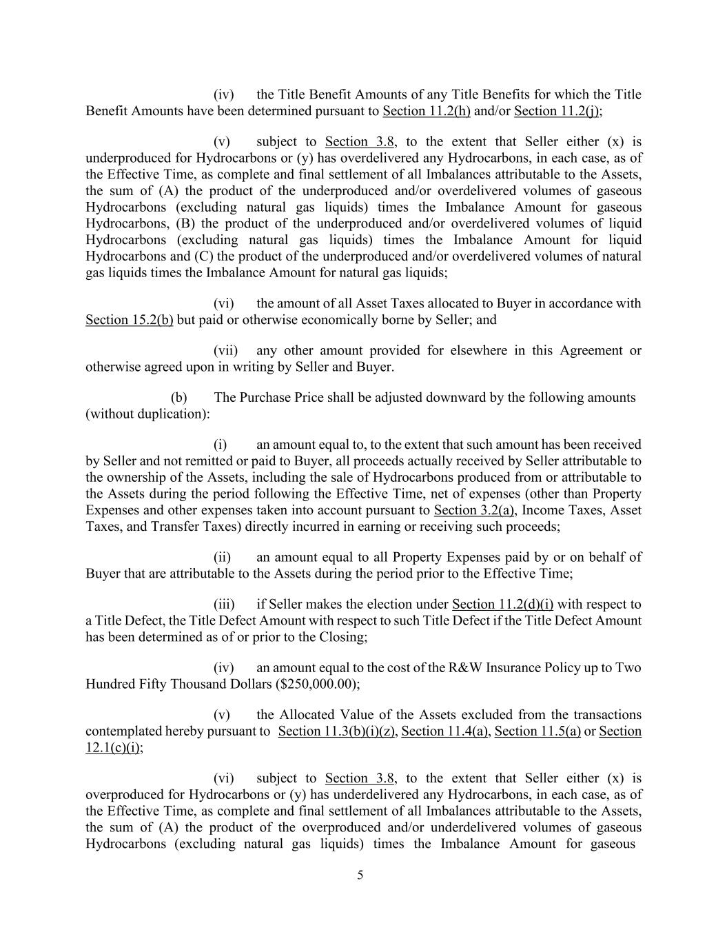 5 (iv) the Title Benefit Amounts of any Title Benefits for which the Title Benefit Amounts have been determined pursuant to Section 11.2(h) and/or Section 11.2(j); (v) subject to Section 3.8, to the extent that Seller either (x) is underproduced for Hydrocarbons or (y) has overdelivered any Hydrocarbons, in each case, as of the Effective Time, as complete and final settlement of all Imbalances attributable to the Assets, the sum of (A) the product of the underproduced and/or overdelivered volumes of gaseous Hydrocarbons (excluding natural gas liquids) times the Imbalance Amount for gaseous Hydrocarbons, (B) the product of the underproduced and/or overdelivered volumes of liquid Hydrocarbons (excluding natural gas liquids) times the Imbalance Amount for liquid Hydrocarbons and (C) the product of the underproduced and/or overdelivered volumes of natural gas liquids times the Imbalance Amount for natural gas liquids; (vi) the amount of all Asset Taxes allocated to Buyer in accordance with Section 15.2(b) but paid or otherwise economically borne by Seller; and (vii) any other amount provided for elsewhere in this Agreement or otherwise agreed upon in writing by Seller and Buyer. (b) The Purchase Price shall be adjusted downward by the following amounts (without duplication): (i) an amount equal to, to the extent that such amount has been received by Seller and not remitted or paid to Buyer, all proceeds actually received by Seller attributable to the ownership of the Assets, including the sale of Hydrocarbons produced from or attributable to the Assets during the period following the Effective Time, net of expenses (other than Property Expenses and other expenses taken into account pursuant to Section 3.2(a), Income Taxes, Asset Taxes, and Transfer Taxes) directly incurred in earning or receiving such proceeds; (ii) an amount equal to all Property Expenses paid by or on behalf of Buyer that are attributable to the Assets during the period prior to the Effective Time; (iii) if Seller makes the election under Section 11.2(d)(i) with respect to a Title Defect, the Title Defect Amount with respect to such Title Defect if the Title Defect Amount has been determined as of or prior to the Closing; (iv) an amount equal to the cost of the R&W Insurance Policy up to Two Hundred Fifty Thousand Dollars ($250,000.00); (v) the Allocated Value of the Assets excluded from the transactions contemplated hereby pursuant to Section 11.3(b)(i)(z), Section 11.4(a), Section 11.5(a) or Section 12.1(c)(i); (vi) subject to Section 3.8, to the extent that Seller either (x) is overproduced for Hydrocarbons or (y) has underdelivered any Hydrocarbons, in each case, as of the Effective Time, as complete and final settlement of all Imbalances attributable to the Assets, the sum of (A) the product of the overproduced and/or underdelivered volumes of gaseous Hydrocarbons (excluding natural gas liquids) times the Imbalance Amount for gaseous
