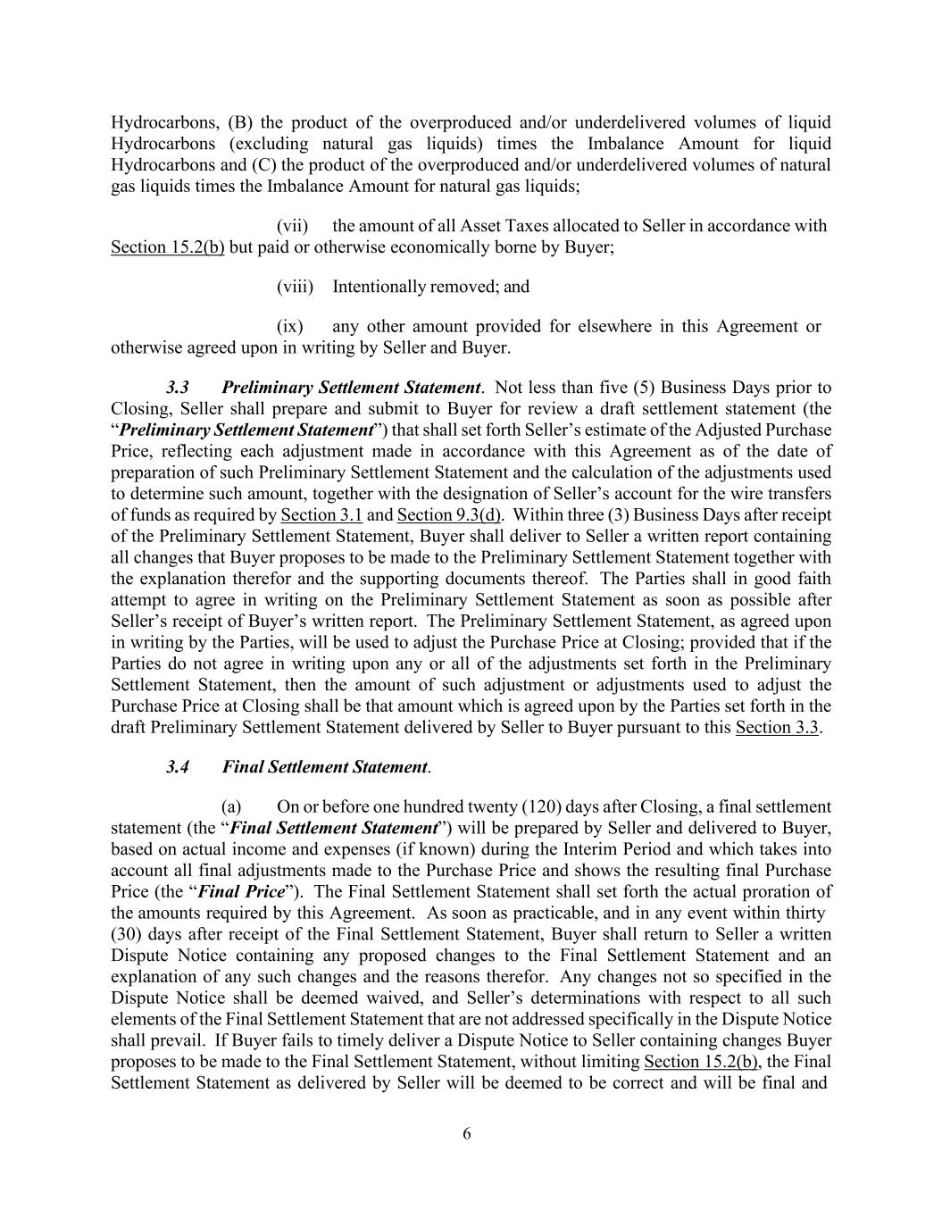 6 Hydrocarbons, (B) the product of the overproduced and/or underdelivered volumes of liquid Hydrocarbons (excluding natural gas liquids) times the Imbalance Amount for liquid Hydrocarbons and (C) the product of the overproduced and/or underdelivered volumes of natural gas liquids times the Imbalance Amount for natural gas liquids; (vii) the amount of all Asset Taxes allocated to Seller in accordance with Section 15.2(b) but paid or otherwise economically borne by Buyer; (viii) Intentionally removed; and (ix) any other amount provided for elsewhere in this Agreement or otherwise agreed upon in writing by Seller and Buyer. 3.3 Preliminary Settlement Statement. Not less than five (5) Business Days prior to Closing, Seller shall prepare and submit to Buyer for review a draft settlement statement (the “Preliminary Settlement Statement”) that shall set forth Seller’s estimate of the Adjusted Purchase Price, reflecting each adjustment made in accordance with this Agreement as of the date of preparation of such Preliminary Settlement Statement and the calculation of the adjustments used to determine such amount, together with the designation of Seller’s account for the wire transfers of funds as required by Section 3.1 and Section 9.3(d). Within three (3) Business Days after receipt of the Preliminary Settlement Statement, Buyer shall deliver to Seller a written report containing all changes that Buyer proposes to be made to the Preliminary Settlement Statement together with the explanation therefor and the supporting documents thereof. The Parties shall in good faith attempt to agree in writing on the Preliminary Settlement Statement as soon as possible after Seller’s receipt of Buyer’s written report. The Preliminary Settlement Statement, as agreed upon in writing by the Parties, will be used to adjust the Purchase Price at Closing; provided that if the Parties do not agree in writing upon any or all of the adjustments set forth in the Preliminary Settlement Statement, then the amount of such adjustment or adjustments used to adjust the Purchase Price at Closing shall be that amount which is agreed upon by the Parties set forth in the draft Preliminary Settlement Statement delivered by Seller to Buyer pursuant to this Section 3.3. 3.4 Final Settlement Statement. (a) On or before one hundred twenty (120) days after Closing, a final settlement statement (the “Final Settlement Statement”) will be prepared by Seller and delivered to Buyer, based on actual income and expenses (if known) during the Interim Period and which takes into account all final adjustments made to the Purchase Price and shows the resulting final Purchase Price (the “Final Price”). The Final Settlement Statement shall set forth the actual proration of the amounts required by this Agreement. As soon as practicable, and in any event within thirty (30) days after receipt of the Final Settlement Statement, Buyer shall return to Seller a written Dispute Notice containing any proposed changes to the Final Settlement Statement and an explanation of any such changes and the reasons therefor. Any changes not so specified in the Dispute Notice shall be deemed waived, and Seller’s determinations with respect to all such elements of the Final Settlement Statement that are not addressed specifically in the Dispute Notice shall prevail. If Buyer fails to timely deliver a Dispute Notice to Seller containing changes Buyer proposes to be made to the Final Settlement Statement, without limiting Section 15.2(b), the Final Settlement Statement as delivered by Seller will be deemed to be correct and will be final and