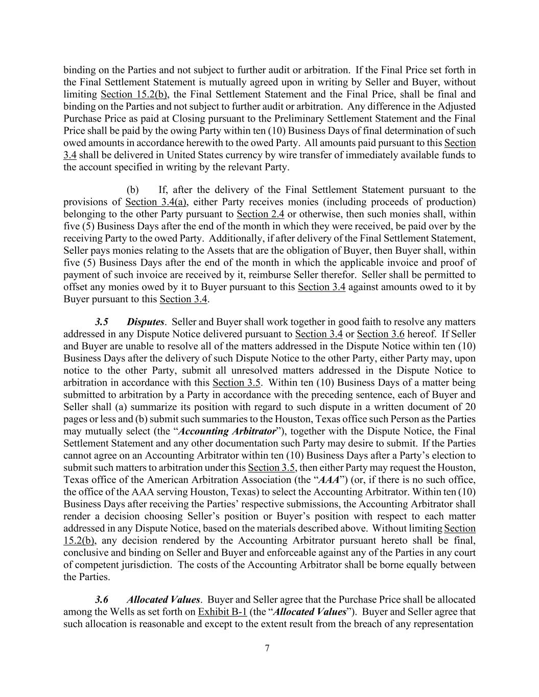 7 binding on the Parties and not subject to further audit or arbitration. If the Final Price set forth in the Final Settlement Statement is mutually agreed upon in writing by Seller and Buyer, without limiting Section 15.2(b), the Final Settlement Statement and the Final Price, shall be final and binding on the Parties and not subject to further audit or arbitration. Any difference in the Adjusted Purchase Price as paid at Closing pursuant to the Preliminary Settlement Statement and the Final Price shall be paid by the owing Party within ten (10) Business Days of final determination of such owed amounts in accordance herewith to the owed Party. All amounts paid pursuant to this Section 3.4 shall be delivered in United States currency by wire transfer of immediately available funds to the account specified in writing by the relevant Party. (b) If, after the delivery of the Final Settlement Statement pursuant to the provisions of Section 3.4(a), either Party receives monies (including proceeds of production) belonging to the other Party pursuant to Section 2.4 or otherwise, then such monies shall, within five (5) Business Days after the end of the month in which they were received, be paid over by the receiving Party to the owed Party. Additionally, if after delivery of the Final Settlement Statement, Seller pays monies relating to the Assets that are the obligation of Buyer, then Buyer shall, within five (5) Business Days after the end of the month in which the applicable invoice and proof of payment of such invoice are received by it, reimburse Seller therefor. Seller shall be permitted to offset any monies owed by it to Buyer pursuant to this Section 3.4 against amounts owed to it by Buyer pursuant to this Section 3.4. 3.5 Disputes. Seller and Buyer shall work together in good faith to resolve any matters addressed in any Dispute Notice delivered pursuant to Section 3.4 or Section 3.6 hereof. If Seller and Buyer are unable to resolve all of the matters addressed in the Dispute Notice within ten (10) Business Days after the delivery of such Dispute Notice to the other Party, either Party may, upon notice to the other Party, submit all unresolved matters addressed in the Dispute Notice to arbitration in accordance with this Section 3.5. Within ten (10) Business Days of a matter being submitted to arbitration by a Party in accordance with the preceding sentence, each of Buyer and Seller shall (a) summarize its position with regard to such dispute in a written document of 20 pages or less and (b) submit such summaries to the Houston, Texas office such Person as the Parties may mutually select (the “Accounting Arbitrator”), together with the Dispute Notice, the Final Settlement Statement and any other documentation such Party may desire to submit. If the Parties cannot agree on an Accounting Arbitrator within ten (10) Business Days after a Party’s election to submit such matters to arbitration under this Section 3.5, then either Party may request the Houston, Texas office of the American Arbitration Association (the “AAA”) (or, if there is no such office, the office of the AAA serving Houston, Texas) to select the Accounting Arbitrator. Within ten (10) Business Days after receiving the Parties’ respective submissions, the Accounting Arbitrator shall render a decision choosing Seller’s position or Buyer’s position with respect to each matter addressed in any Dispute Notice, based on the materials described above. Without limiting Section 15.2(b), any decision rendered by the Accounting Arbitrator pursuant hereto shall be final, conclusive and binding on Seller and Buyer and enforceable against any of the Parties in any court of competent jurisdiction. The costs of the Accounting Arbitrator shall be borne equally between the Parties. 3.6 Allocated Values. Buyer and Seller agree that the Purchase Price shall be allocated among the Wells as set forth on Exhibit B-1 (the “Allocated Values”). Buyer and Seller agree that such allocation is reasonable and except to the extent result from the breach of any representation
