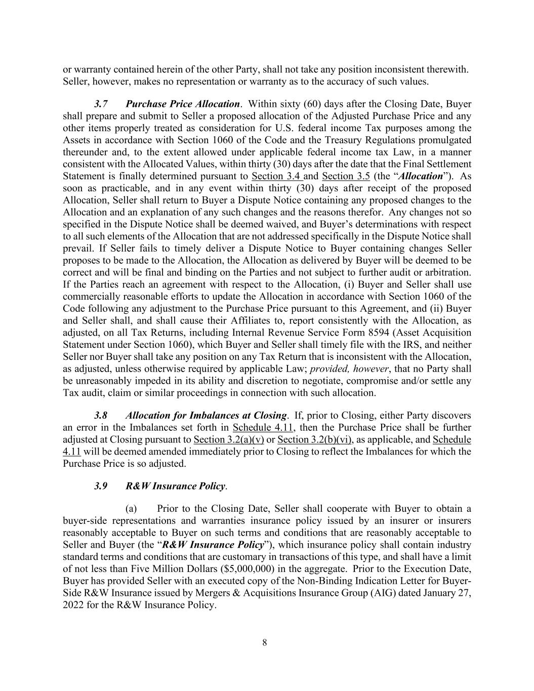 8 or warranty contained herein of the other Party, shall not take any position inconsistent therewith. Seller, however, makes no representation or warranty as to the accuracy of such values. 3.7 Purchase Price Allocation. Within sixty (60) days after the Closing Date, Buyer shall prepare and submit to Seller a proposed allocation of the Adjusted Purchase Price and any other items properly treated as consideration for U.S. federal income Tax purposes among the Assets in accordance with Section 1060 of the Code and the Treasury Regulations promulgated thereunder and, to the extent allowed under applicable federal income tax Law, in a manner consistent with the Allocated Values, within thirty (30) days after the date that the Final Settlement Statement is finally determined pursuant to Section 3.4 and Section 3.5 (the “Allocation”). As soon as practicable, and in any event within thirty (30) days after receipt of the proposed Allocation, Seller shall return to Buyer a Dispute Notice containing any proposed changes to the Allocation and an explanation of any such changes and the reasons therefor. Any changes not so specified in the Dispute Notice shall be deemed waived, and Buyer’s determinations with respect to all such elements of the Allocation that are not addressed specifically in the Dispute Notice shall prevail. If Seller fails to timely deliver a Dispute Notice to Buyer containing changes Seller proposes to be made to the Allocation, the Allocation as delivered by Buyer will be deemed to be correct and will be final and binding on the Parties and not subject to further audit or arbitration. If the Parties reach an agreement with respect to the Allocation, (i) Buyer and Seller shall use commercially reasonable efforts to update the Allocation in accordance with Section 1060 of the Code following any adjustment to the Purchase Price pursuant to this Agreement, and (ii) Buyer and Seller shall, and shall cause their Affiliates to, report consistently with the Allocation, as adjusted, on all Tax Returns, including Internal Revenue Service Form 8594 (Asset Acquisition Statement under Section 1060), which Buyer and Seller shall timely file with the IRS, and neither Seller nor Buyer shall take any position on any Tax Return that is inconsistent with the Allocation, as adjusted, unless otherwise required by applicable Law; provided, however, that no Party shall be unreasonably impeded in its ability and discretion to negotiate, compromise and/or settle any Tax audit, claim or similar proceedings in connection with such allocation. 3.8 Allocation for Imbalances at Closing. If, prior to Closing, either Party discovers an error in the Imbalances set forth in Schedule 4.11, then the Purchase Price shall be further adjusted at Closing pursuant to Section 3.2(a)(v) or Section 3.2(b)(vi), as applicable, and Schedule 4.11 will be deemed amended immediately prior to Closing to reflect the Imbalances for which the Purchase Price is so adjusted. 3.9 R&W Insurance Policy. (a) Prior to the Closing Date, Seller shall cooperate with Buyer to obtain a buyer-side representations and warranties insurance policy issued by an insurer or insurers reasonably acceptable to Buyer on such terms and conditions that are reasonably acceptable to Seller and Buyer (the “R&W Insurance Policy”), which insurance policy shall contain industry standard terms and conditions that are customary in transactions of this type, and shall have a limit of not less than Five Million Dollars ($5,000,000) in the aggregate. Prior to the Execution Date, Buyer has provided Seller with an executed copy of the Non-Binding Indication Letter for Buyer- Side R&W Insurance issued by Mergers & Acquisitions Insurance Group (AIG) dated January 27, 2022 for the R&W Insurance Policy.