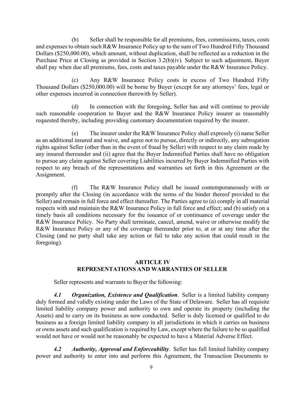 9 (b) Seller shall be responsible for all premiums, fees, commissions, taxes, costs and expenses to obtain such R&W Insurance Policy up to the sum of Two Hundred Fifty Thousand Dollars ($250,000.00), which amount, without duplication, shall be reflected as a reduction in the Purchase Price at Closing as provided in Section 3.2(b)(iv). Subject to such adjustment, Buyer shall pay when due all premiums, fees, costs and taxes payable under the R&W Insurance Policy. (c) Any R&W Insurance Policy costs in excess of Two Hundred Fifty Thousand Dollars ($250,000.00) will be borne by Buyer (except for any attorneys’ fees, legal or other expenses incurred in connection therewith by Seller). (d) In connection with the foregoing, Seller has and will continue to provide such reasonable cooperation to Buyer and the R&W Insurance Policy insurer as reasonably requested thereby, including providing customary documentation required by the insurer. (e) The insurer under the R&W Insurance Policy shall expressly (i) name Seller as an additional insured and waive, and agree not to pursue, directly or indirectly, any subrogation rights against Seller (other than in the event of fraud by Seller) with respect to any claim made by any insured thereunder and (ii) agree that the Buyer Indemnified Parties shall have no obligation to pursue any claim against Seller covering Liabilities incurred by Buyer Indemnified Parties with respect to any breach of the representations and warranties set forth in this Agreement or the Assignment. (f) The R&W Insurance Policy shall be issued contemporaneously with or promptly after the Closing (in accordance with the terms of the binder thereof provided to the Seller) and remain in full force and effect thereafter. The Parties agree to (a) comply in all material respects with and maintain the R&W Insurance Policy in full force and effect; and (b) satisfy on a timely basis all conditions necessary for the issuance of or continuance of coverage under the R&W Insurance Policy. No Party shall terminate, cancel, amend, waive or otherwise modify the R&W Insurance Policy or any of the coverage thereunder prior to, at or at any time after the Closing (and no party shall take any action or fail to take any action that could result in the foregoing). ARTICLE IV REPRESENTATIONS AND WARRANTIES OF SELLER Seller represents and warrants to Buyer the following: 4.1 Organization, Existence and Qualification. Seller is a limited liability company duly formed and validly existing under the Laws of the State of Delaware. Seller has all requisite limited liability company power and authority to own and operate its property (including the Assets) and to carry on its business as now conducted. Seller is duly licensed or qualified to do business as a foreign limited liability company in all jurisdictions in which it carries on business or owns assets and such qualification is required by Law, except where the failure to be so qualified would not have or would not be reasonably be expected to have a Material Adverse Effect. 4.2 Authority, Approval and Enforceability. Seller has full limited liability company power and authority to enter into and perform this Agreement, the Transaction Documents to