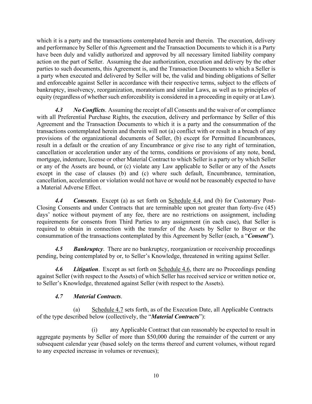 10 which it is a party and the transactions contemplated herein and therein. The execution, delivery and performance by Seller of this Agreement and the Transaction Documents to which it is a Party have been duly and validly authorized and approved by all necessary limited liability company action on the part of Seller. Assuming the due authorization, execution and delivery by the other parties to such documents, this Agreement is, and the Transaction Documents to which a Seller is a party when executed and delivered by Seller will be, the valid and binding obligations of Seller and enforceable against Seller in accordance with their respective terms, subject to the effects of bankruptcy, insolvency, reorganization, moratorium and similar Laws, as well as to principles of equity (regardless of whether such enforceability is considered in a proceeding in equity or at Law). 4.3 No Conflicts. Assuming the receipt of all Consents and the waiver of or compliance with all Preferential Purchase Rights, the execution, delivery and performance by Seller of this Agreement and the Transaction Documents to which it is a party and the consummation of the transactions contemplated herein and therein will not (a) conflict with or result in a breach of any provisions of the organizational documents of Seller, (b) except for Permitted Encumbrances, result in a default or the creation of any Encumbrance or give rise to any right of termination, cancellation or acceleration under any of the terms, conditions or provisions of any note, bond, mortgage, indenture, license or other Material Contract to which Seller is a party or by which Seller or any of the Assets are bound, or (c) violate any Law applicable to Seller or any of the Assets except in the case of clauses (b) and (c) where such default, Encumbrance, termination, cancellation, acceleration or violation would not have or would not be reasonably expected to have a Material Adverse Effect. 4.4 Consents. Except (a) as set forth on Schedule 4.4, and (b) for Customary Post- Closing Consents and under Contracts that are terminable upon not greater than forty-five (45) days’ notice without payment of any fee, there are no restrictions on assignment, including requirements for consents from Third Parties to any assignment (in each case), that Seller is required to obtain in connection with the transfer of the Assets by Seller to Buyer or the consummation of the transactions contemplated by this Agreement by Seller (each, a “Consent”). 4.5 Bankruptcy. There are no bankruptcy, reorganization or receivership proceedings pending, being contemplated by or, to Seller’s Knowledge, threatened in writing against Seller. 4.6 Litigation. Except as set forth on Schedule 4.6, there are no Proceedings pending against Seller (with respect to the Assets) of which Seller has received service or written notice or, to Seller’s Knowledge, threatened against Seller (with respect to the Assets). 4.7 Material Contracts. (a) Schedule 4.7 sets forth, as of the Execution Date, all Applicable Contracts of the type described below (collectively, the “Material Contracts”): (i) any Applicable Contract that can reasonably be expected to result in aggregate payments by Seller of more than $50,000 during the remainder of the current or any subsequent calendar year (based solely on the terms thereof and current volumes, without regard to any expected increase in volumes or revenues);
