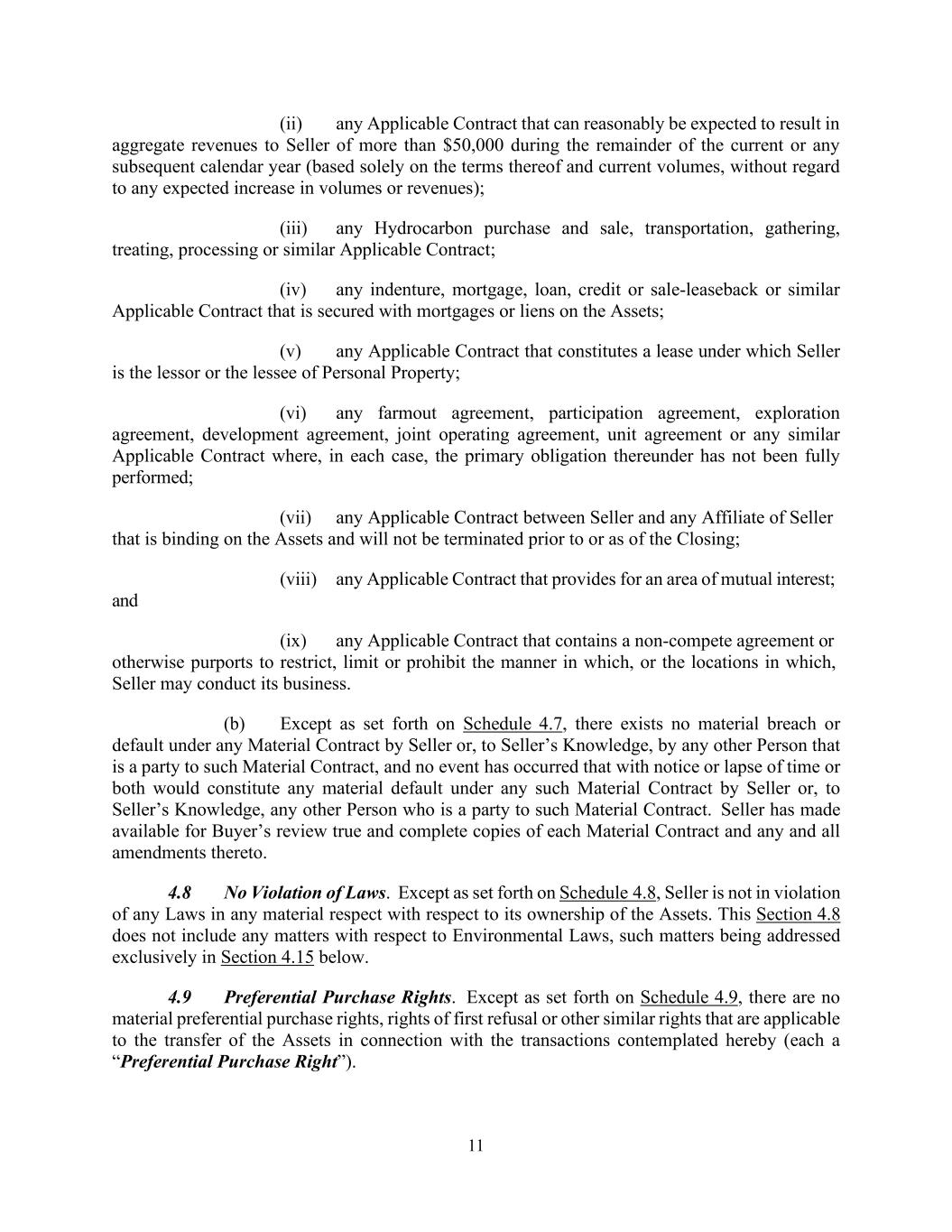 11 (ii) any Applicable Contract that can reasonably be expected to result in aggregate revenues to Seller of more than $50,000 during the remainder of the current or any subsequent calendar year (based solely on the terms thereof and current volumes, without regard to any expected increase in volumes or revenues); (iii) any Hydrocarbon purchase and sale, transportation, gathering, treating, processing or similar Applicable Contract; (iv) any indenture, mortgage, loan, credit or sale-leaseback or similar Applicable Contract that is secured with mortgages or liens on the Assets; (v) any Applicable Contract that constitutes a lease under which Seller is the lessor or the lessee of Personal Property; (vi) any farmout agreement, participation agreement, exploration agreement, development agreement, joint operating agreement, unit agreement or any similar Applicable Contract where, in each case, the primary obligation thereunder has not been fully performed; (vii) any Applicable Contract between Seller and any Affiliate of Seller that is binding on the Assets and will not be terminated prior to or as of the Closing; (viii) any Applicable Contract that provides for an area of mutual interest; and (ix) any Applicable Contract that contains a non-compete agreement or otherwise purports to restrict, limit or prohibit the manner in which, or the locations in which, Seller may conduct its business. (b) Except as set forth on Schedule 4.7, there exists no material breach or default under any Material Contract by Seller or, to Seller’s Knowledge, by any other Person that is a party to such Material Contract, and no event has occurred that with notice or lapse of time or both would constitute any material default under any such Material Contract by Seller or, to Seller’s Knowledge, any other Person who is a party to such Material Contract. Seller has made available for Buyer’s review true and complete copies of each Material Contract and any and all amendments thereto. 4.8 No Violation of Laws. Except as set forth on Schedule 4.8, Seller is not in violation of any Laws in any material respect with respect to its ownership of the Assets. This Section 4.8 does not include any matters with respect to Environmental Laws, such matters being addressed exclusively in Section 4.15 below. 4.9 Preferential Purchase Rights. Except as set forth on Schedule 4.9, there are no material preferential purchase rights, rights of first refusal or other similar rights that are applicable to the transfer of the Assets in connection with the transactions contemplated hereby (each a “Preferential Purchase Right”).