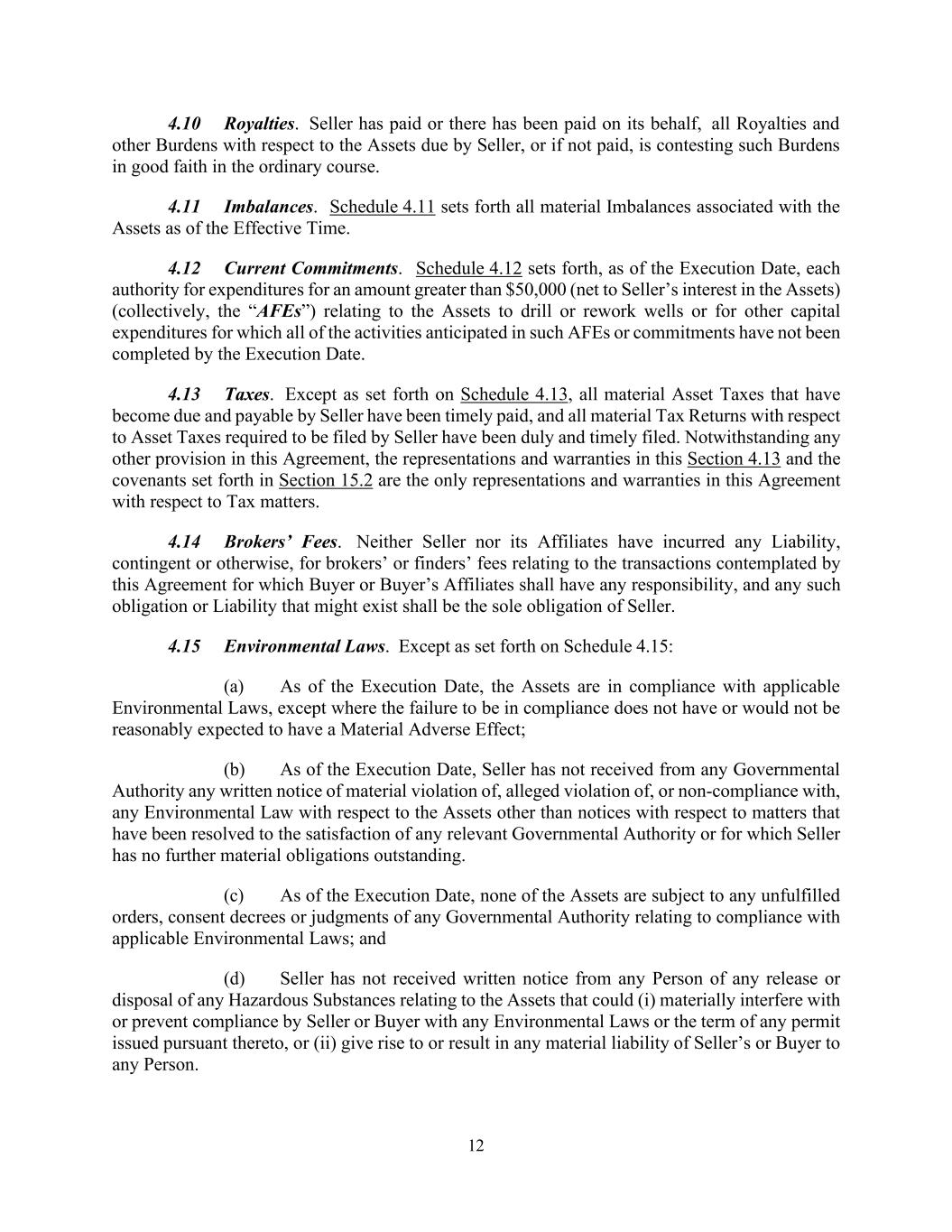 12 4.10 Royalties. Seller has paid or there has been paid on its behalf, all Royalties and other Burdens with respect to the Assets due by Seller, or if not paid, is contesting such Burdens in good faith in the ordinary course. 4.11 Imbalances. Schedule 4.11 sets forth all material Imbalances associated with the Assets as of the Effective Time. 4.12 Current Commitments. Schedule 4.12 sets forth, as of the Execution Date, each authority for expenditures for an amount greater than $50,000 (net to Seller’s interest in the Assets) (collectively, the “AFEs”) relating to the Assets to drill or rework wells or for other capital expenditures for which all of the activities anticipated in such AFEs or commitments have not been completed by the Execution Date. 4.13 Taxes. Except as set forth on Schedule 4.13, all material Asset Taxes that have become due and payable by Seller have been timely paid, and all material Tax Returns with respect to Asset Taxes required to be filed by Seller have been duly and timely filed. Notwithstanding any other provision in this Agreement, the representations and warranties in this Section 4.13 and the covenants set forth in Section 15.2 are the only representations and warranties in this Agreement with respect to Tax matters. 4.14 Brokers’ Fees. Neither Seller nor its Affiliates have incurred any Liability, contingent or otherwise, for brokers’ or finders’ fees relating to the transactions contemplated by this Agreement for which Buyer or Buyer’s Affiliates shall have any responsibility, and any such obligation or Liability that might exist shall be the sole obligation of Seller. 4.15 Environmental Laws. Except as set forth on Schedule 4.15: (a) As of the Execution Date, the Assets are in compliance with applicable Environmental Laws, except where the failure to be in compliance does not have or would not be reasonably expected to have a Material Adverse Effect; (b) As of the Execution Date, Seller has not received from any Governmental Authority any written notice of material violation of, alleged violation of, or non-compliance with, any Environmental Law with respect to the Assets other than notices with respect to matters that have been resolved to the satisfaction of any relevant Governmental Authority or for which Seller has no further material obligations outstanding. (c) As of the Execution Date, none of the Assets are subject to any unfulfilled orders, consent decrees or judgments of any Governmental Authority relating to compliance with applicable Environmental Laws; and (d) Seller has not received written notice from any Person of any release or disposal of any Hazardous Substances relating to the Assets that could (i) materially interfere with or prevent compliance by Seller or Buyer with any Environmental Laws or the term of any permit issued pursuant thereto, or (ii) give rise to or result in any material liability of Seller’s or Buyer to any Person.