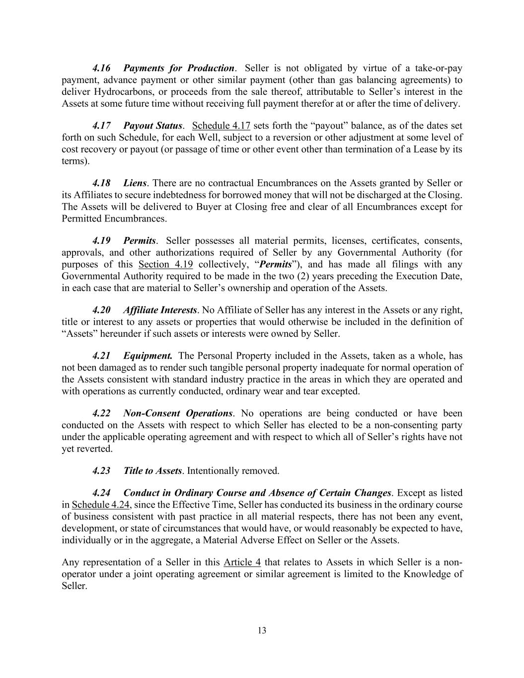 13 4.16 Payments for Production. Seller is not obligated by virtue of a take-or-pay payment, advance payment or other similar payment (other than gas balancing agreements) to deliver Hydrocarbons, or proceeds from the sale thereof, attributable to Seller’s interest in the Assets at some future time without receiving full payment therefor at or after the time of delivery. 4.17 Payout Status. Schedule 4.17 sets forth the “payout” balance, as of the dates set forth on such Schedule, for each Well, subject to a reversion or other adjustment at some level of cost recovery or payout (or passage of time or other event other than termination of a Lease by its terms). 4.18 Liens. There are no contractual Encumbrances on the Assets granted by Seller or its Affiliates to secure indebtedness for borrowed money that will not be discharged at the Closing. The Assets will be delivered to Buyer at Closing free and clear of all Encumbrances except for Permitted Encumbrances. 4.19 Permits. Seller possesses all material permits, licenses, certificates, consents, approvals, and other authorizations required of Seller by any Governmental Authority (for purposes of this Section 4.19 collectively, “Permits”), and has made all filings with any Governmental Authority required to be made in the two (2) years preceding the Execution Date, in each case that are material to Seller’s ownership and operation of the Assets. 4.20 Affiliate Interests. No Affiliate of Seller has any interest in the Assets or any right, title or interest to any assets or properties that would otherwise be included in the definition of “Assets” hereunder if such assets or interests were owned by Seller. 4.21 Equipment. The Personal Property included in the Assets, taken as a whole, has not been damaged as to render such tangible personal property inadequate for normal operation of the Assets consistent with standard industry practice in the areas in which they are operated and with operations as currently conducted, ordinary wear and tear excepted. 4.22 Non-Consent Operations. No operations are being conducted or have been conducted on the Assets with respect to which Seller has elected to be a non-consenting party under the applicable operating agreement and with respect to which all of Seller’s rights have not yet reverted. 4.23 Title to Assets. Intentionally removed. 4.24 Conduct in Ordinary Course and Absence of Certain Changes. Except as listed in Schedule 4.24, since the Effective Time, Seller has conducted its business in the ordinary course of business consistent with past practice in all material respects, there has not been any event, development, or state of circumstances that would have, or would reasonably be expected to have, individually or in the aggregate, a Material Adverse Effect on Seller or the Assets. Any representation of a Seller in this Article 4 that relates to Assets in which Seller is a non- operator under a joint operating agreement or similar agreement is limited to the Knowledge of Seller.
