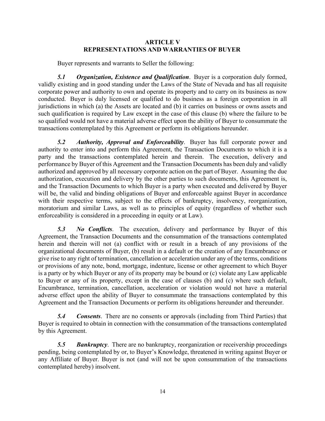 14 ARTICLE V REPRESENTATIONS AND WARRANTIES OF BUYER Buyer represents and warrants to Seller the following: 5.1 Organization, Existence and Qualification. Buyer is a corporation duly formed, validly existing and in good standing under the Laws of the State of Nevada and has all requisite corporate power and authority to own and operate its property and to carry on its business as now conducted. Buyer is duly licensed or qualified to do business as a foreign corporation in all jurisdictions in which (a) the Assets are located and (b) it carries on business or owns assets and such qualification is required by Law except in the case of this clause (b) where the failure to be so qualified would not have a material adverse effect upon the ability of Buyer to consummate the transactions contemplated by this Agreement or perform its obligations hereunder. 5.2 Authority, Approval and Enforceability. Buyer has full corporate power and authority to enter into and perform this Agreement, the Transaction Documents to which it is a party and the transactions contemplated herein and therein. The execution, delivery and performance by Buyer of this Agreement and the Transaction Documents has been duly and validly authorized and approved by all necessary corporate action on the part of Buyer. Assuming the due authorization, execution and delivery by the other parties to such documents, this Agreement is, and the Transaction Documents to which Buyer is a party when executed and delivered by Buyer will be, the valid and binding obligations of Buyer and enforceable against Buyer in accordance with their respective terms, subject to the effects of bankruptcy, insolvency, reorganization, moratorium and similar Laws, as well as to principles of equity (regardless of whether such enforceability is considered in a proceeding in equity or at Law). 5.3 No Conflicts. The execution, delivery and performance by Buyer of this Agreement, the Transaction Documents and the consummation of the transactions contemplated herein and therein will not (a) conflict with or result in a breach of any provisions of the organizational documents of Buyer, (b) result in a default or the creation of any Encumbrance or give rise to any right of termination, cancellation or acceleration under any of the terms, conditions or provisions of any note, bond, mortgage, indenture, license or other agreement to which Buyer is a party or by which Buyer or any of its property may be bound or (c) violate any Law applicable to Buyer or any of its property, except in the case of clauses (b) and (c) where such default, Encumbrance, termination, cancellation, acceleration or violation would not have a material adverse effect upon the ability of Buyer to consummate the transactions contemplated by this Agreement and the Transaction Documents or perform its obligations hereunder and thereunder. 5.4 Consents. There are no consents or approvals (including from Third Parties) that Buyer is required to obtain in connection with the consummation of the transactions contemplated by this Agreement. 5.5 Bankruptcy. There are no bankruptcy, reorganization or receivership proceedings pending, being contemplated by or, to Buyer’s Knowledge, threatened in writing against Buyer or any Affiliate of Buyer. Buyer is not (and will not be upon consummation of the transactions contemplated hereby) insolvent.