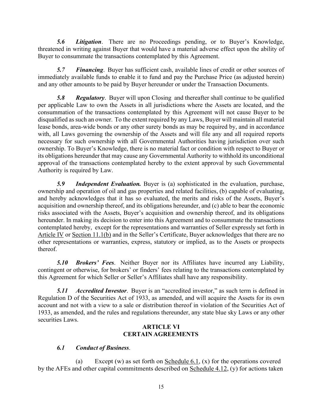15 5.6 Litigation. There are no Proceedings pending, or to Buyer’s Knowledge, threatened in writing against Buyer that would have a material adverse effect upon the ability of Buyer to consummate the transactions contemplated by this Agreement. 5.7 Financing. Buyer has sufficient cash, available lines of credit or other sources of immediately available funds to enable it to fund and pay the Purchase Price (as adjusted herein) and any other amounts to be paid by Buyer hereunder or under the Transaction Documents. 5.8 Regulatory. Buyer will upon Closing and thereafter shall continue to be qualified per applicable Law to own the Assets in all jurisdictions where the Assets are located, and the consummation of the transactions contemplated by this Agreement will not cause Buyer to be disqualified as such an owner. To the extent required by any Laws, Buyer will maintain all material lease bonds, area-wide bonds or any other surety bonds as may be required by, and in accordance with, all Laws governing the ownership of the Assets and will file any and all required reports necessary for such ownership with all Governmental Authorities having jurisdiction over such ownership. To Buyer’s Knowledge, there is no material fact or condition with respect to Buyer or its obligations hereunder that may cause any Governmental Authority to withhold its unconditional approval of the transactions contemplated hereby to the extent approval by such Governmental Authority is required by Law. 5.9 Independent Evaluation. Buyer is (a) sophisticated in the evaluation, purchase, ownership and operation of oil and gas properties and related facilities, (b) capable of evaluating, and hereby acknowledges that it has so evaluated, the merits and risks of the Assets, Buyer’s acquisition and ownership thereof, and its obligations hereunder, and (c) able to bear the economic risks associated with the Assets, Buyer’s acquisition and ownership thereof, and its obligations hereunder. In making its decision to enter into this Agreement and to consummate the transactions contemplated hereby, except for the representations and warranties of Seller expressly set forth in Article IV or Section 11.1(b) and in the Seller’s Certificate, Buyer acknowledges that there are no other representations or warranties, express, statutory or implied, as to the Assets or prospects thereof. 5.10 Brokers’ Fees. Neither Buyer nor its Affiliates have incurred any Liability, contingent or otherwise, for brokers’ or finders’ fees relating to the transactions contemplated by this Agreement for which Seller or Seller’s Affiliates shall have any responsibility. 5.11 Accredited Investor. Buyer is an “accredited investor,” as such term is defined in Regulation D of the Securities Act of 1933, as amended, and will acquire the Assets for its own account and not with a view to a sale or distribution thereof in violation of the Securities Act of 1933, as amended, and the rules and regulations thereunder, any state blue sky Laws or any other securities Laws. ARTICLE VI CERTAIN AGREEMENTS 6.1 Conduct of Business. (a) Except (w) as set forth on Schedule 6.1, (x) for the operations covered by the AFEs and other capital commitments described on Schedule 4.12, (y) for actions taken