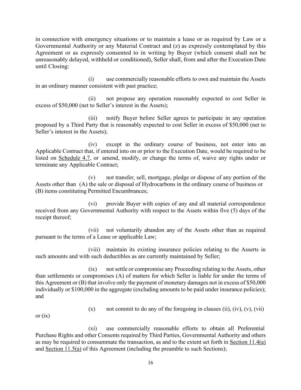 16 in connection with emergency situations or to maintain a lease or as required by Law or a Governmental Authority or any Material Contract and (z) as expressly contemplated by this Agreement or as expressly consented to in writing by Buyer (which consent shall not be unreasonably delayed, withheld or conditioned), Seller shall, from and after the Execution Date until Closing: (i) use commercially reasonable efforts to own and maintain the Assets in an ordinary manner consistent with past practice; (ii) not propose any operation reasonably expected to cost Seller in excess of $50,000 (net to Seller’s interest in the Assets); (iii) notify Buyer before Seller agrees to participate in any operation proposed by a Third Party that is reasonably expected to cost Seller in excess of $50,000 (net to Seller’s interest in the Assets); (iv) except in the ordinary course of business, not enter into an Applicable Contract that, if entered into on or prior to the Execution Date, would be required to be listed on Schedule 4.7, or amend, modify, or change the terms of, waive any rights under or terminate any Applicable Contract; (v) not transfer, sell, mortgage, pledge or dispose of any portion of the Assets other than (A) the sale or disposal of Hydrocarbons in the ordinary course of business or (B) items constituting Permitted Encumbrances; (vi) provide Buyer with copies of any and all material correspondence received from any Governmental Authority with respect to the Assets within five (5) days of the receipt thereof; (vii) not voluntarily abandon any of the Assets other than as required pursuant to the terms of a Lease or applicable Law; (viii) maintain its existing insurance policies relating to the Asserts in such amounts and with such deductibles as are currently maintained by Seller; (ix) not settle or compromise any Proceeding relating to the Assets, other than settlements or compromises (A) of matters for which Seller is liable for under the terms of this Agreement or (B) that involve only the payment of monetary damages not in excess of $50,000 individually or $100,000 in the aggregate (excluding amounts to be paid under insurance policies); and or (ix) (x) not commit to do any of the foregoing in clauses (ii), (iv), (v), (vii) (xi) use commercially reasonable efforts to obtain all Preferential Purchase Rights and other Consents required by Third Parties, Governmental Authority and others as may be required to consummate the transaction, as and to the extent set forth in Section 11.4(a) and Section 11.5(a) of this Agreement (including the preamble to such Sections);